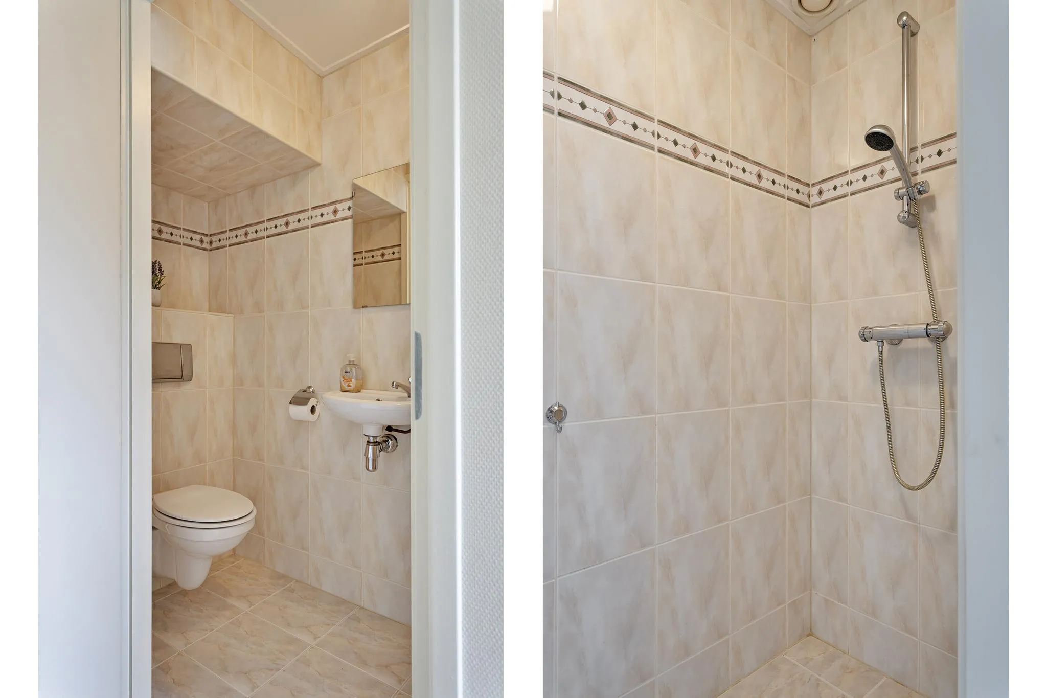 1e verdieping: Overloop met vaste kast, slaapkamer (2), extra grote slaapkamer (3) met vaste kast, deze kamer is prima op te delen om een (4e) slaapkamer te realiseren, badkamer voorzien van douche, wastafelmeubel en toilet.
