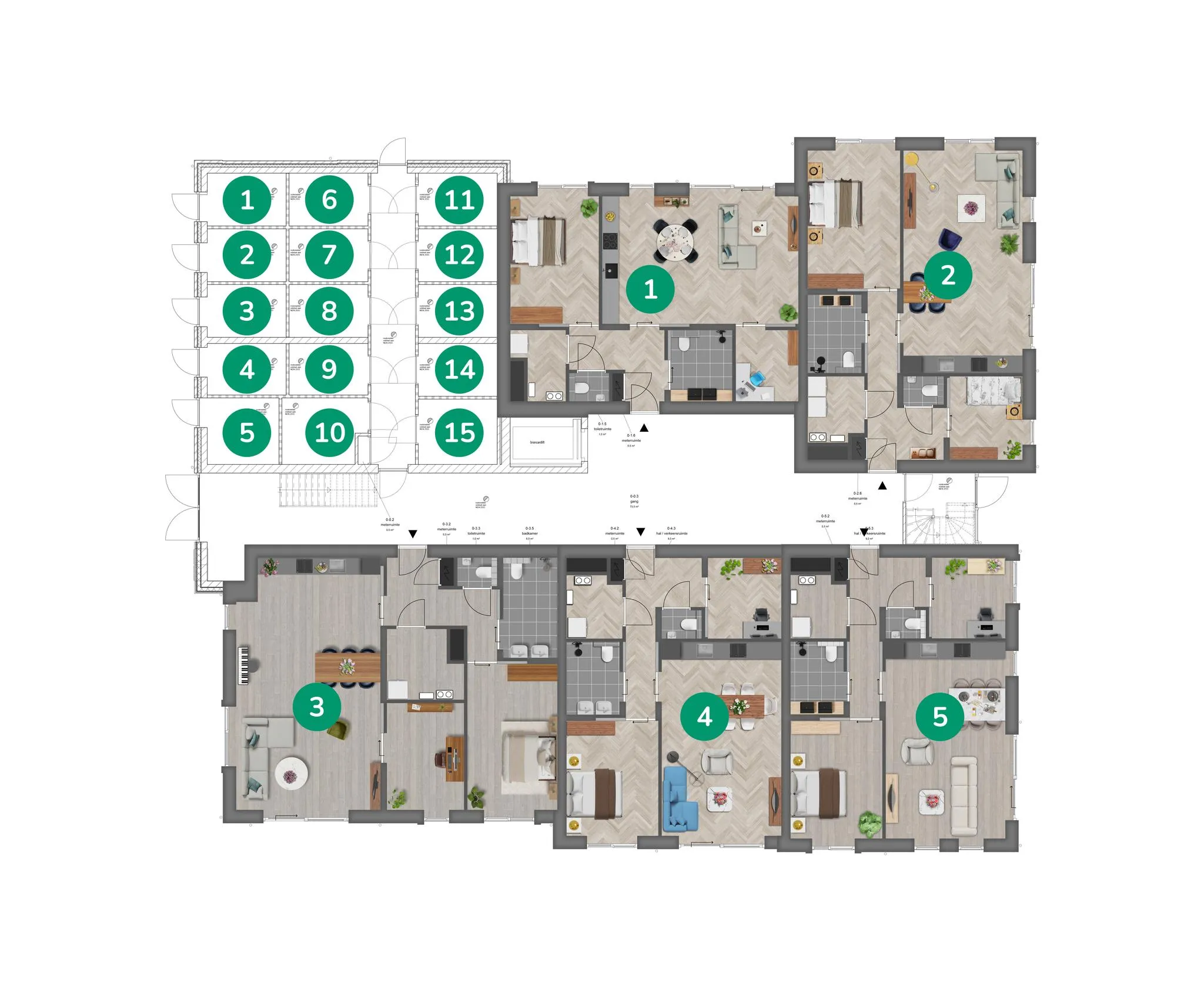 Op de begane grond van De Wingerd vindt u bouwnummers 1 tot en met 5, appartementen variรซrend van 71 mยฒ tot 97 mยฒ, speciaal ontworpen voor senioren die het gemak van gelijkvloers wonen zoeken met de optie voor directe toegang tot een eigen tuinterras. Deze appartementen bieden een ideale combinatie van comfort, stijl, en functionaliteit. Een bijzondere toevoeging is de gezamenlijke pantry met zithoek, een warme en uitnodigende plek waar bewoners samen kunnen komen voor een kopje koffie en een gezellig praatje, bevorderlijk voor zowel privacy in uw appartement als sociale interactie binnen de gemeenschap.