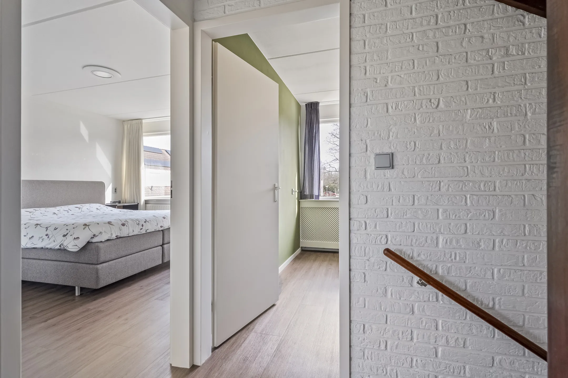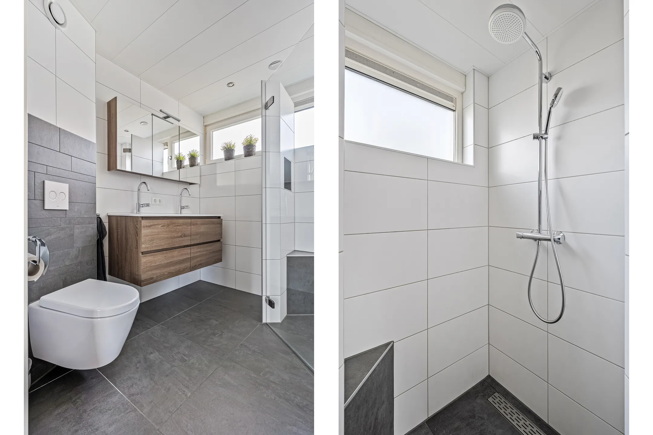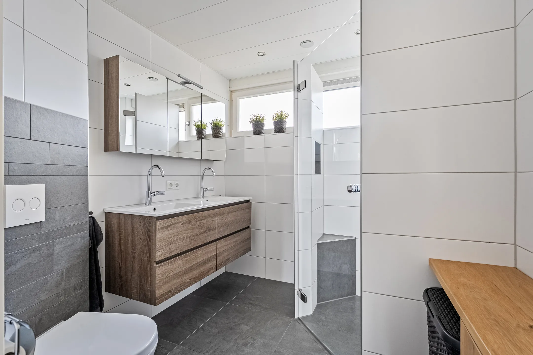 1e verdieping: Overloop, 3 slaapkamers waarvan 1 v.v. handbediende rolluiken en vaste kastenwand, 1 v.v. elektrisch bediende rolluiken en 1 v.v. wastafelmeubel, moderne badkamer v.v. elektrische vloerverwarming, dubbele wastafel in meubel, toilet, inloopdouche v.v. regen- en handdouche, inbouw bluetooth-speakers, mechanische ventilatie en draai-/kiepraam.
