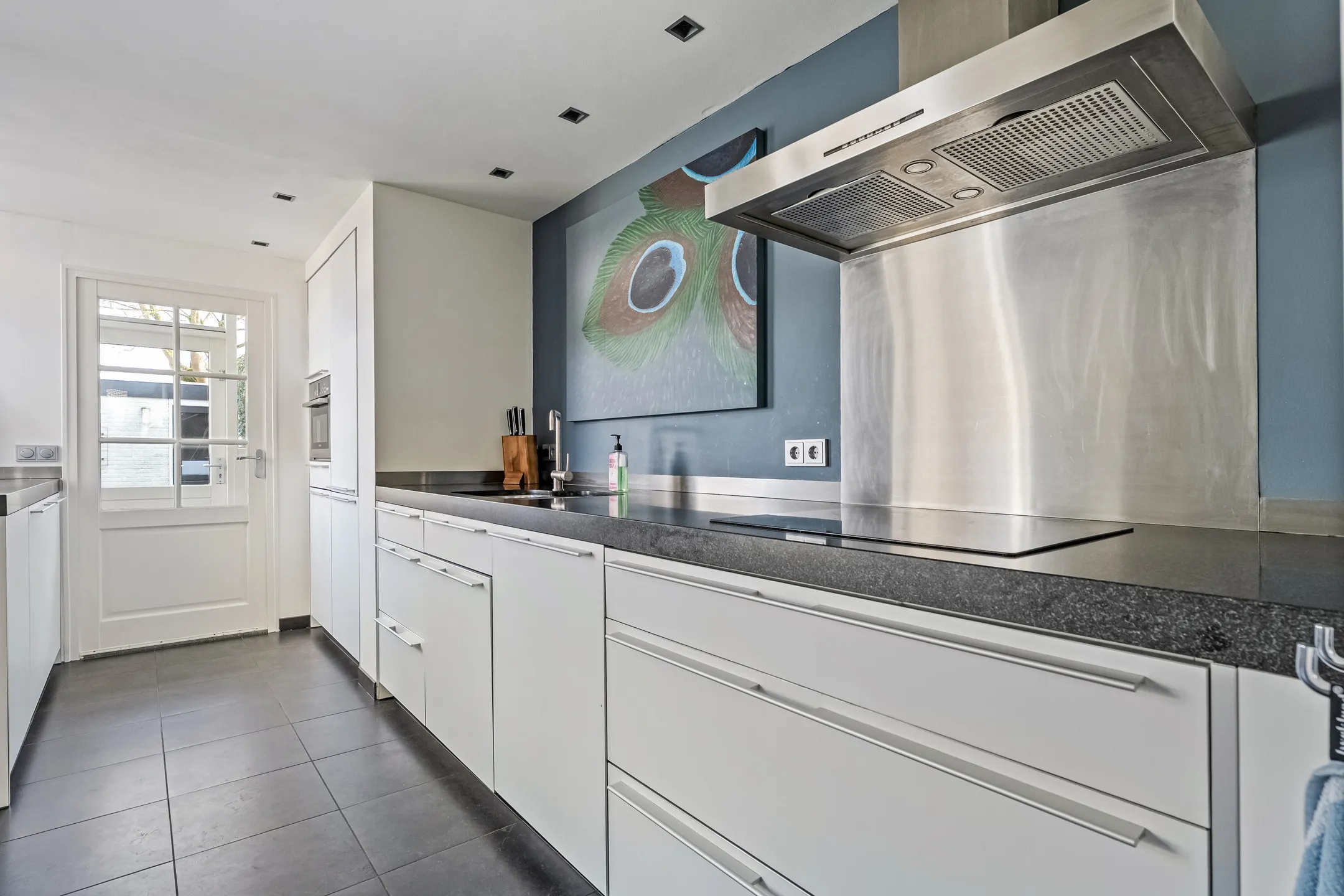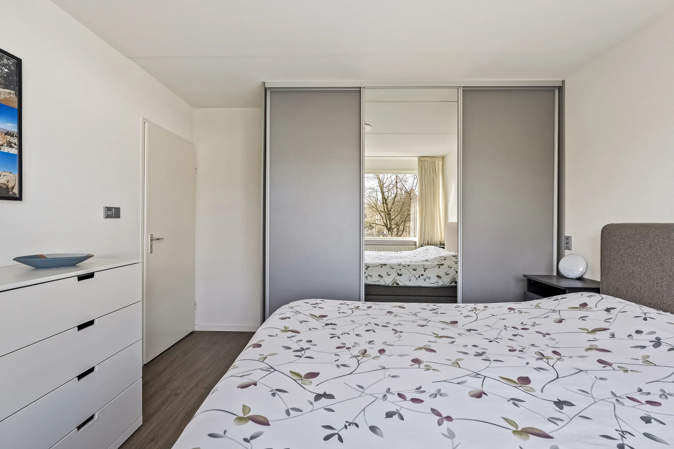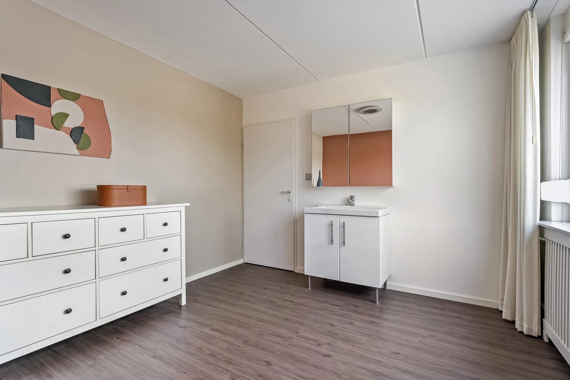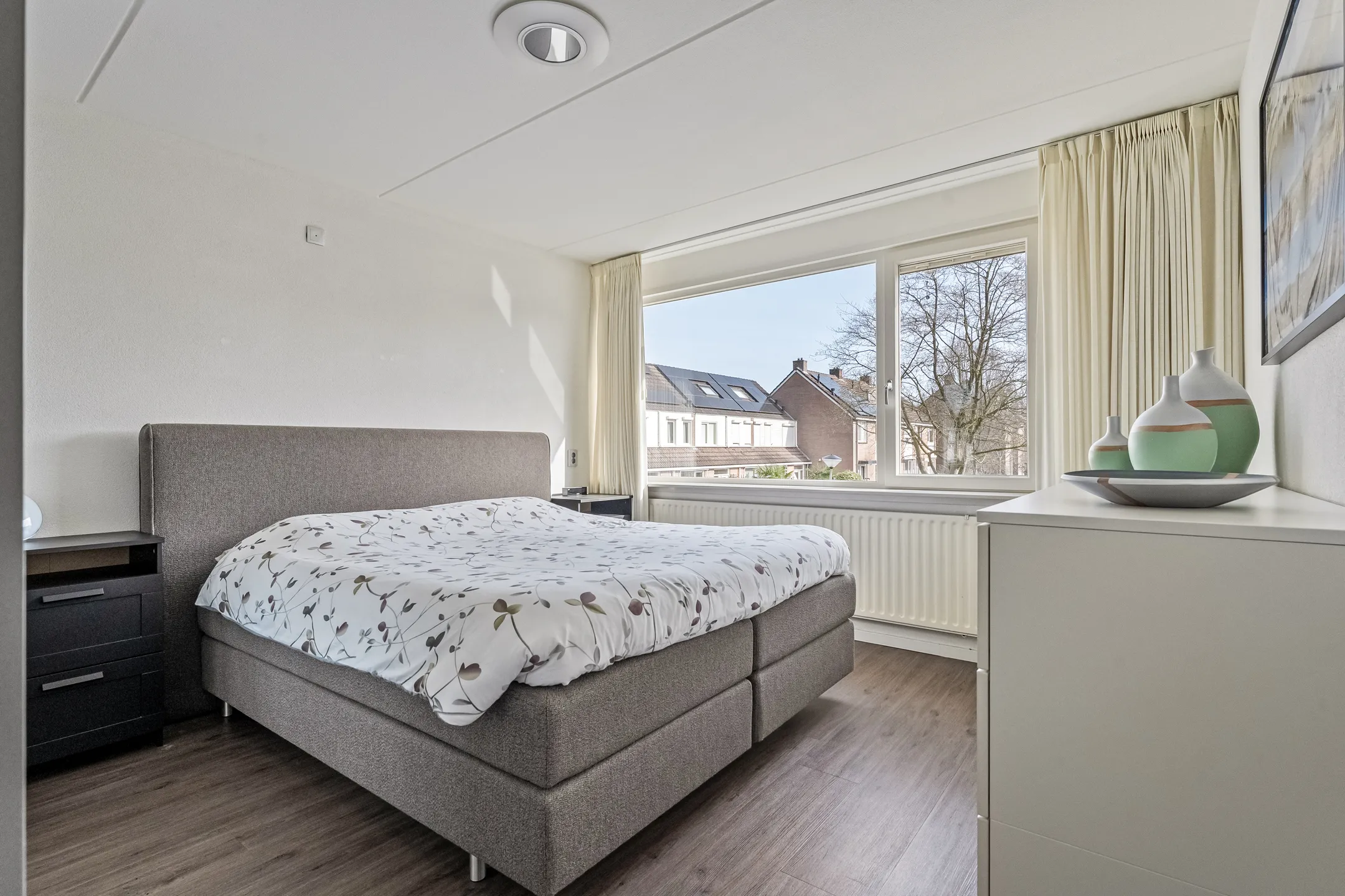 1e verdieping: Overloop, 3 slaapkamers waarvan 1 v.v. handbediende rolluiken en vaste kastenwand, 1 v.v. elektrisch bediende rolluiken en 1 v.v. wastafelmeubel, moderne badkamer v.v. elektrische vloerverwarming, dubbele wastafel in meubel, toilet, inloopdouche v.v. regen- en handdouche, inbouw bluetooth-speakers, mechanische ventilatie en draai-/kiepraam.