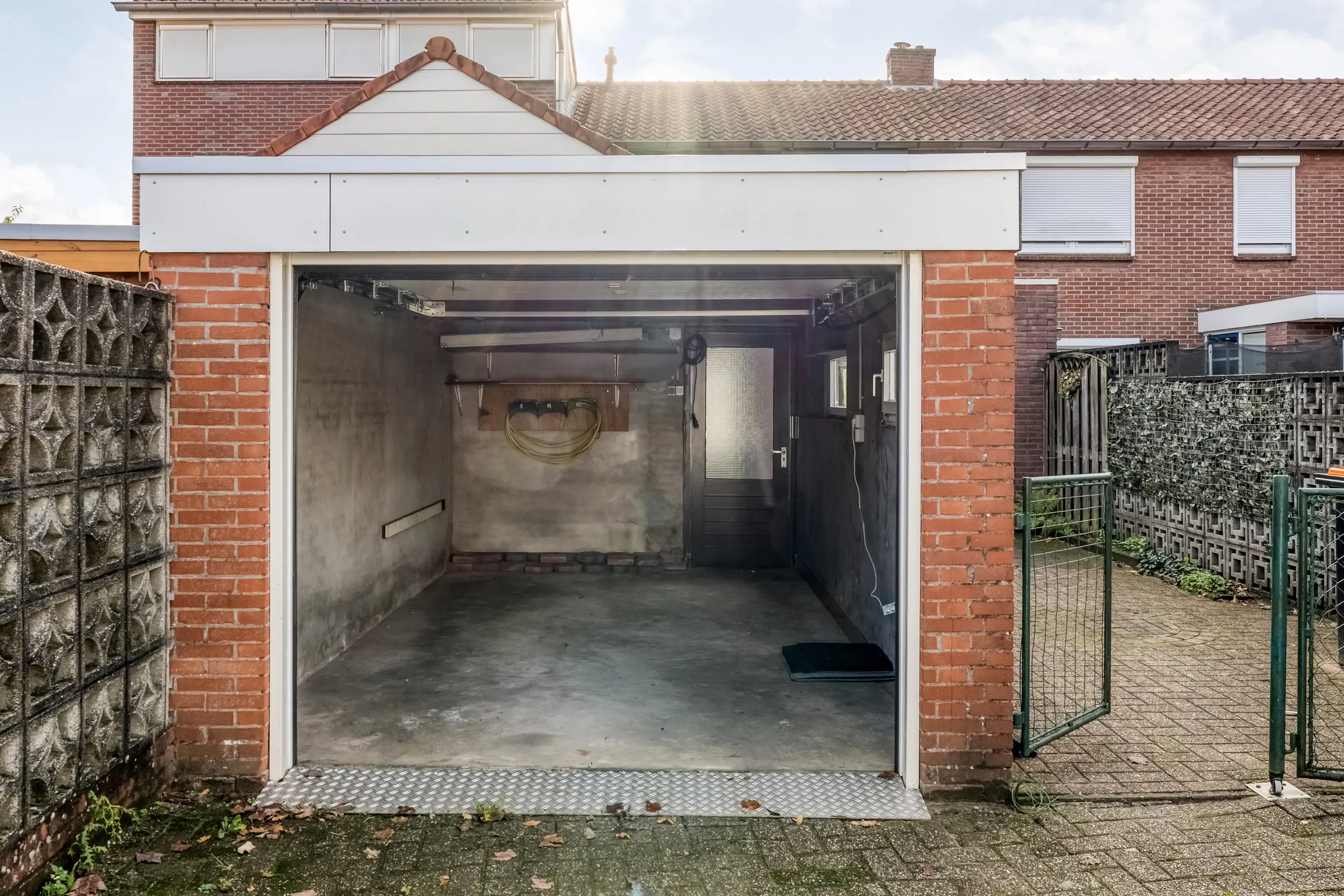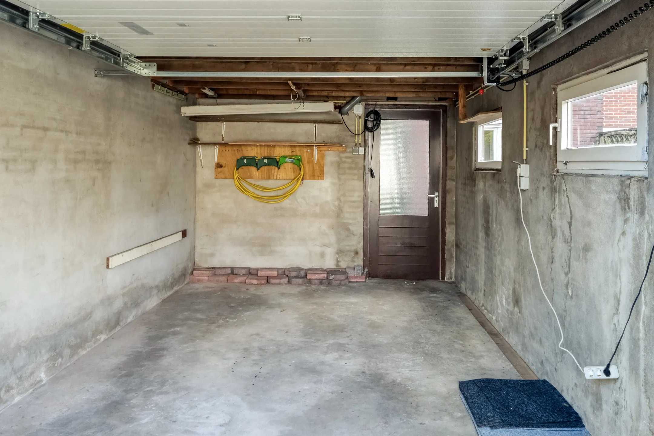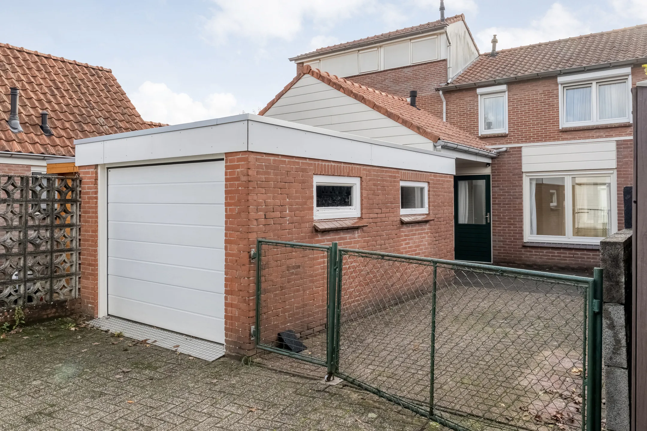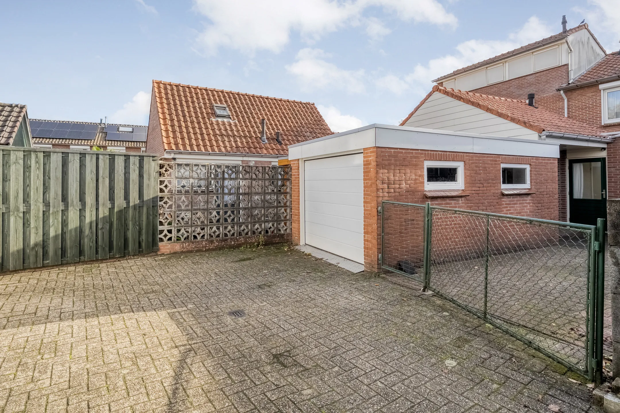 Achter de woning ligt een tuin met een vrijstaande garage, voorzien van een elektrische roldeur. De garage biedt voldoende ruimte voor een auto, fietsen of hobby’s.