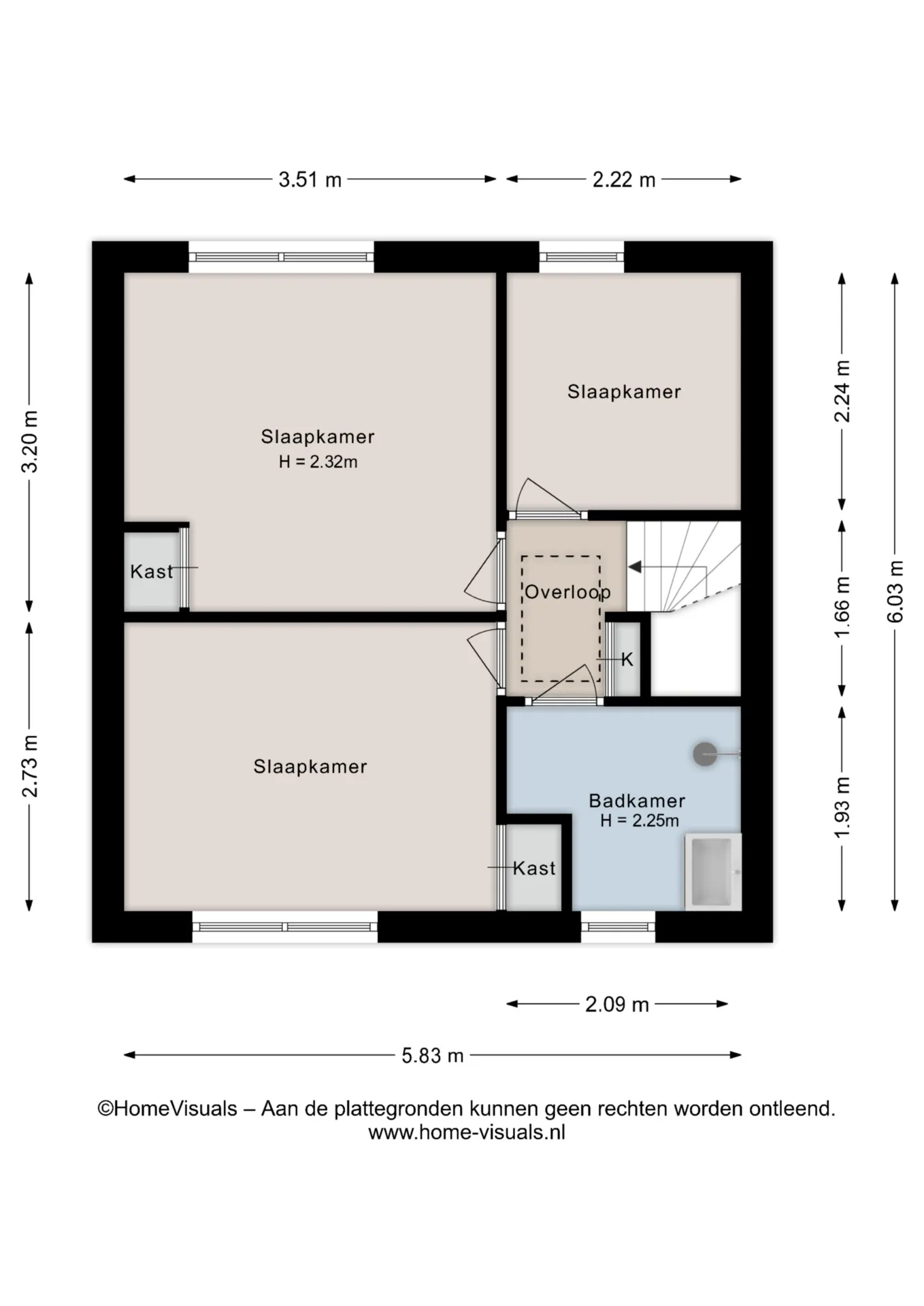 Eerste verdieping: overloop, slaapkamer (2), slaapkamer (3) met vaste kast, slaapkamer (4) met vaste kast, badkamer met douche en wastafel.