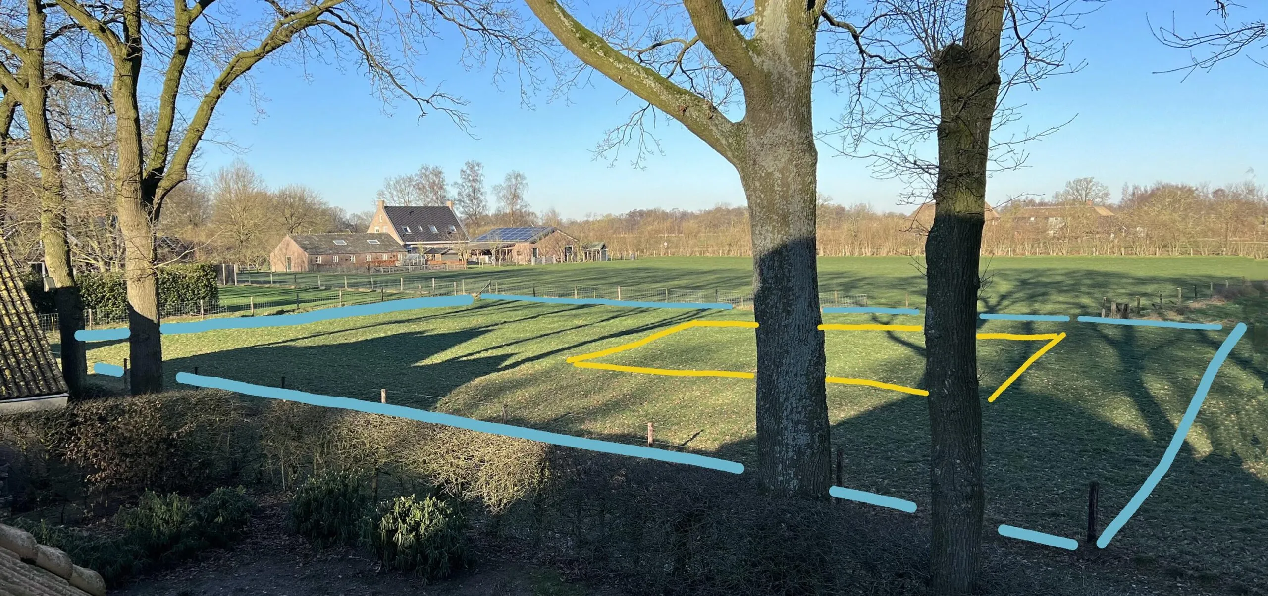 Het omliggende perceel is niet uitsluitend weiland: het westelijke en zuidelijke deel van de kavel is bestemd als groen. Een deel van circa 700 mยฒ dient ingezaaid te worden met een kruidenrijk mengsel, wat bijdraagt aan biodiversiteit en een natuurlijke uitstraling. Bovendien wordt aan de zuidzijde een groene afscheiding aangeplant, wat zorgt voor rust, privacy en een naadloze overgang naar het omliggende landschap.