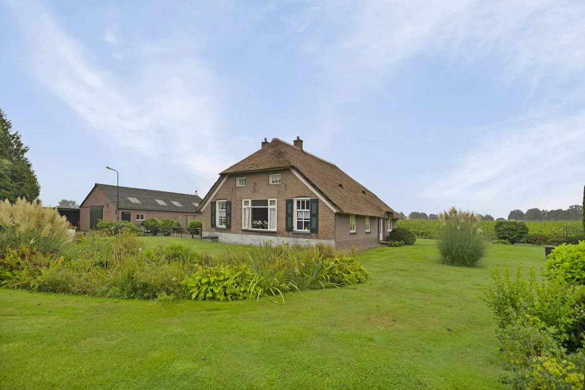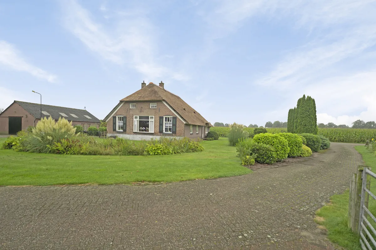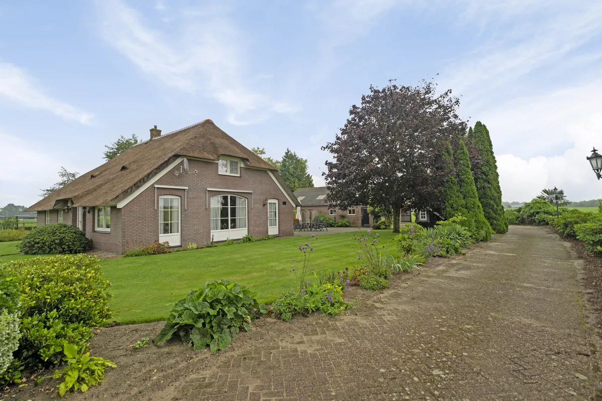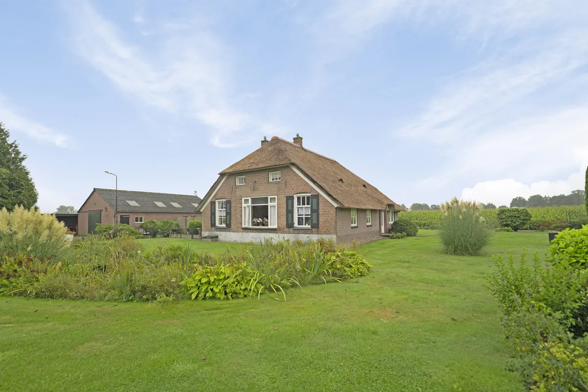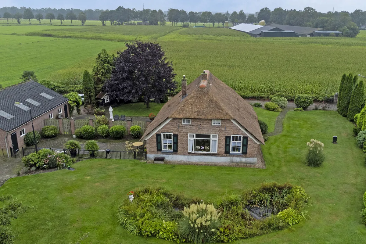 Vrijstaand sfeervolle rietgedekte woonboerderij, voor dubbele bewoning, beide delen met eigen opgang, dubbele royale stenen hobby schuur-, garage-berging, houten kapschuur met hierin 2 paardenstallen met uitloop, opslag fourage, overkapping en ruime parkeergelegenheid. Het geheel is omgeven door mooi aangelegde tuinen en terrassen. Een ideale mogelijkheid voor het houden van paarden of hobby-vee aan huis!