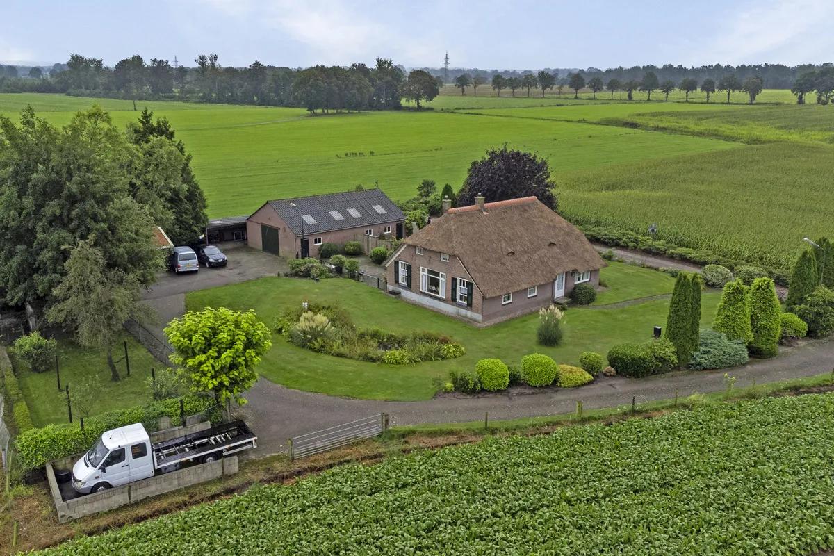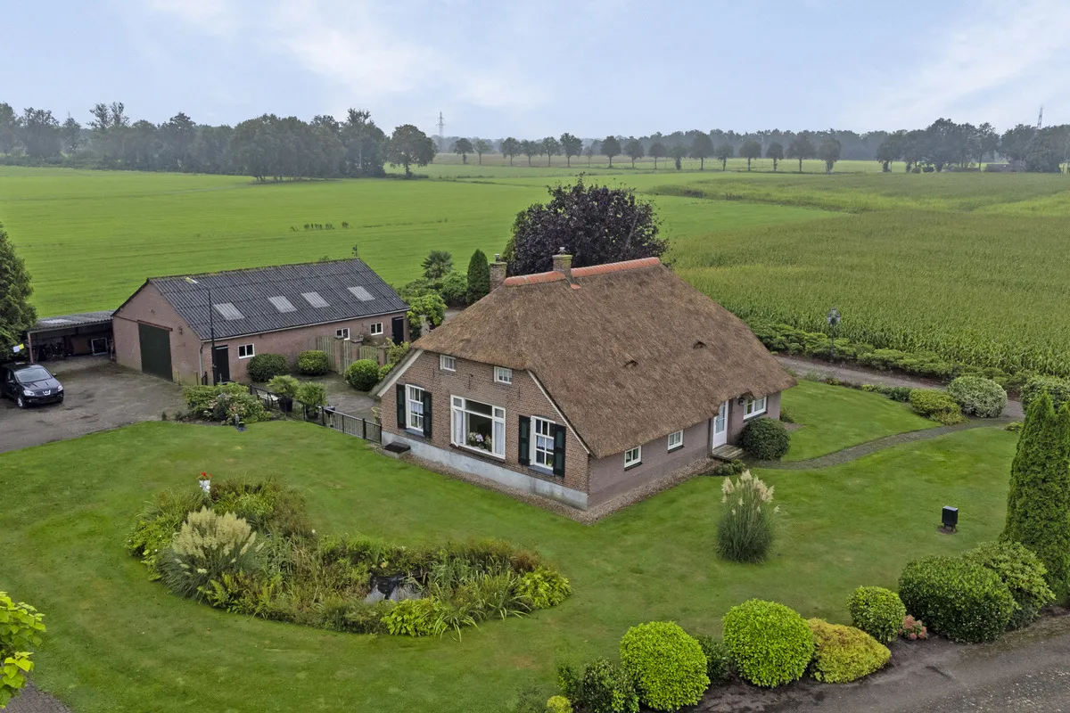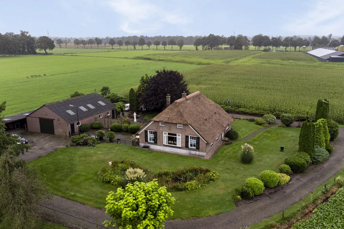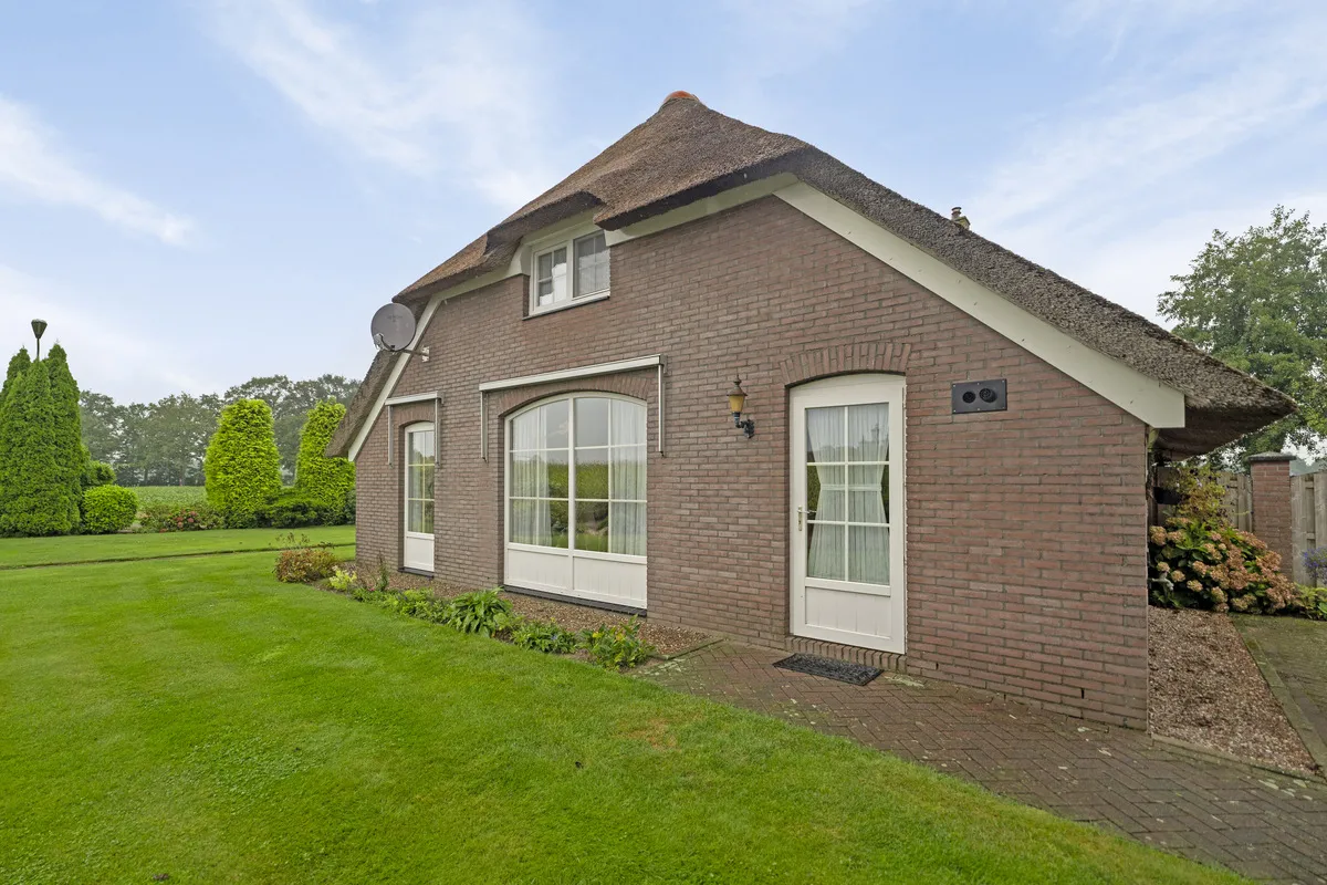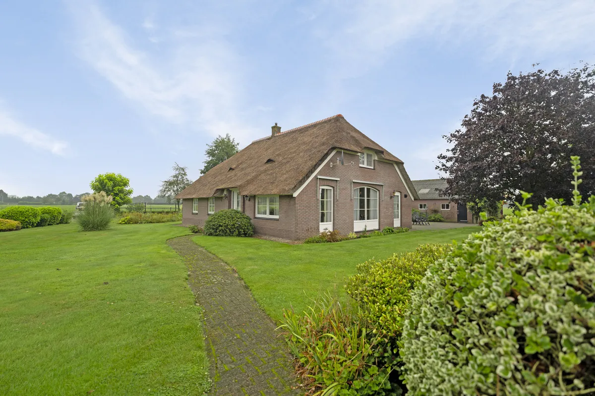Vrijstaand sfeervolle rietgedekte woonboerderij, voor dubbele bewoning, beide delen met eigen opgang, dubbele royale stenen hobby schuur-, garage-berging, houten kapschuur met hierin 2 paardenstallen met uitloop, opslag fourage, overkapping en ruime parkeergelegenheid. Het geheel is omgeven door mooi aangelegde tuinen en terrassen. Een ideale mogelijkheid voor het houden van paarden of hobby-vee aan huis!