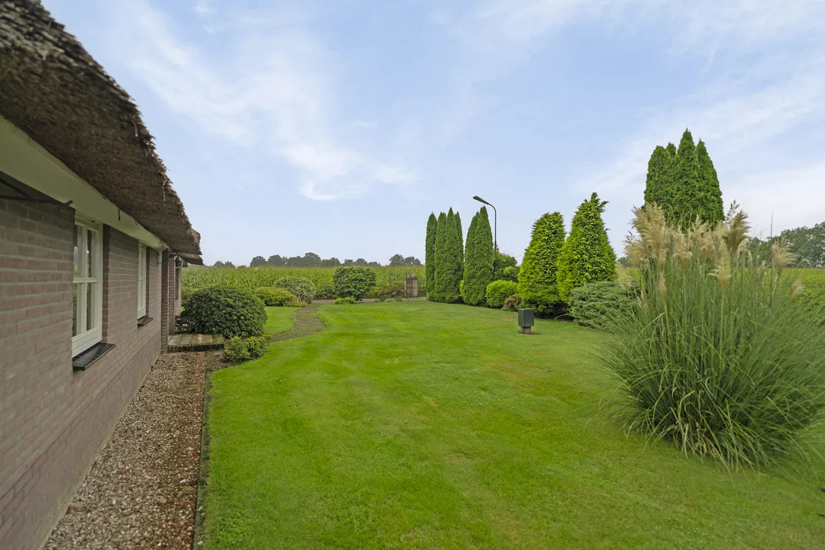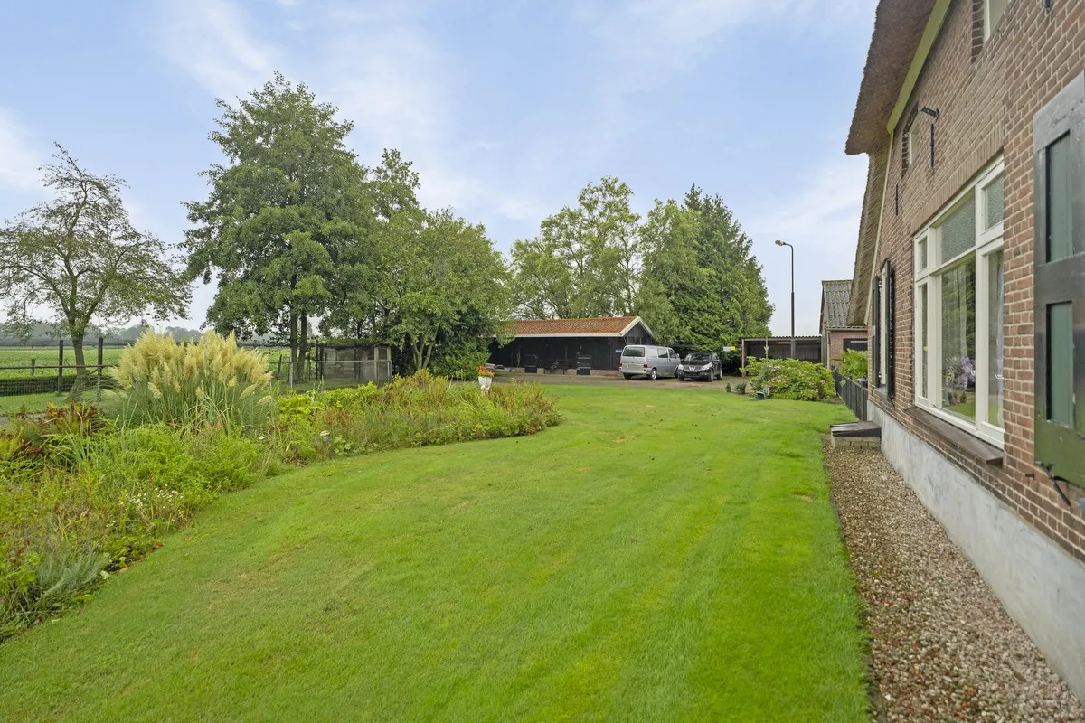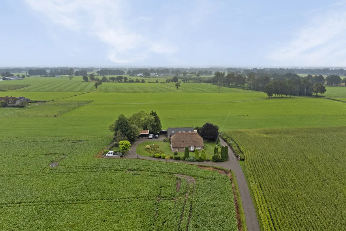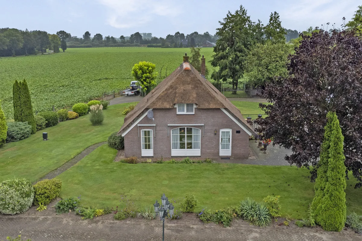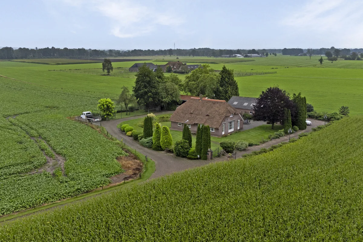 Vrijstaand sfeervolle rietgedekte woonboerderij, voor dubbele bewoning, beide delen met eigen opgang, dubbele royale stenen hobby schuur-, garage-berging, houten kapschuur met hierin 2 paardenstallen met uitloop, opslag fourage, overkapping en ruime parkeergelegenheid. Het geheel is omgeven door mooi aangelegde tuinen en terrassen. Een ideale mogelijkheid voor het houden van paarden of hobby-vee aan huis!