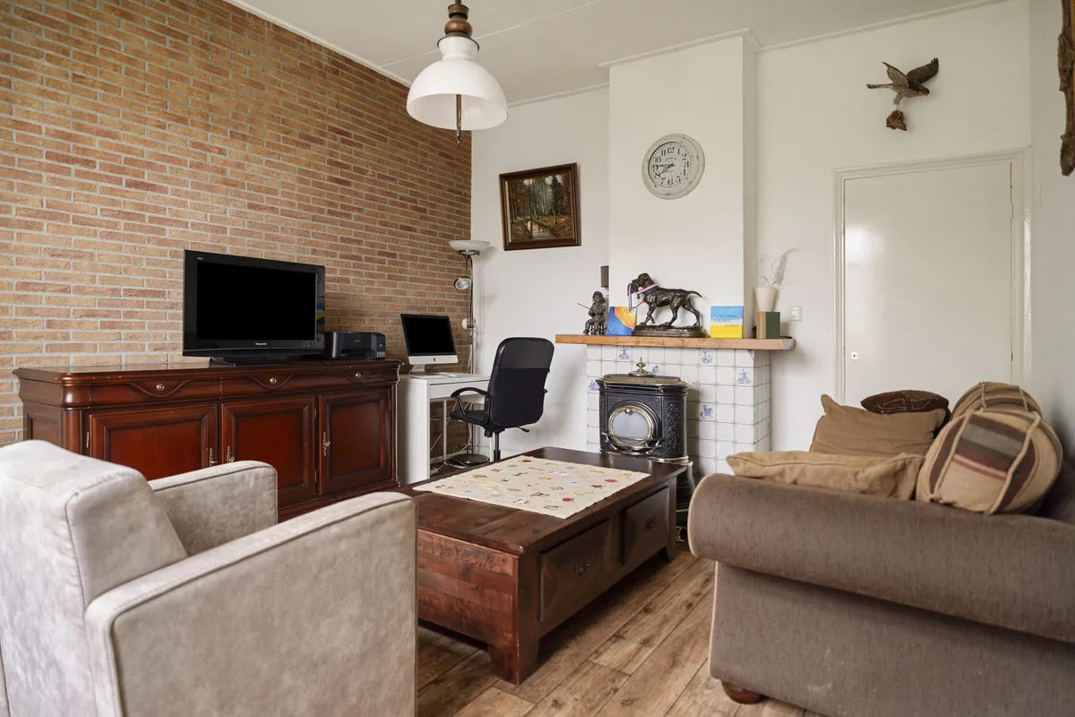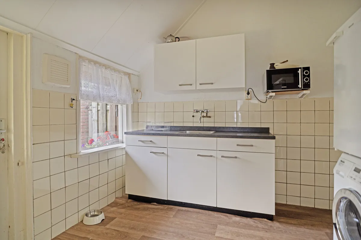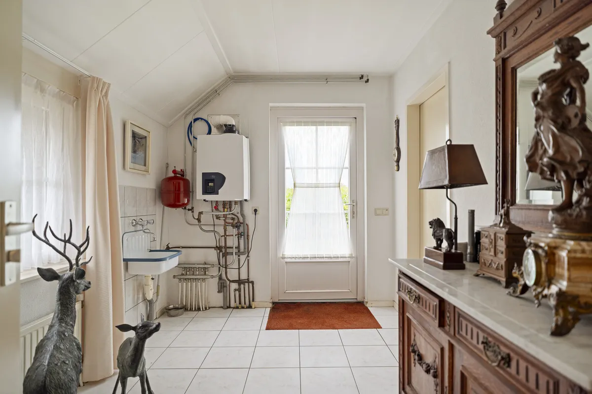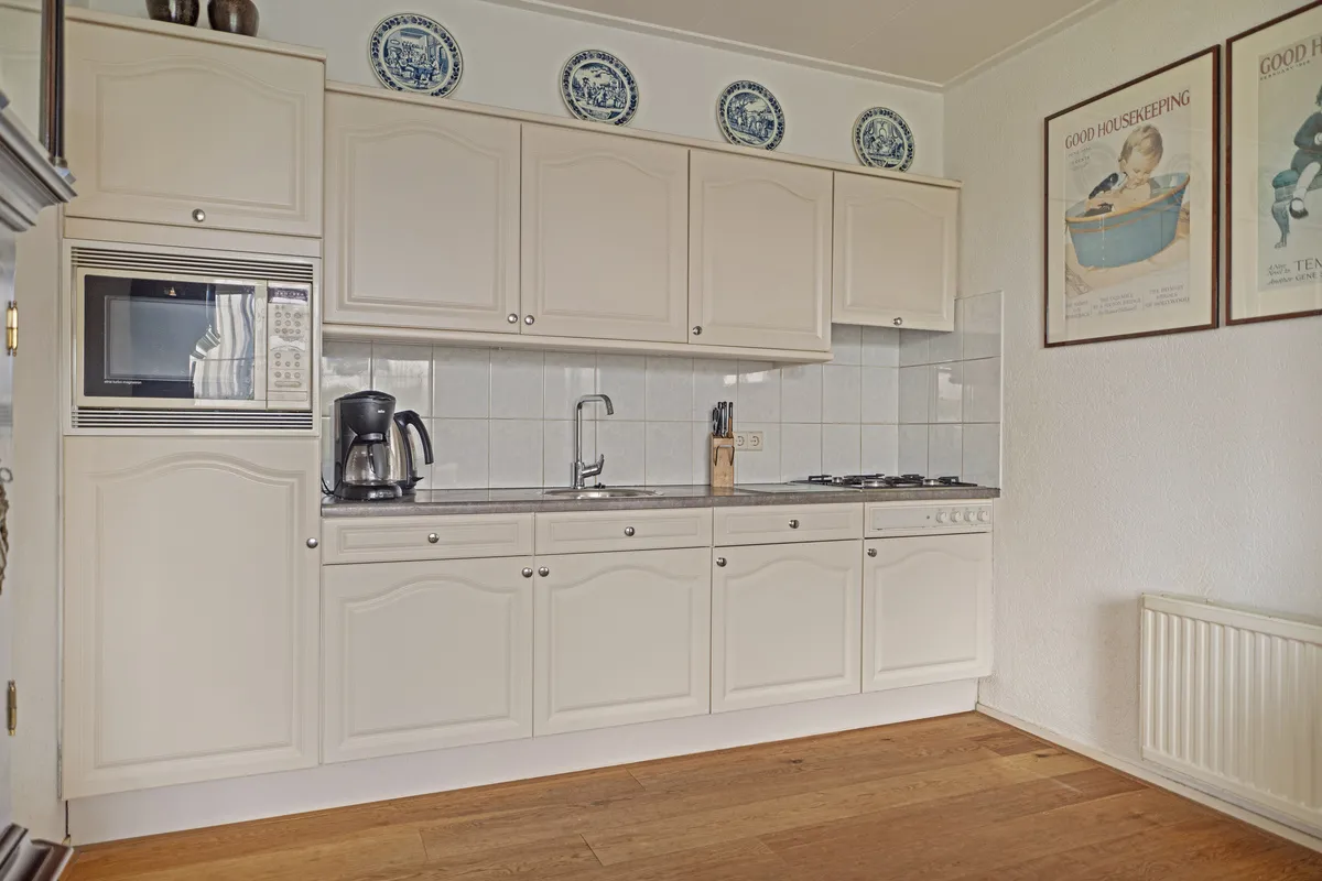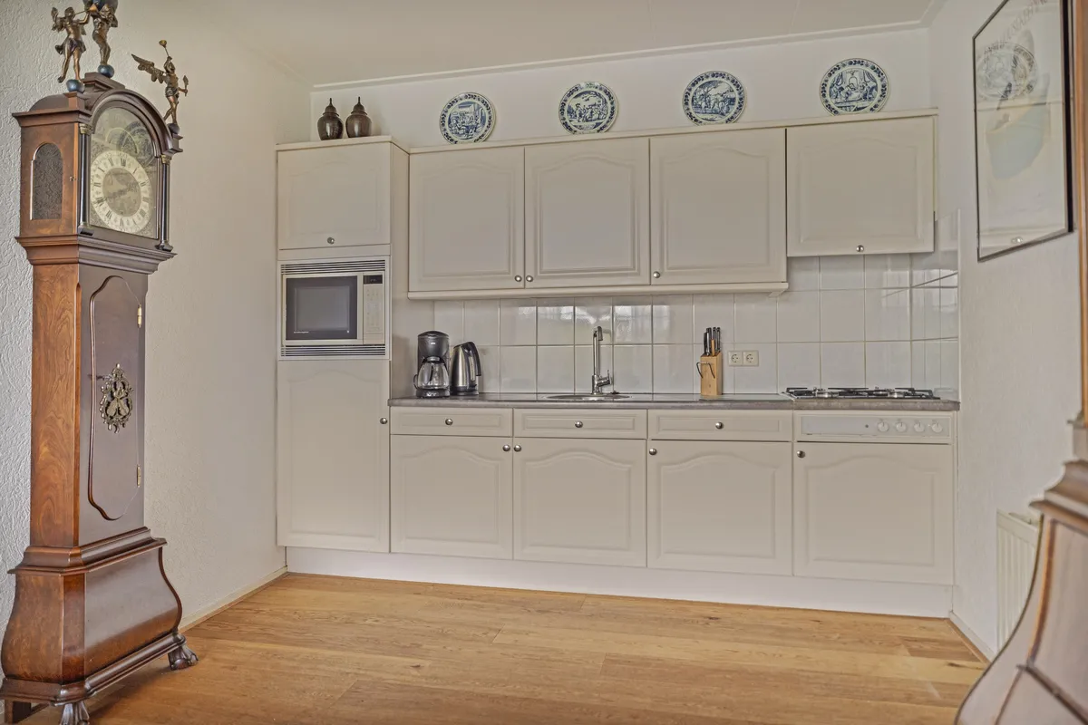 Begane grond: entree, hal, trapopgang, toilet met fontein, gezellige L-vormige woonkamer, open keuken met inbouwapparatuur, bijkeuken, achterhal, badkamer met douche, 2e toilet en wastafel.
