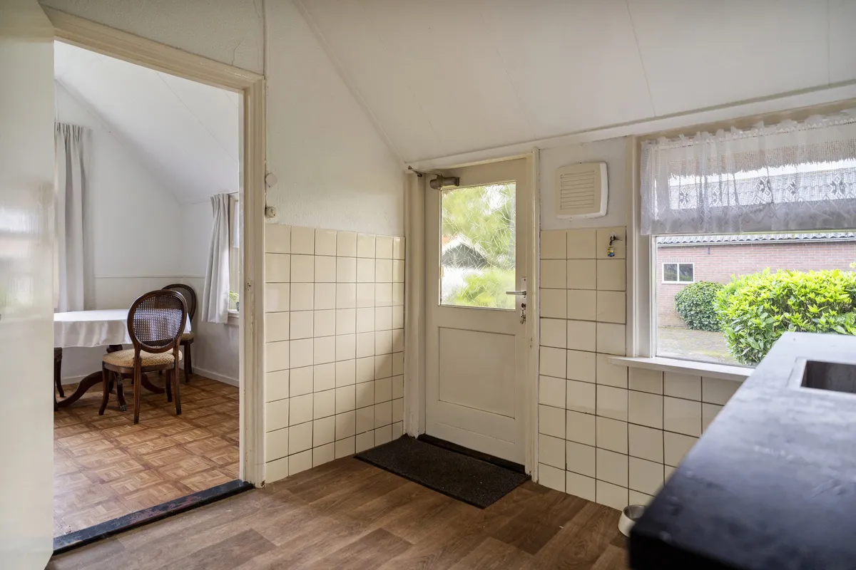 Begane grond: entree, dichte eenvoudige keuken, aansluitend eetkamer met schouw, vaste kastruimte, woonkamer met schouw, tussenhal met trapopgang, slaapkamer en badkamer met toilet, wastafel en douche.