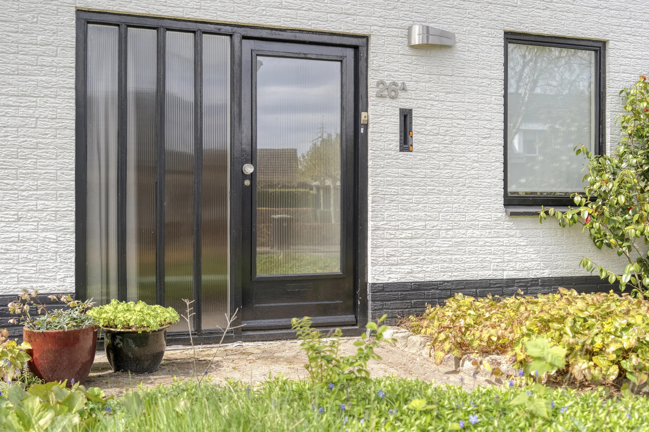 Begane grond: entree, hal, trapopgang, toilet met fontein, gezellige L-vormige woonkamer, open keuken met inbouwapparatuur, bijkeuken, achterhal, badkamer met douche, 2e toilet en wastafel.
