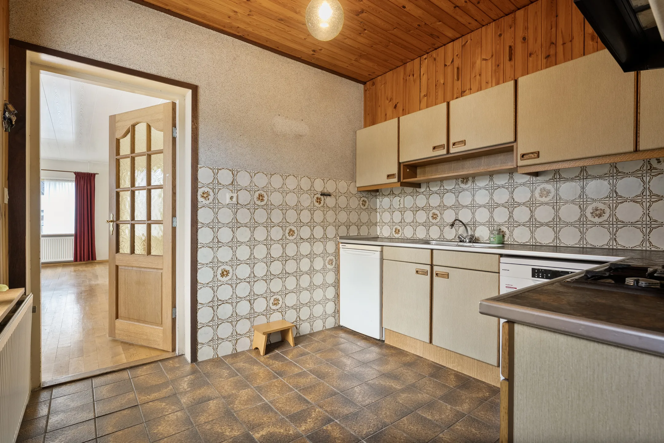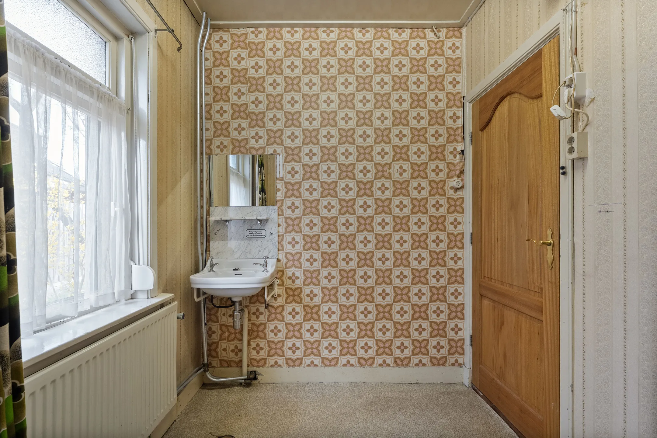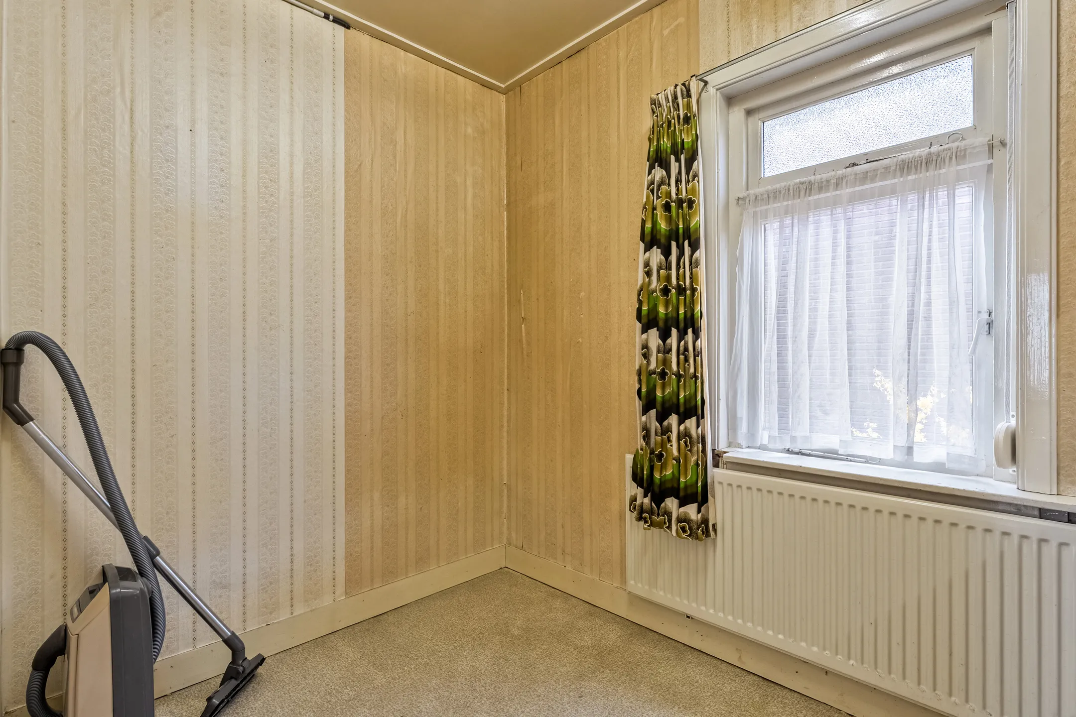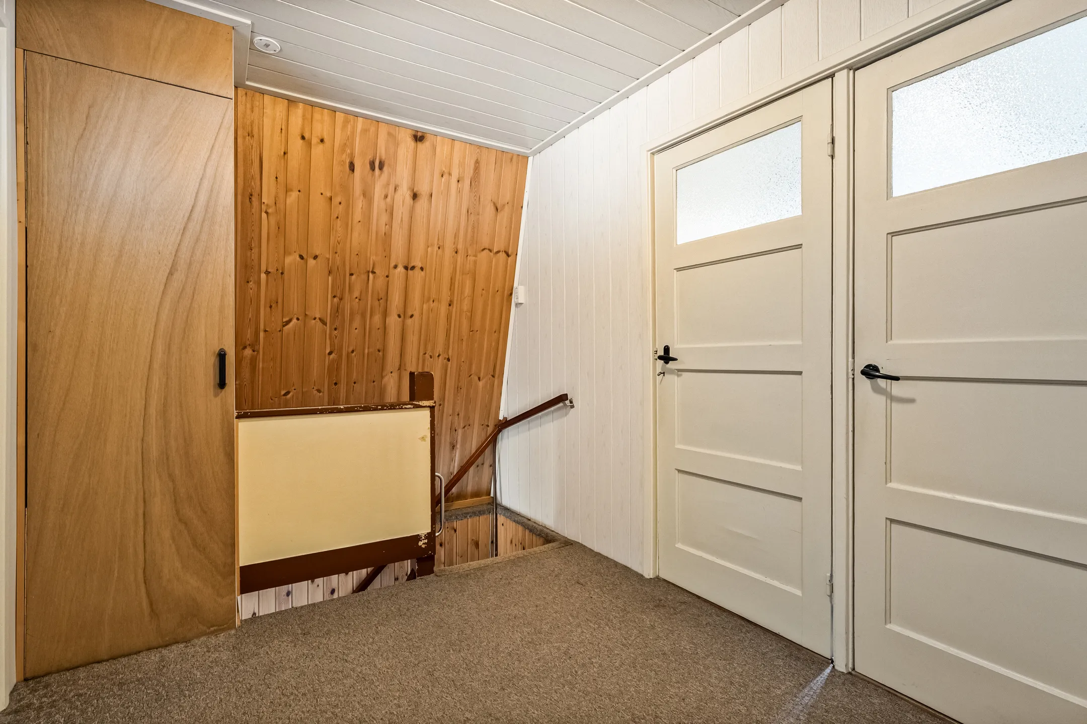 Begane grond: Entree, hal met trapopgang en provisiekelder, woonkamer met aansluitend hobby-/slaapkamer v.v. wastafel en doorloop naar dichte keuken in hoekopstelling, aansluitend achterhal, toilet met fonteintje en badkamer v.v. wastafel en inloopdouche.