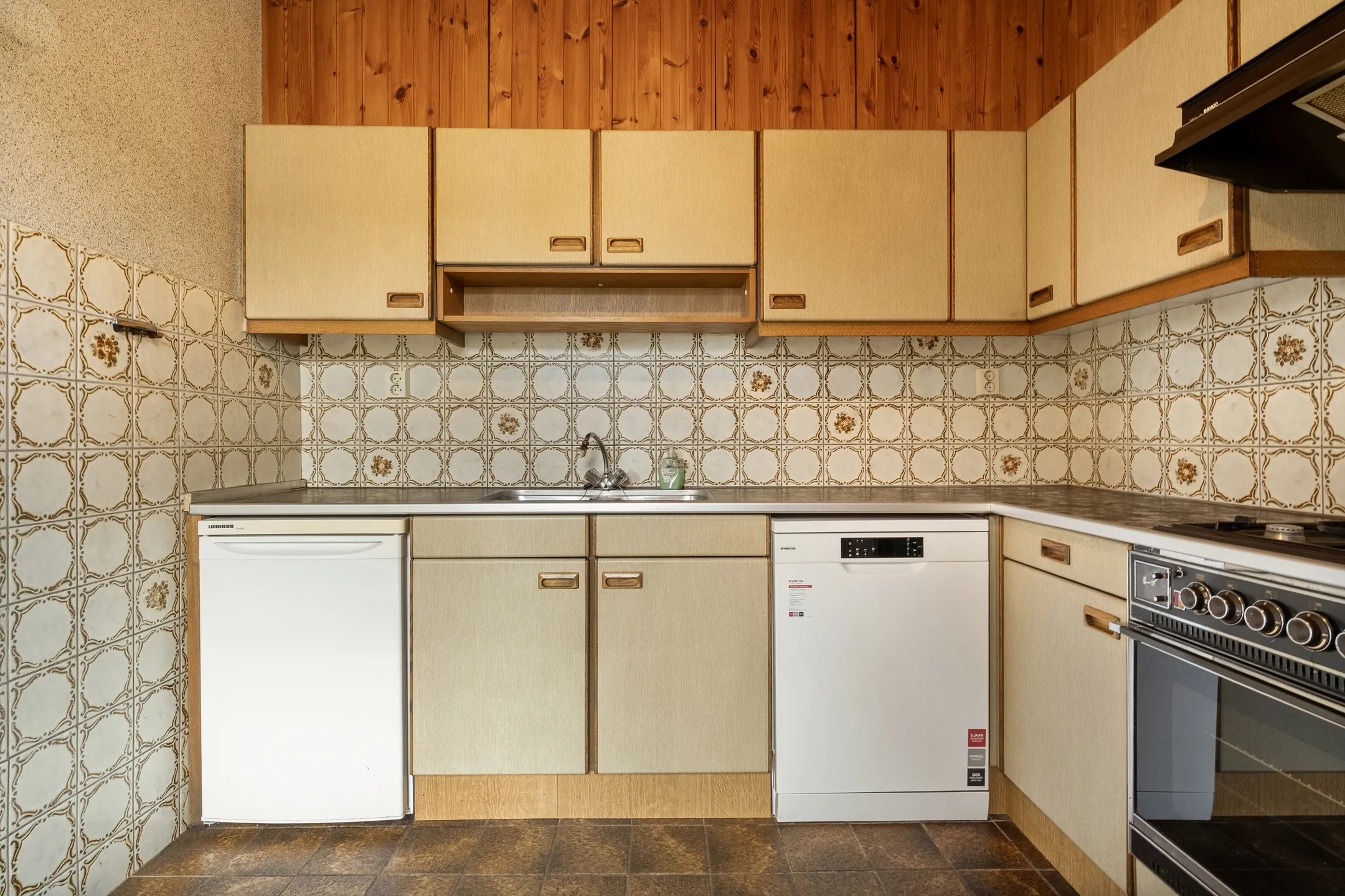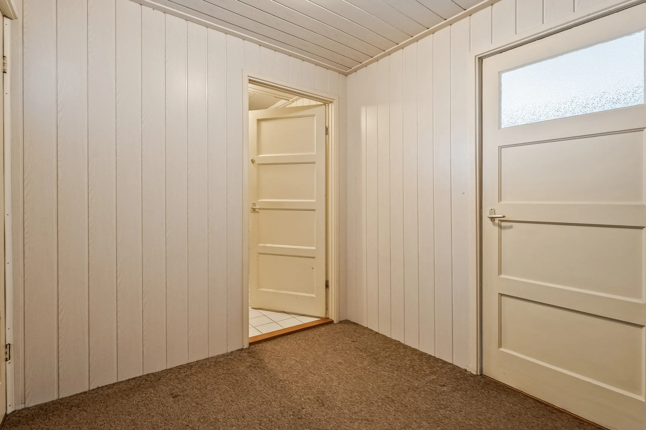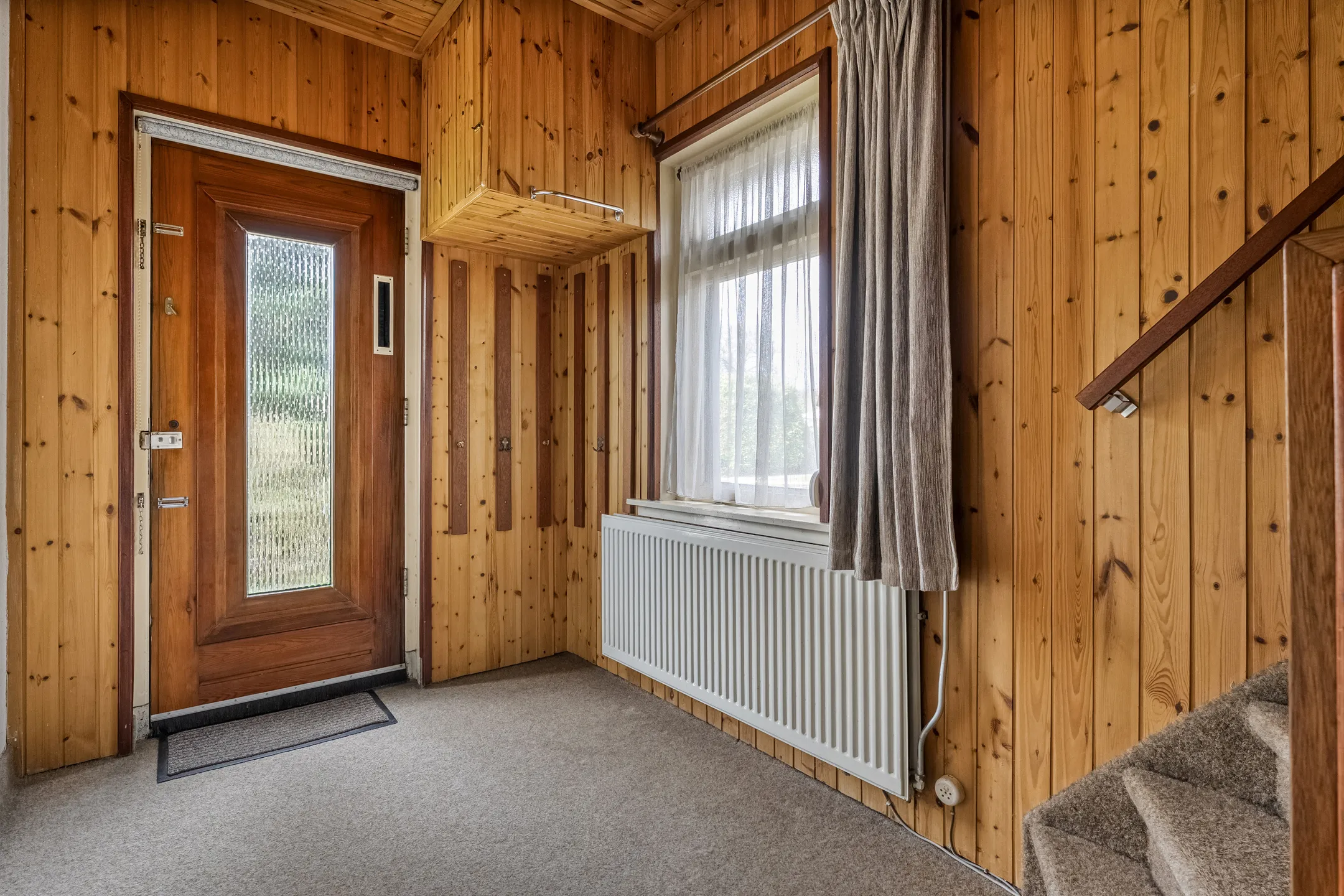 Begane grond: Entree, hal met trapopgang en provisiekelder, woonkamer met aansluitend hobby-/slaapkamer v.v. wastafel en doorloop naar dichte keuken in hoekopstelling, aansluitend achterhal, toilet met fonteintje en badkamer v.v. wastafel en inloopdouche.
