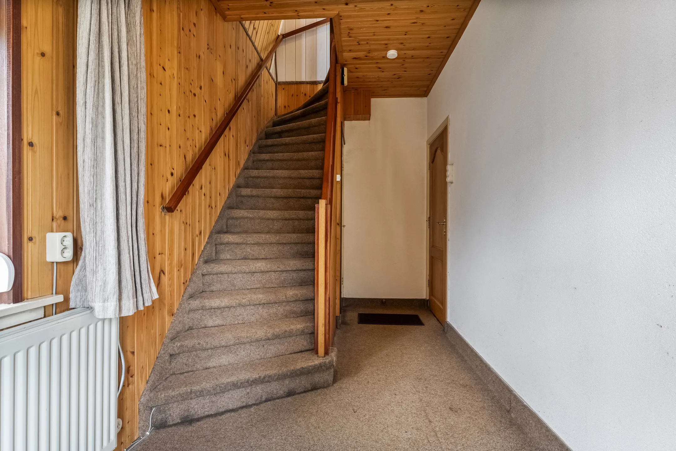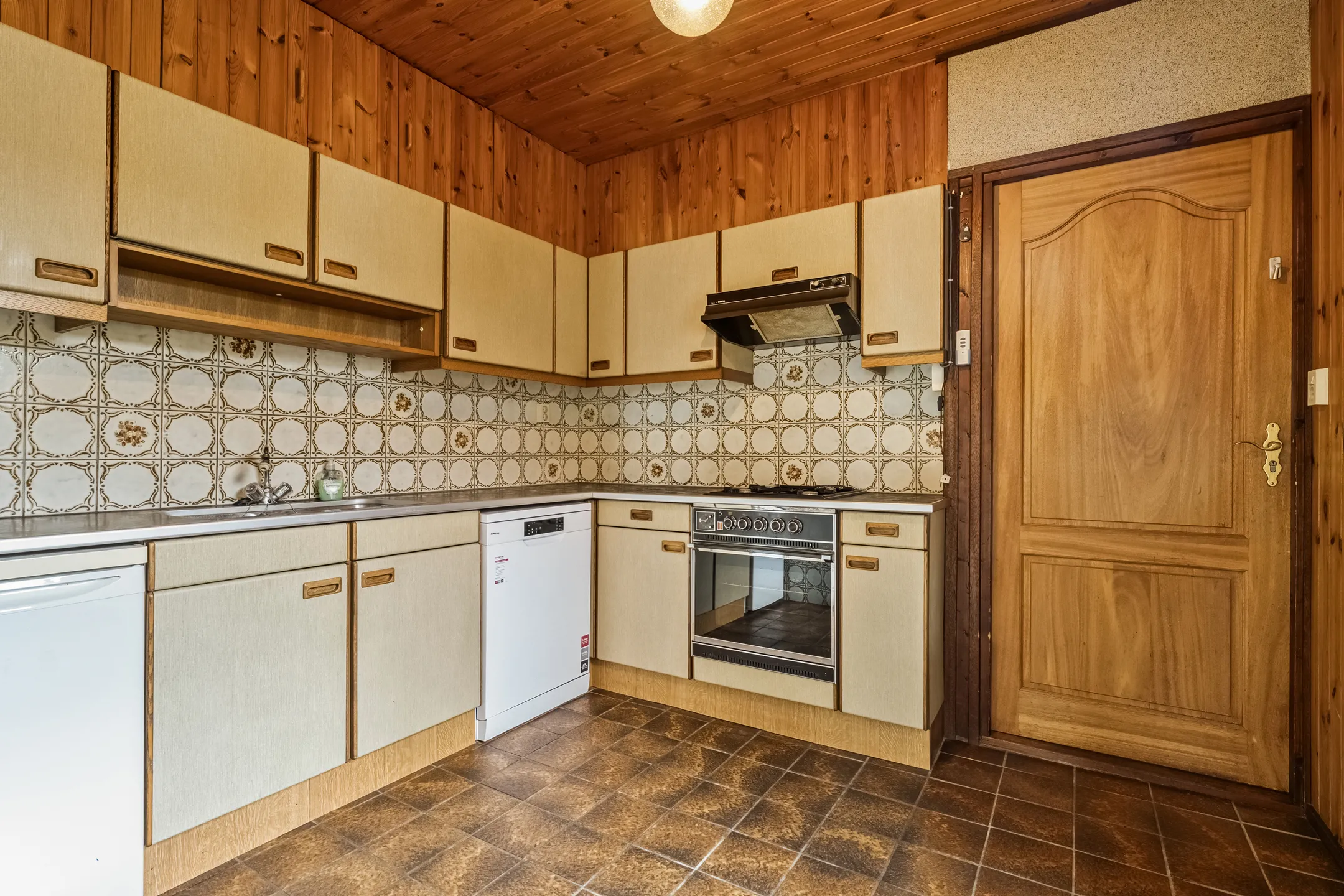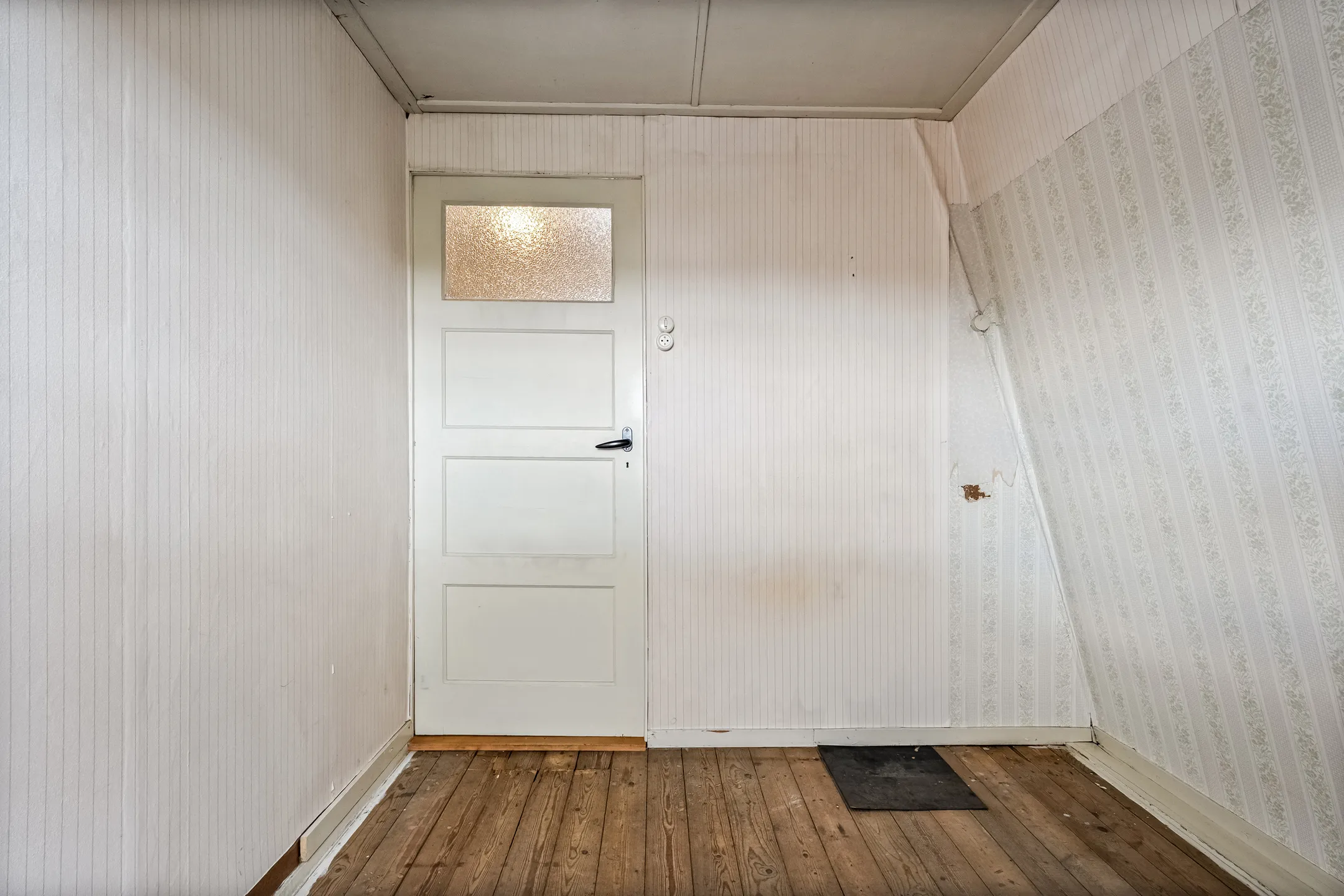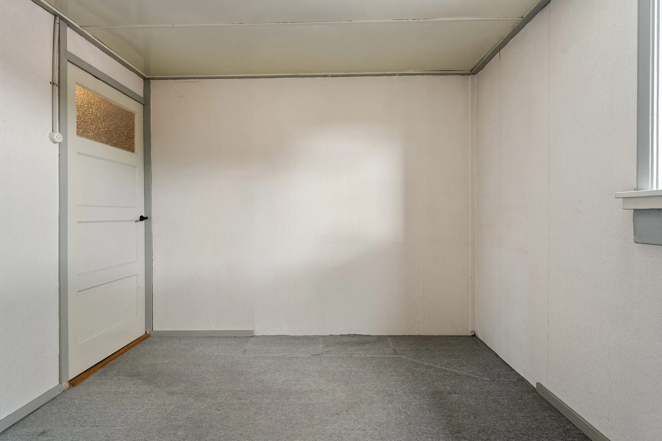 Begane grond: Entree, hal met trapopgang en provisiekelder, woonkamer met aansluitend hobby-/slaapkamer v.v. wastafel en doorloop naar dichte keuken in hoekopstelling, aansluitend achterhal, toilet met fonteintje en badkamer v.v. wastafel en inloopdouche.