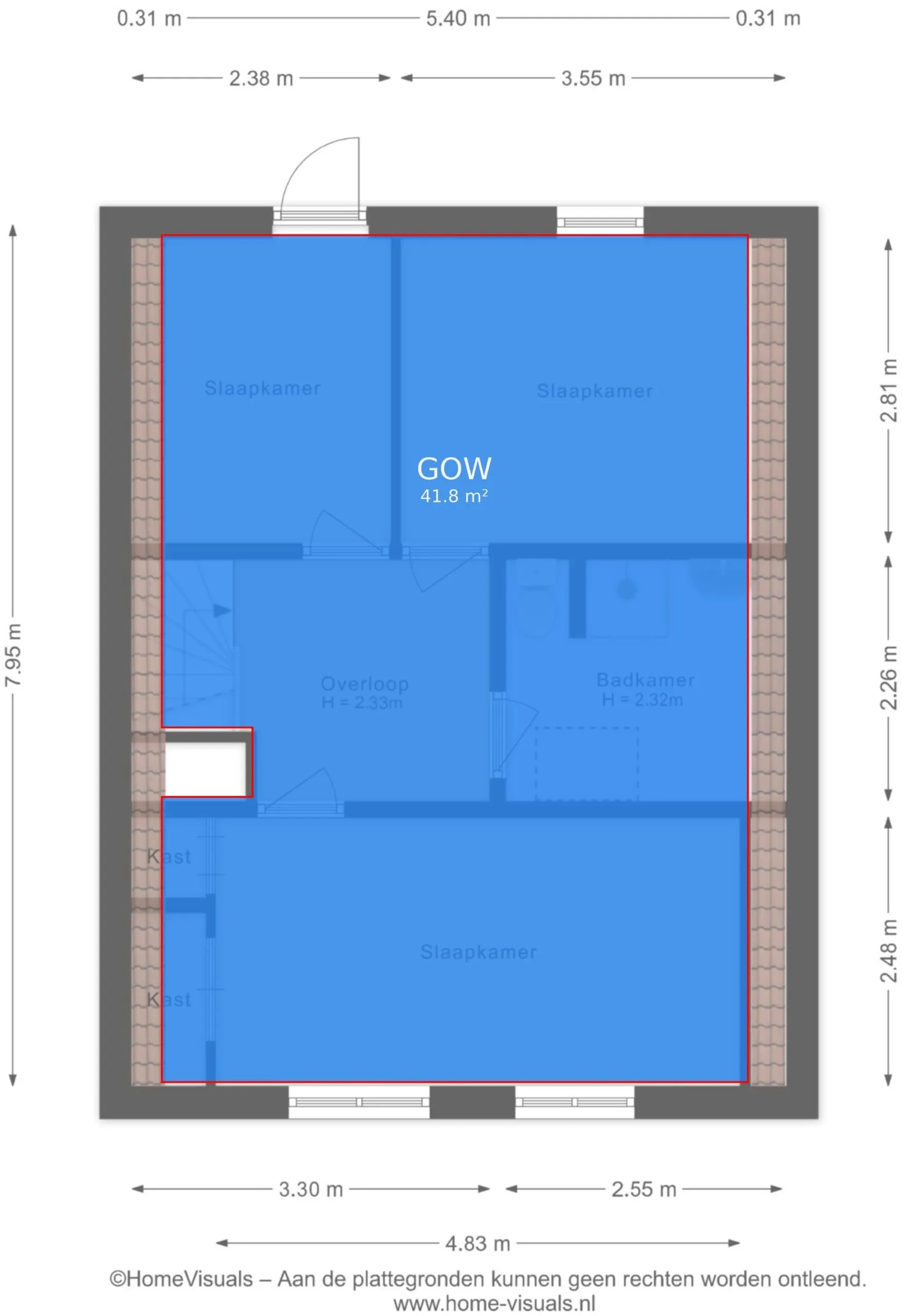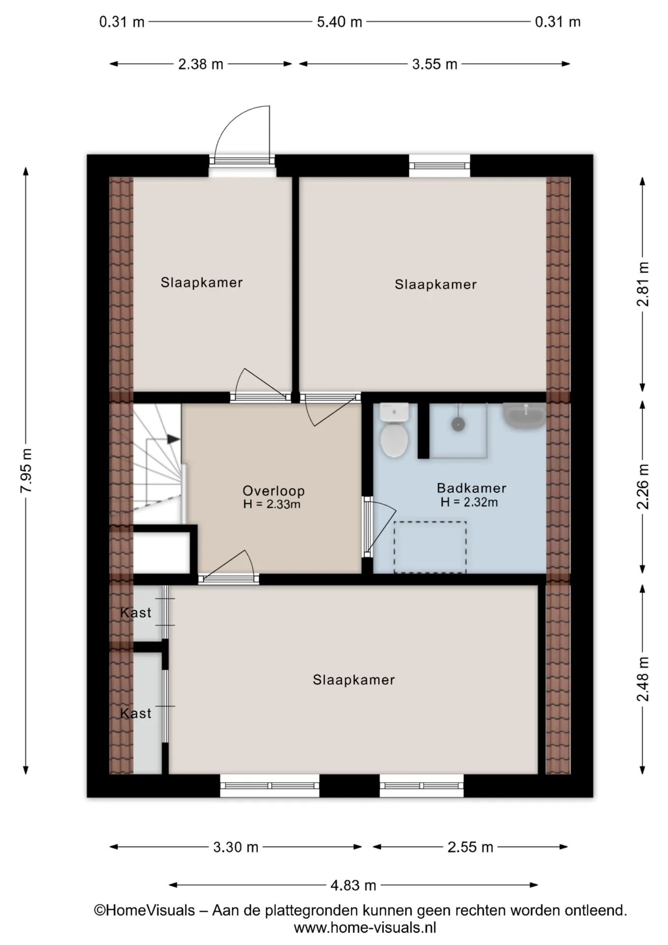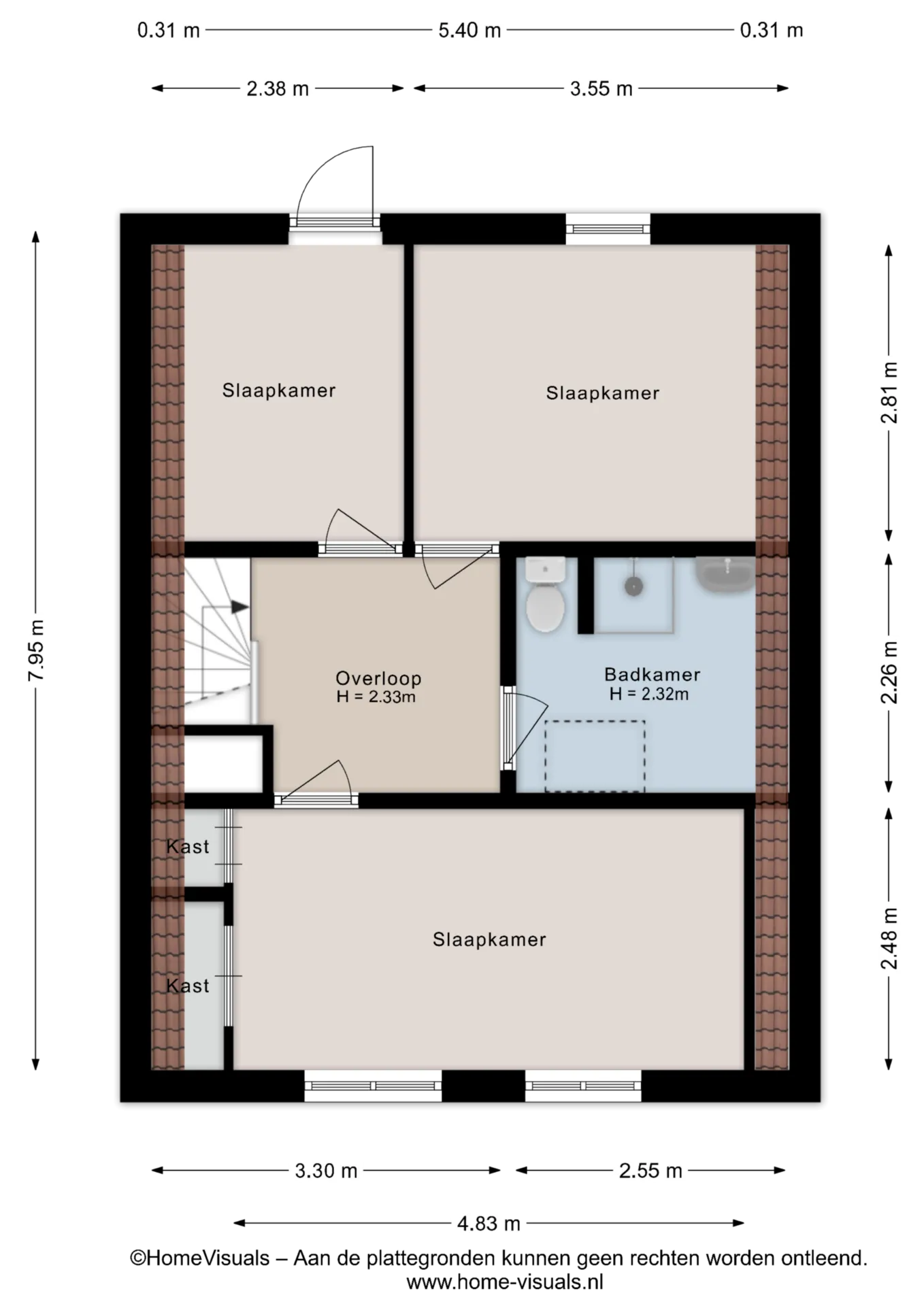 1e verdieping: Overloop v.v. vaste kast, badkamer v.v. toilet, instapdouche en wastafel, 3 slaapkamers waarvan één v.v. twee vaste kasten.