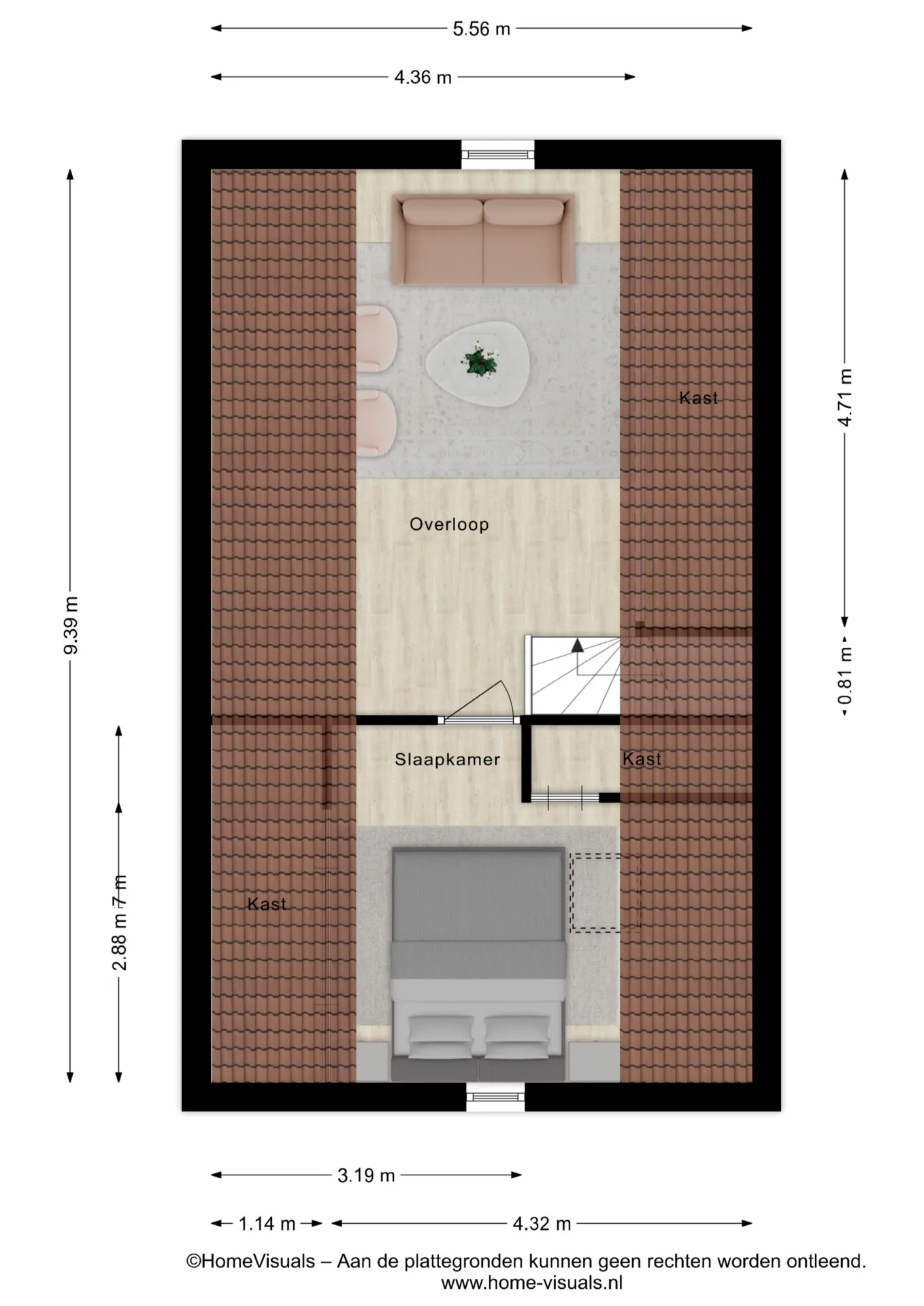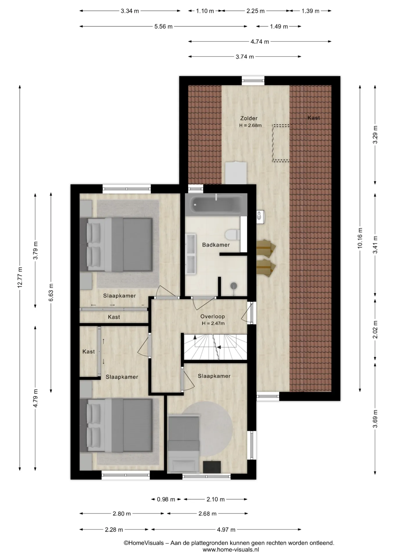 2e verdieping: Voorzolder v.v. kap met stalen spantenconstructie en volop bergruimte, aansluitend slaapkamer (4) v.v. knieschotten, Velux dakraam en gevelvenster.