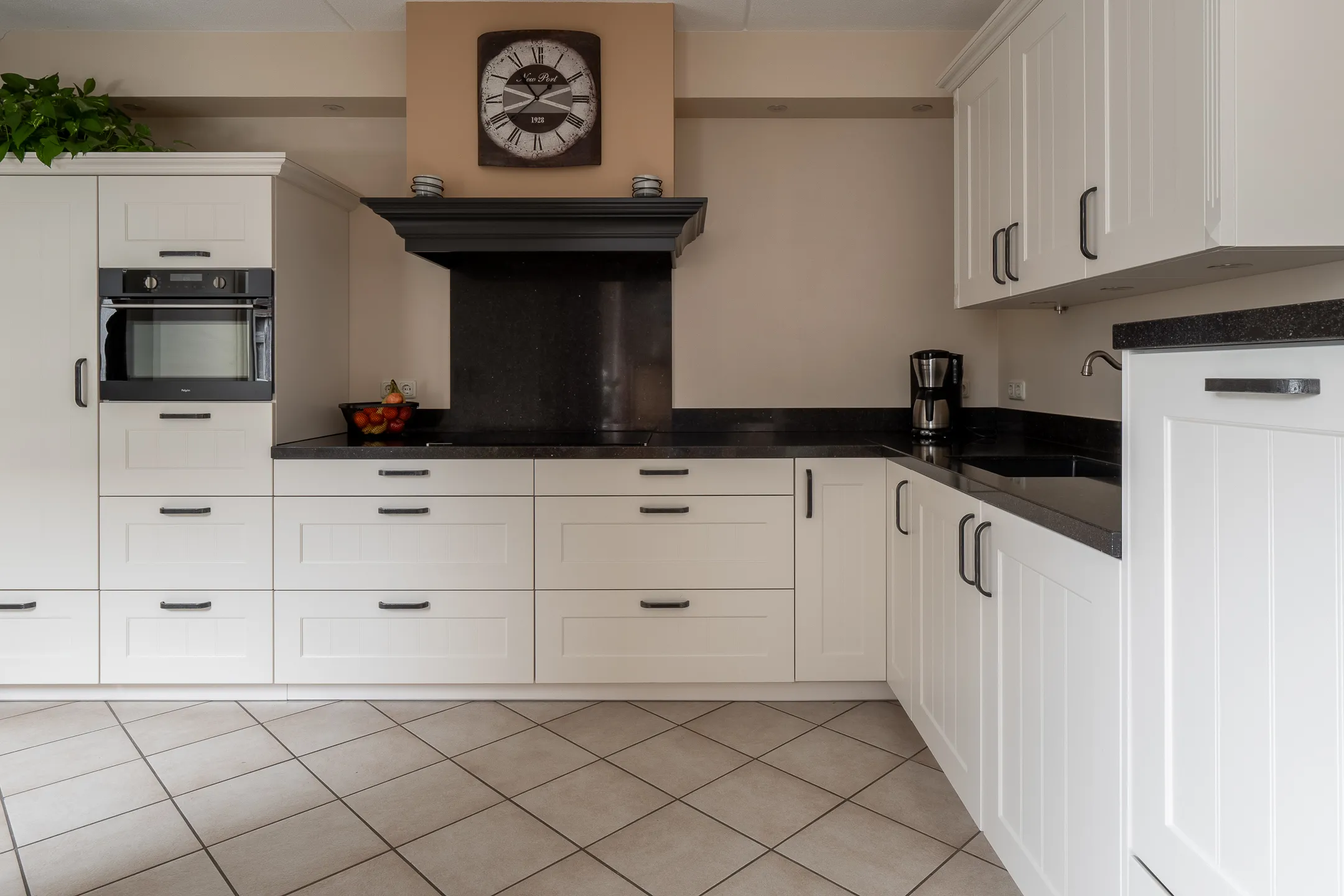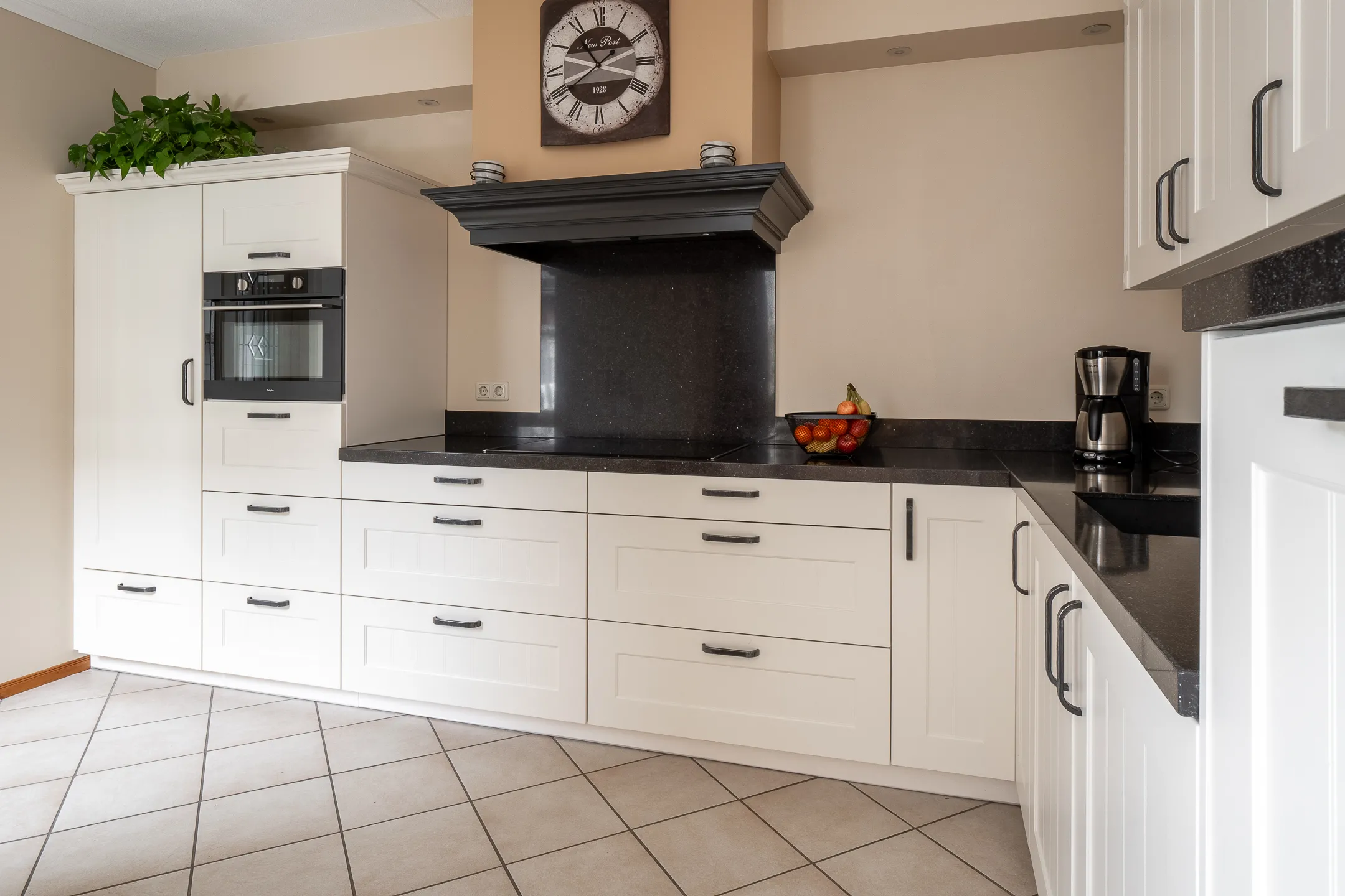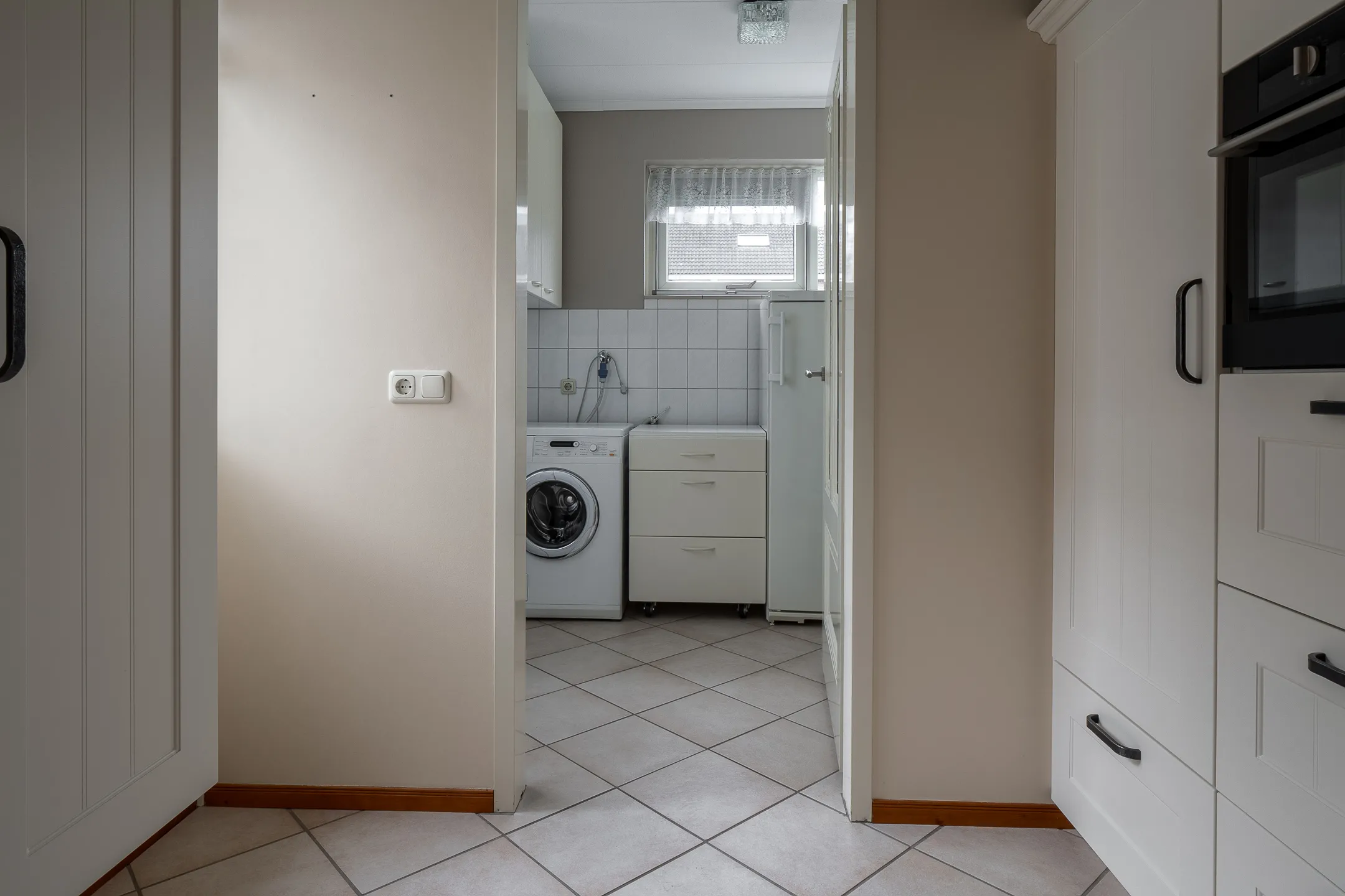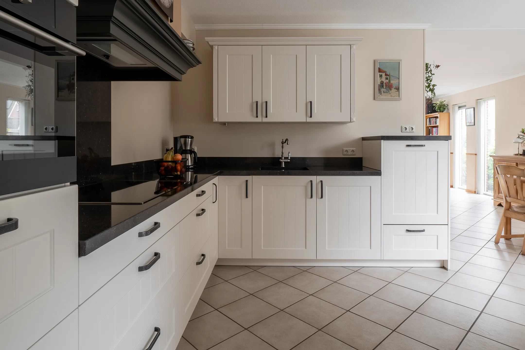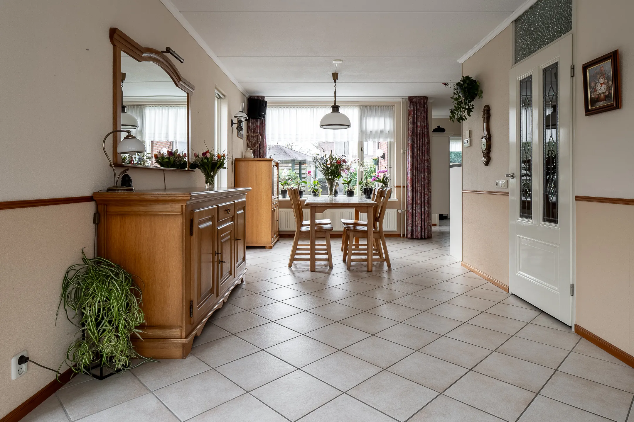 Overdekte entree, ruime hal met trapopgang, garderobe en modern wandtoilet met fontein. De royale L-vormige woonkamer heeft veel lichtinval en biedt uitzicht op de tuin. De halfopen keuken is voorzien van alle comfortabele inbouwapparatuur en vormt samen met de ruime bijkeuken een praktische en gezellige leefruimte. Via de achteringang is de tuin eenvoudig te bereiken.