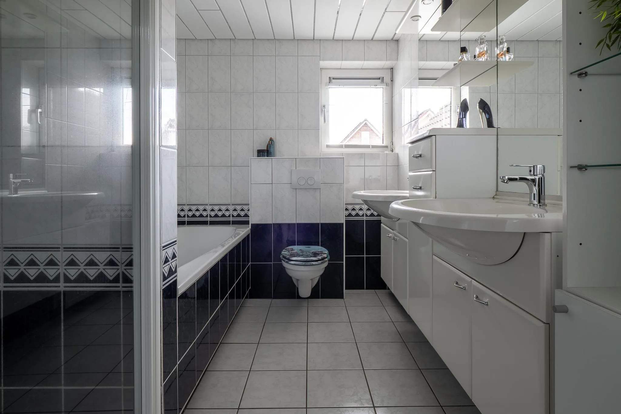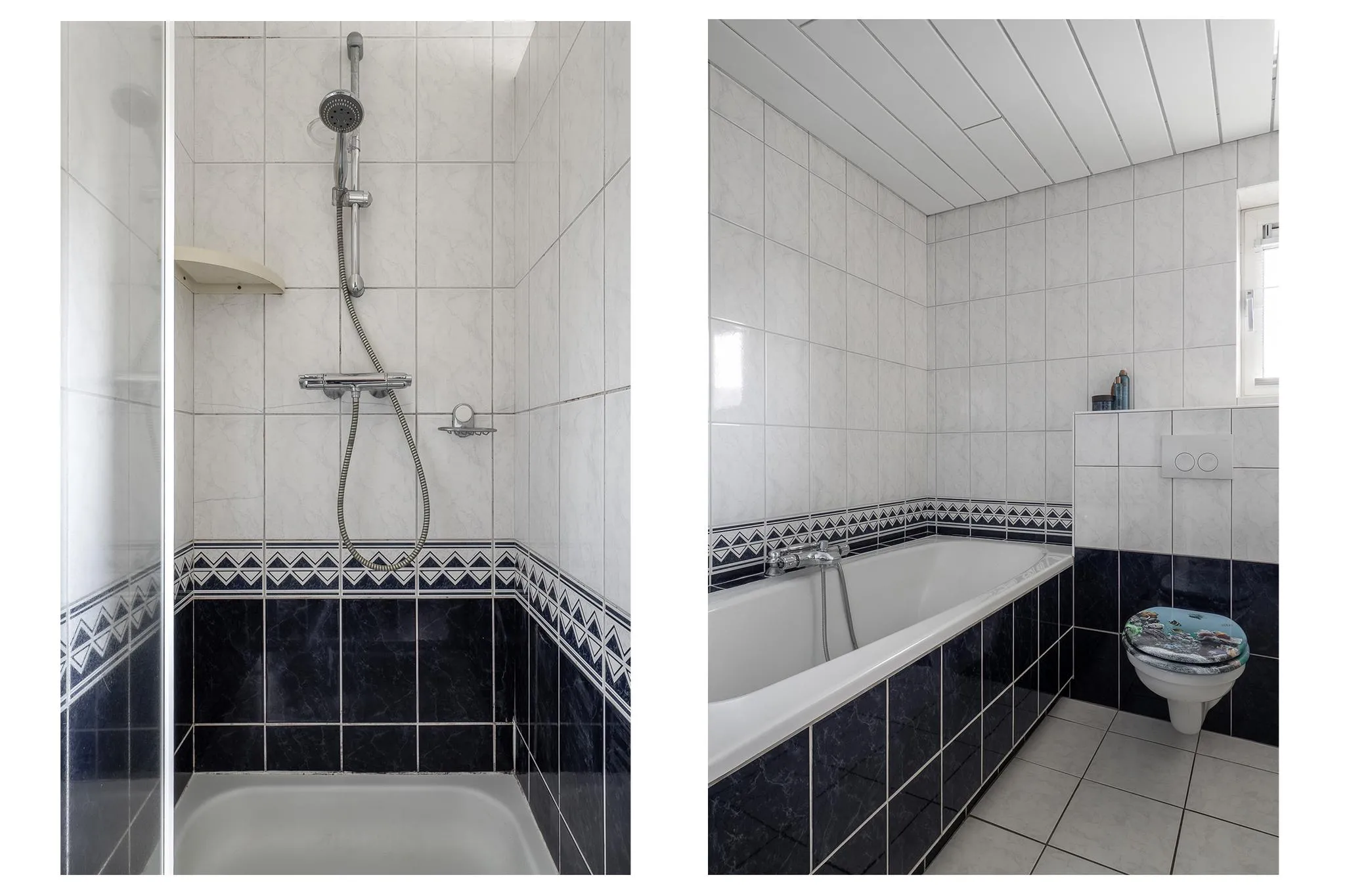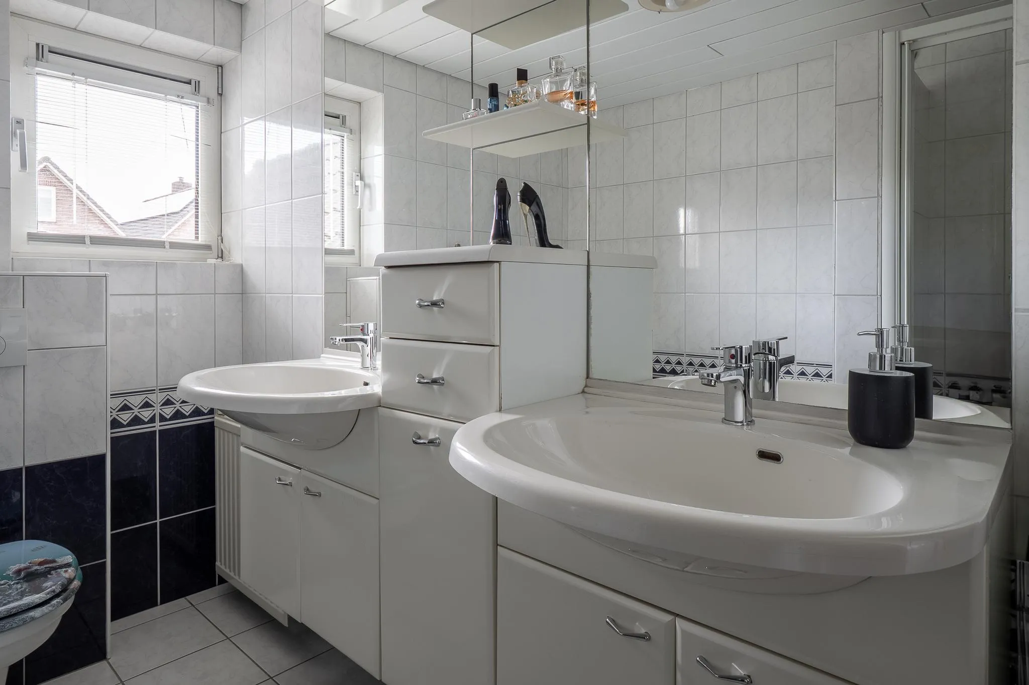 - Badkamervoorzieningen Ligbad, toilet, douche, dubbele wastafel