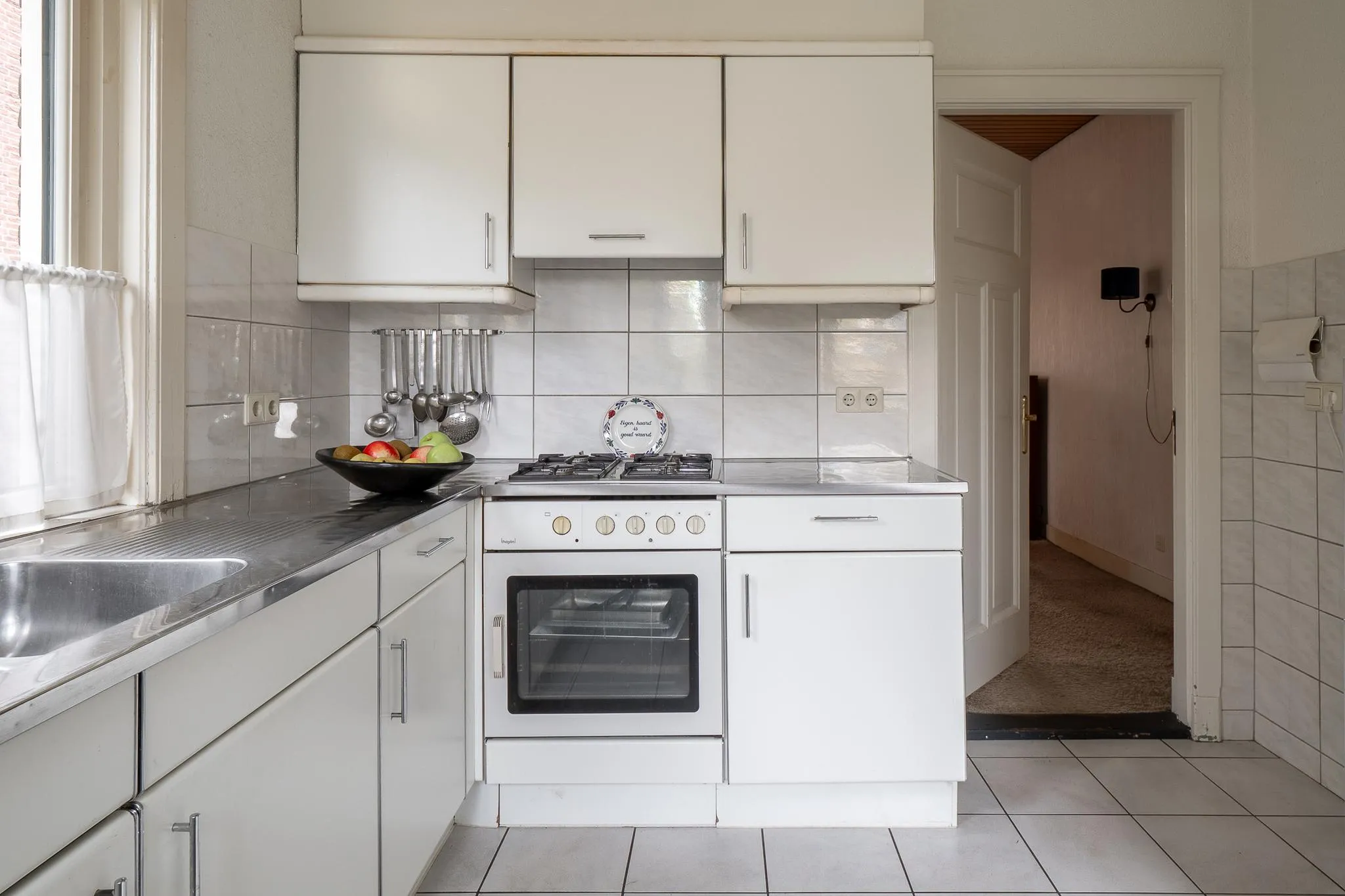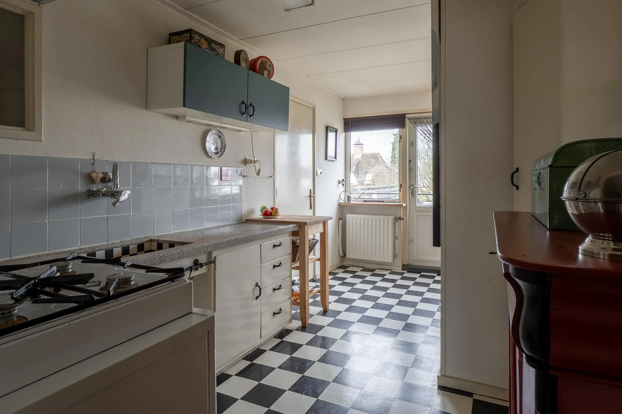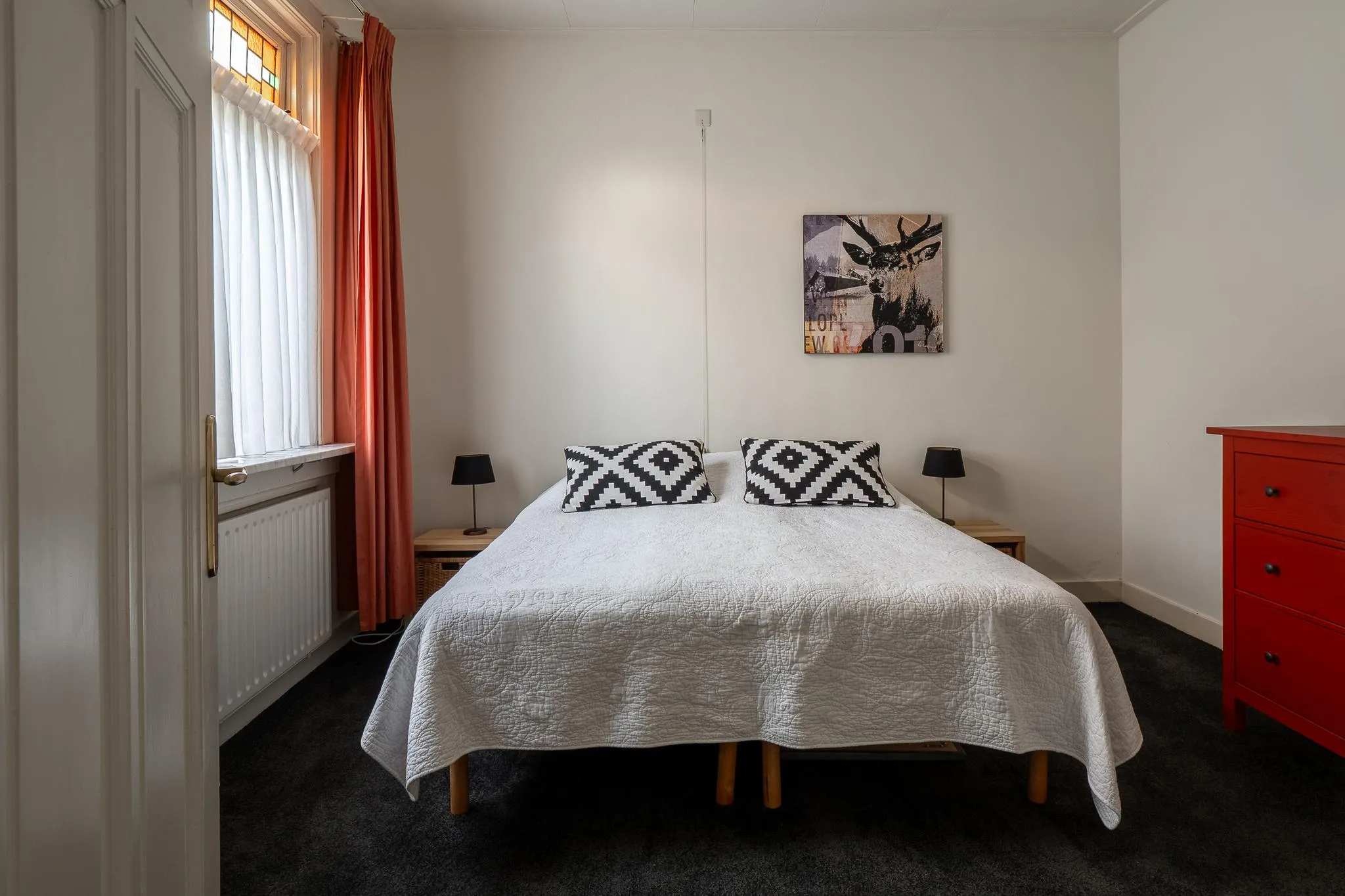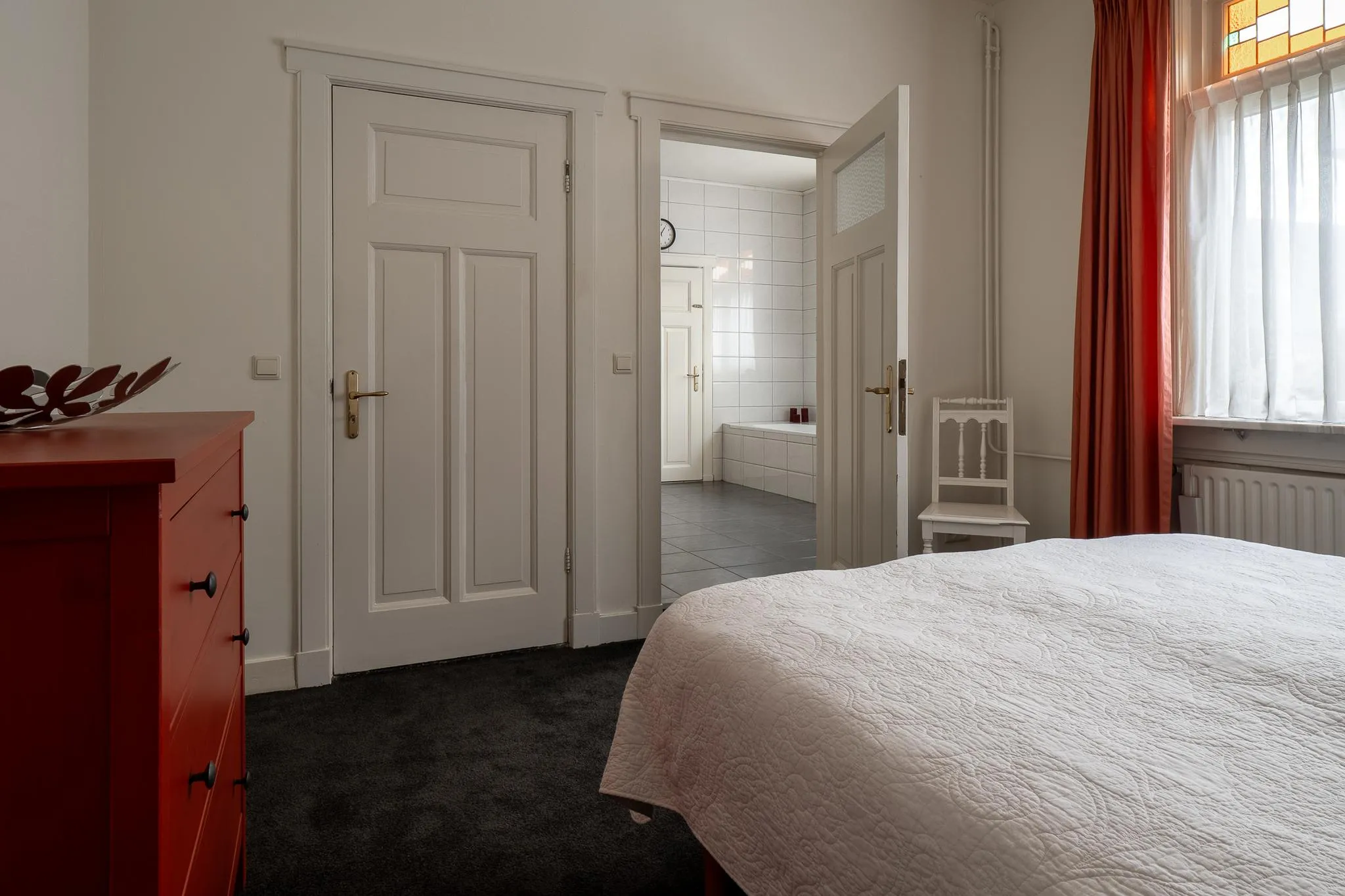 1e verdieping: overloop met vaste kast, toilet met fontein en douchehoek, slaapkamer (2) met 2 vaste kasten, slaapkamer (3) met 2 vaste kasten, slaapkamer (4), keuken met keukenblok en vaste kast, slaapkamer (5), bijkeuken met witgoedaansluiting en vaste kast. Vanuit de keuken is het ruime dakterras bereikbaar met een separate trap naar de tuin.