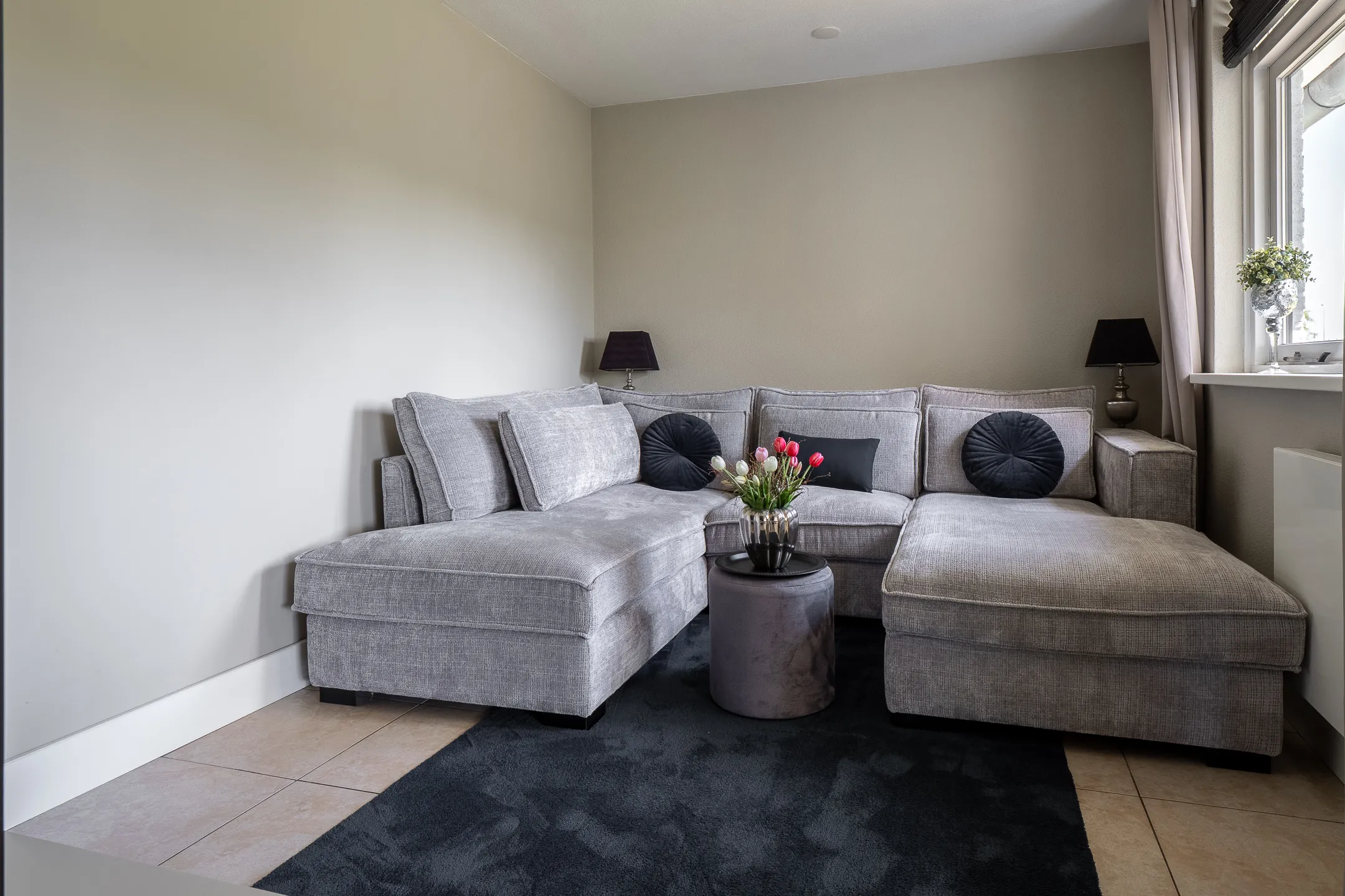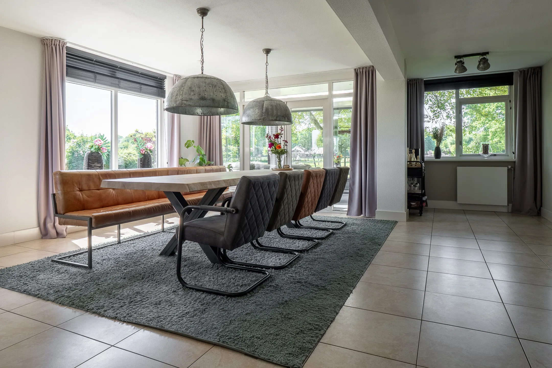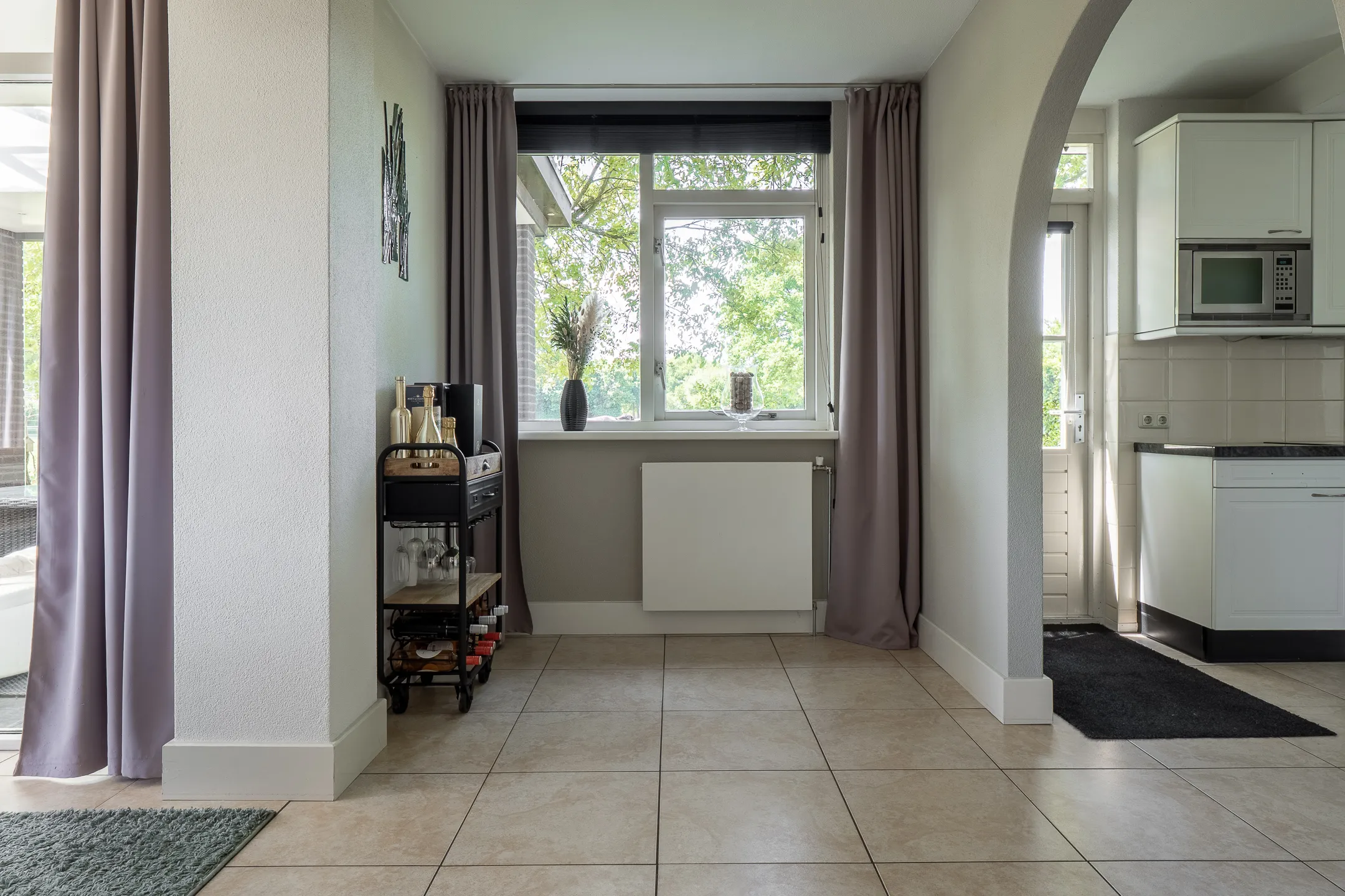 De woning beschikt over slaap- en badvoorzieningen op de begane grond, wat het comfortabel maakt voor wie gelijkvloers wil wonen. De ruime woon- en eetkamer heeft een prettige lichtinval en staat in verbinding met de half-open keuken. Direct achter de keuken bevindt zich een praktische bijkeuken, ideaal voor extra opslag en huishoudelijk gemak.