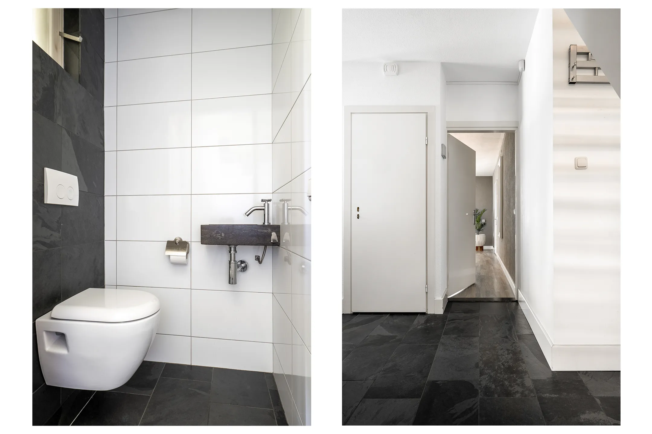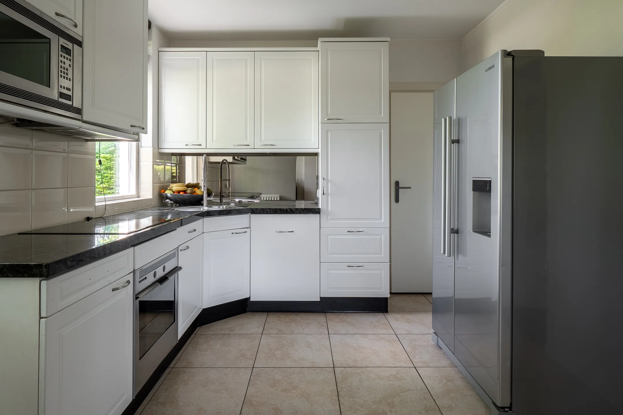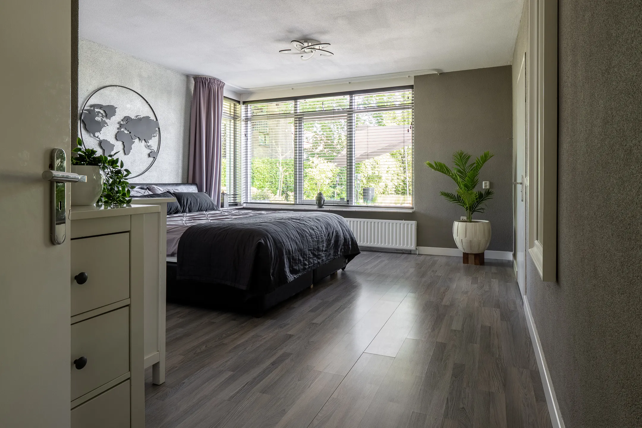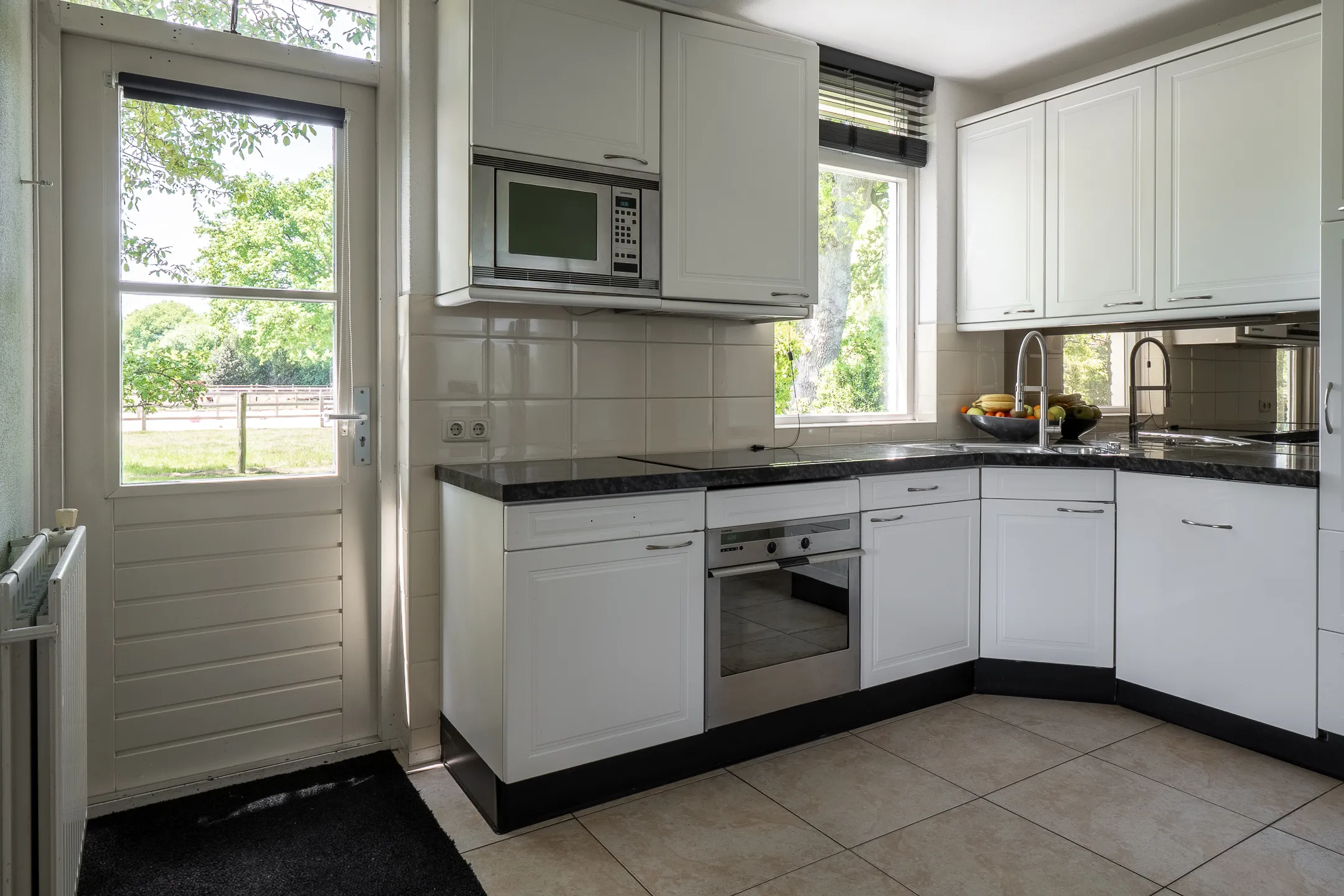 De woning beschikt over slaap- en badvoorzieningen op de begane grond, wat het comfortabel maakt voor wie gelijkvloers wil wonen. De ruime woon- en eetkamer heeft een prettige lichtinval en staat in verbinding met de half-open keuken. Direct achter de keuken bevindt zich een praktische bijkeuken, ideaal voor extra opslag en huishoudelijk gemak.