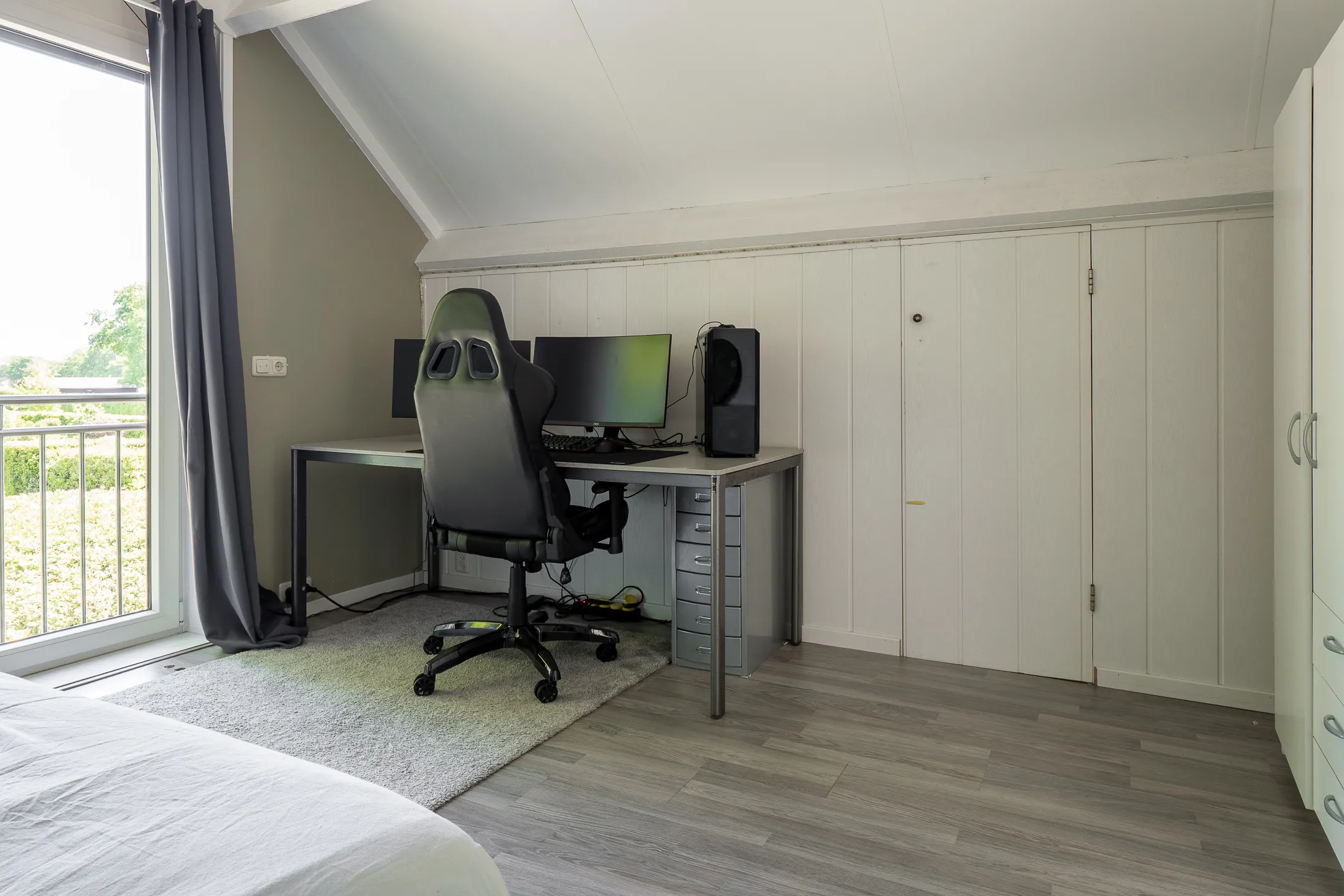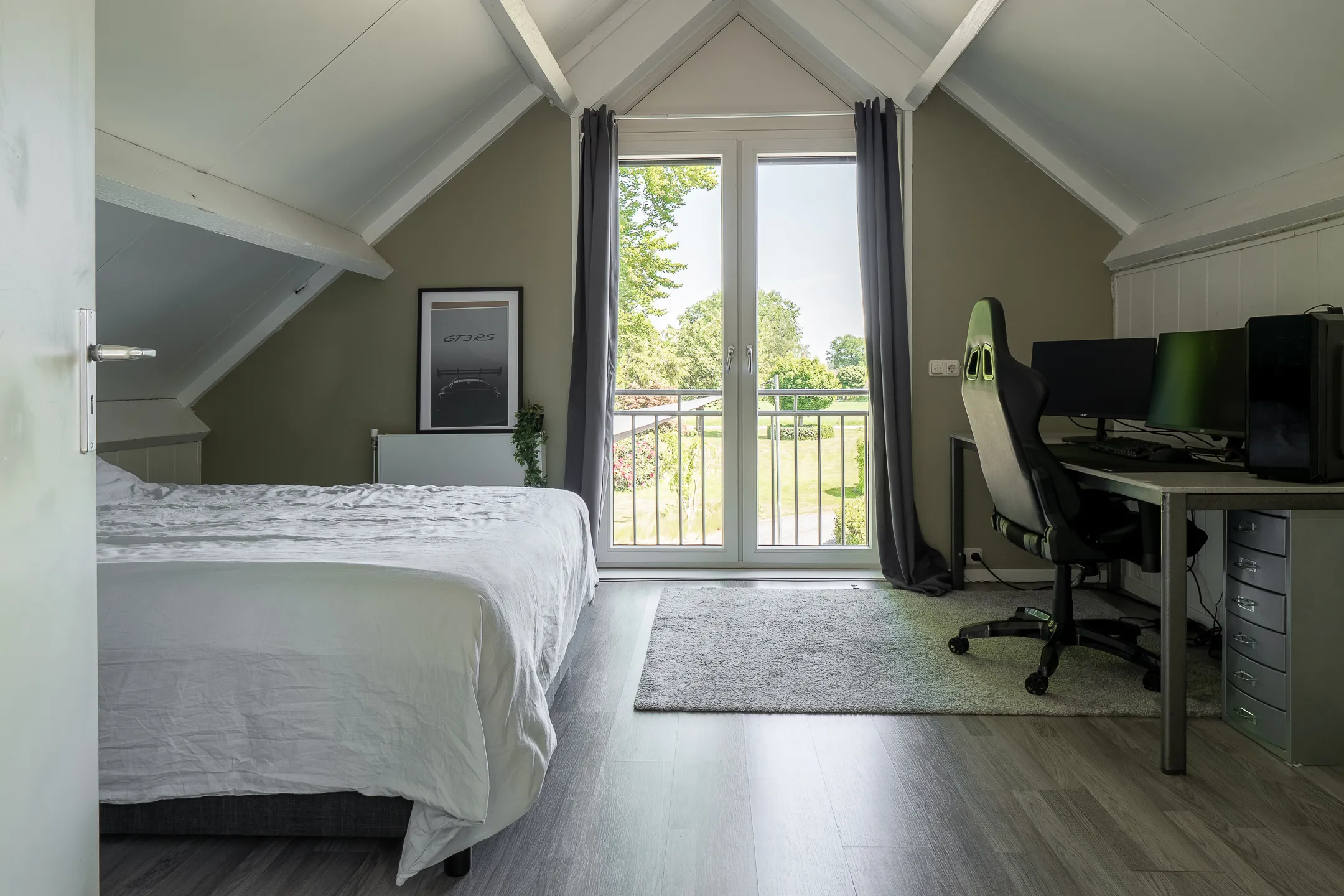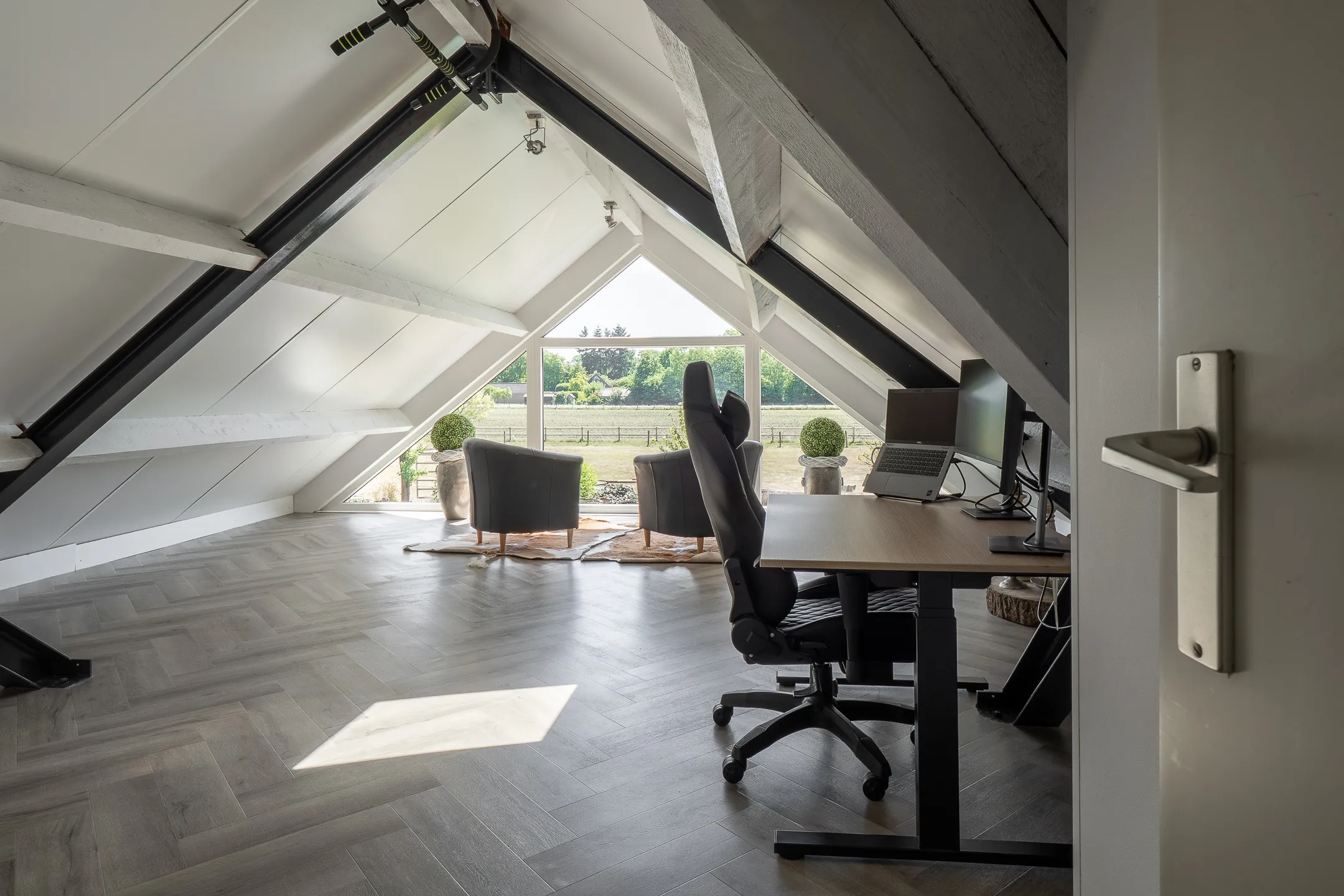 Het vrijstaande bijgebouw met openslaande terrasdeuren biedt talloze mogelijkheden, zoals kantoor, atelier, gastenverblijf of praktijkruimte.