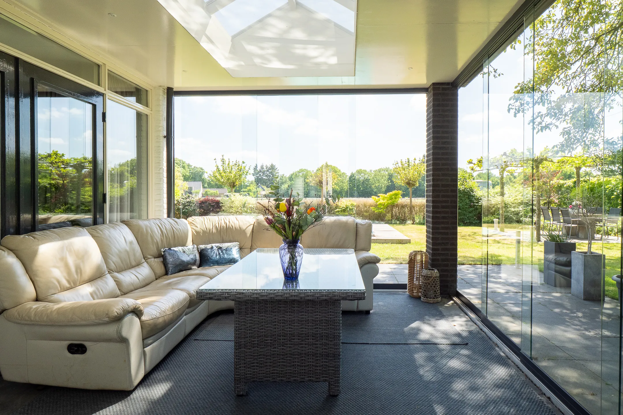 Omgeving: terrasoverkapping met glazen wanden, externe multifunctionele ruimte met overdekte parkeergelegenheid.