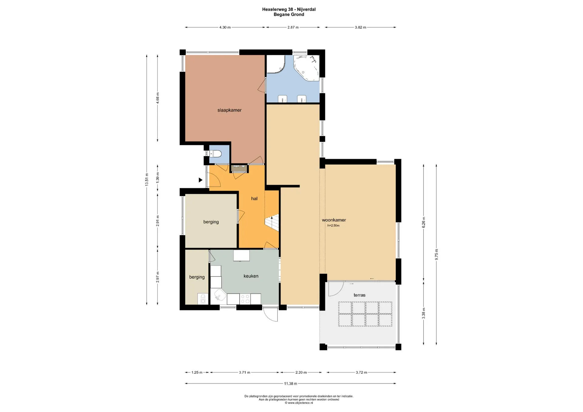 Begane grond: hal/entree met meterkast en trapopgang, toilet met fontein, kantoorruimte, slaapkamer (1) annex badkamer v.v. hoekbad, douche, wastafels en toilet, half open keuken v.v. inbouwapparatuur, bijkeuken, ruime woon-/eetkamer met houthaard en toegang tot het zonneterras.