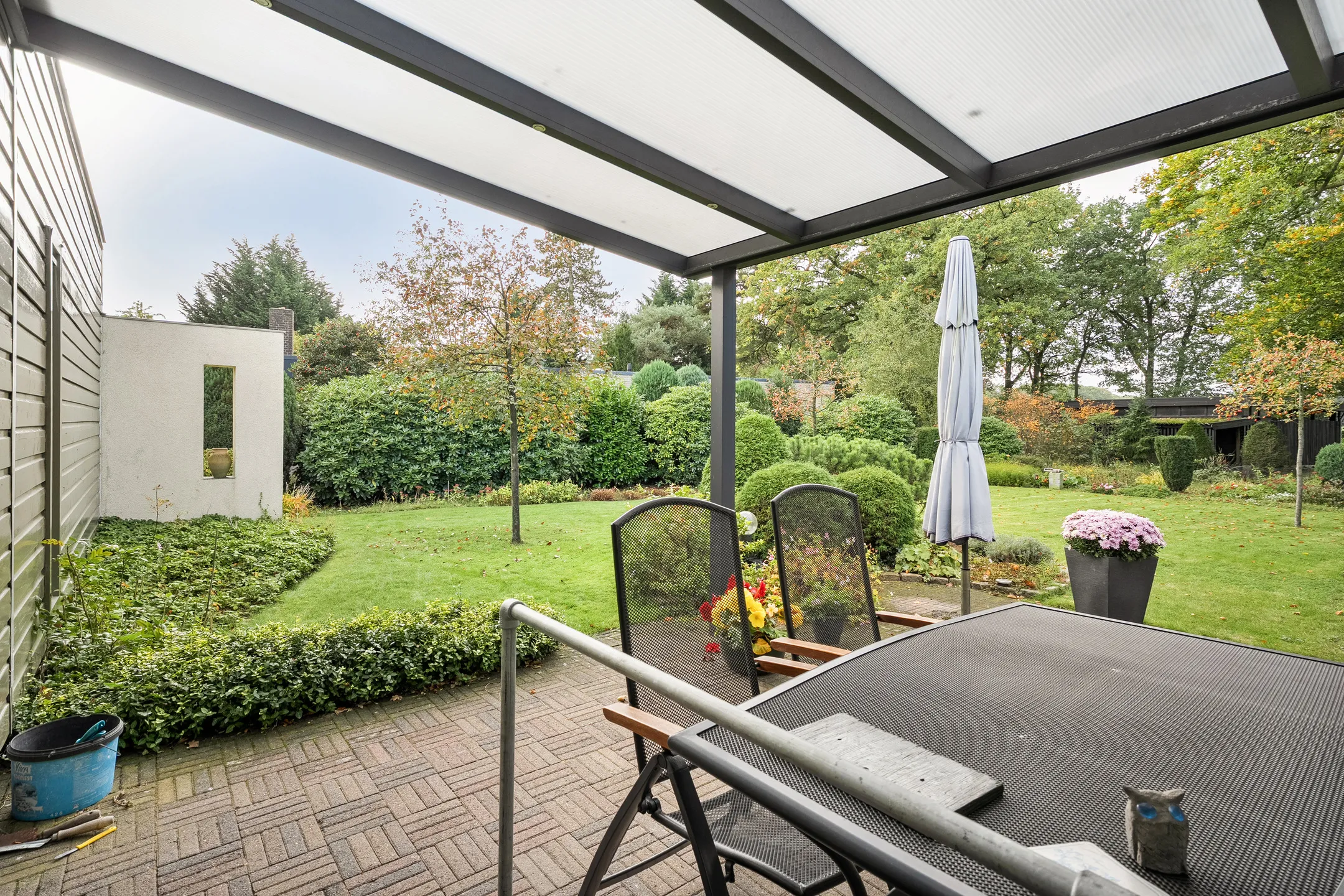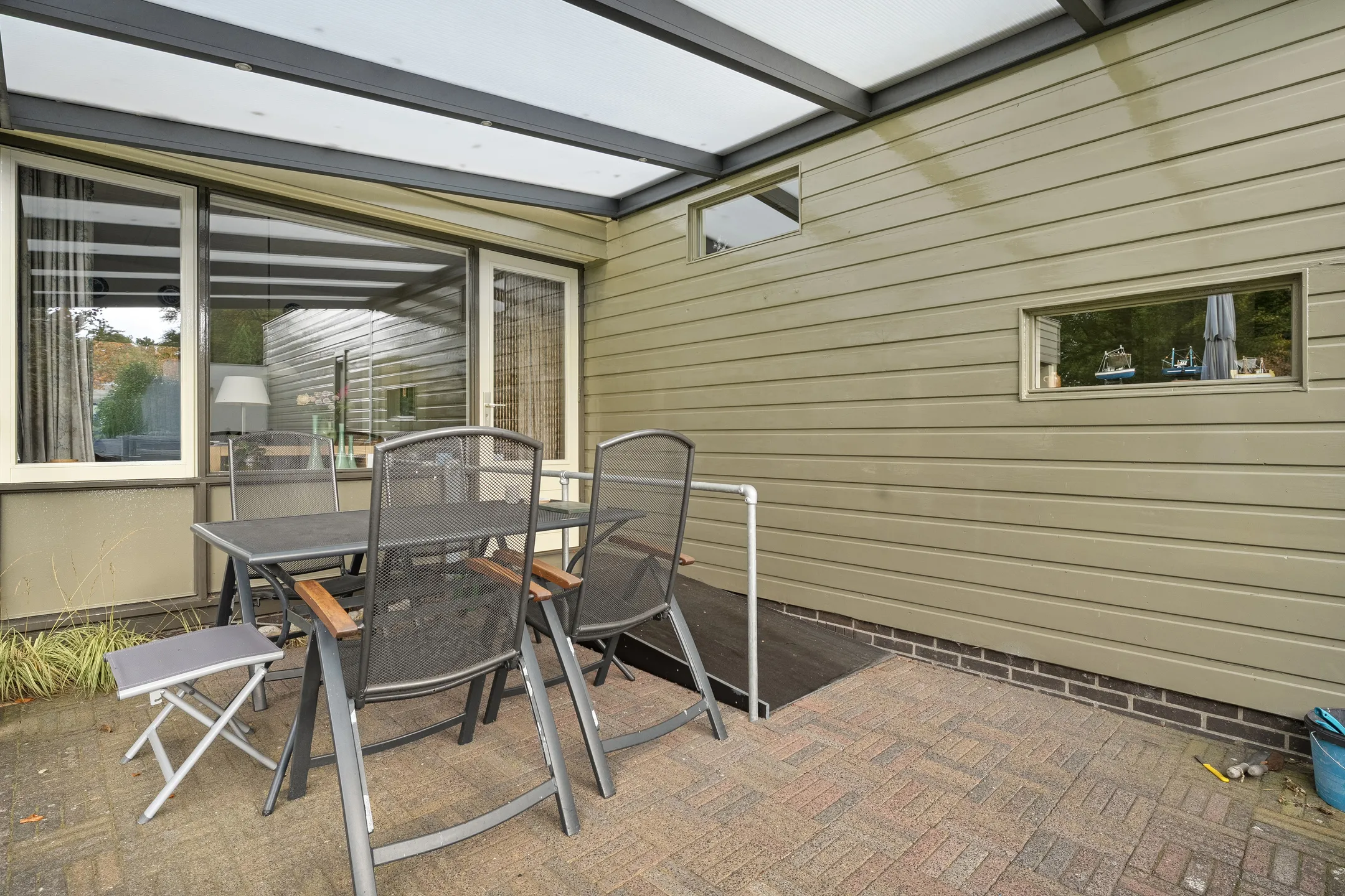 Achterin de tuin staat een houten berging annex garage met carport die aaneen gebouwd is met de naaste buren. Deze is voorzien van elektra en is via het pad aan de achterzijde met auto en bijvoorbeeld camper of caravan te bereiken.