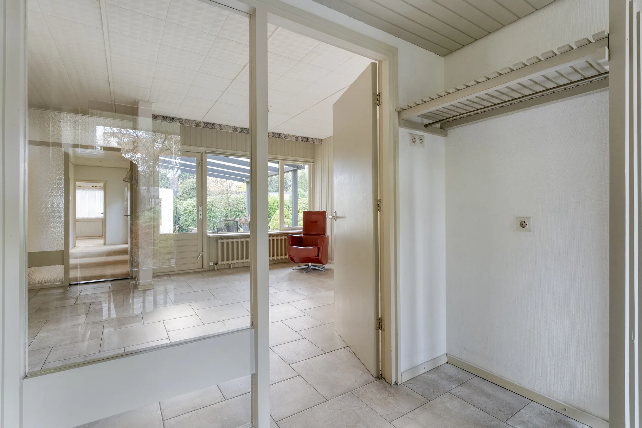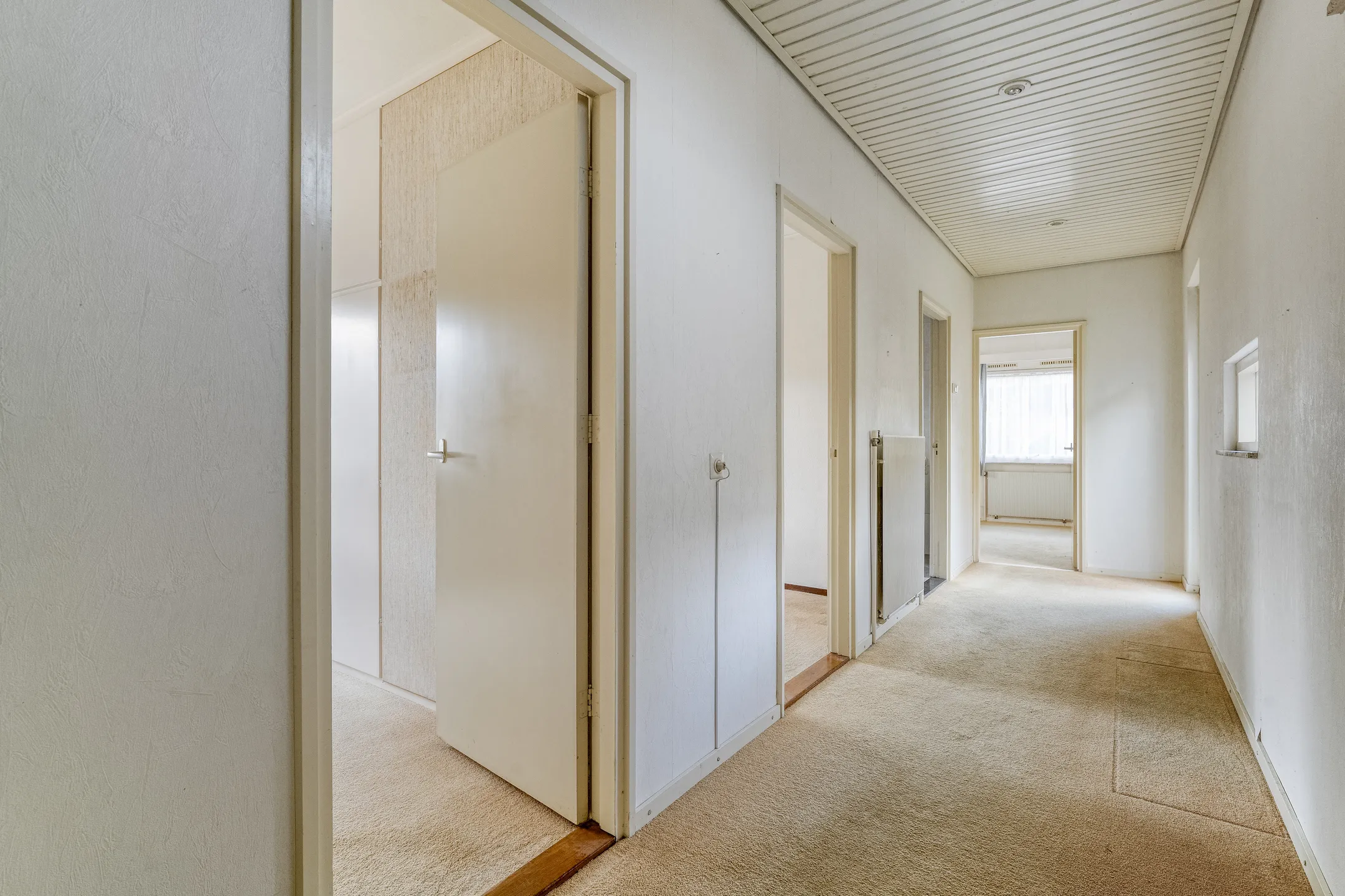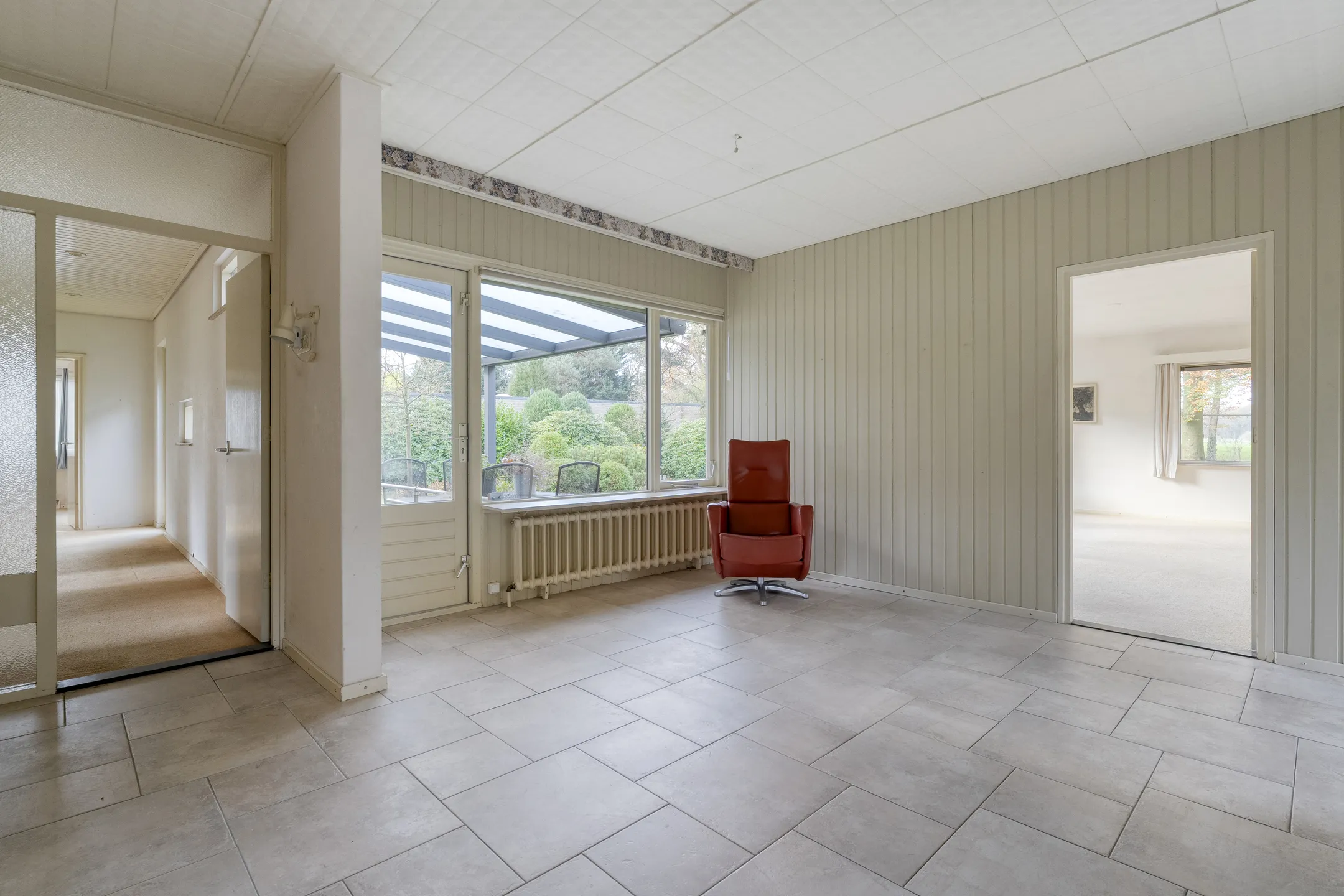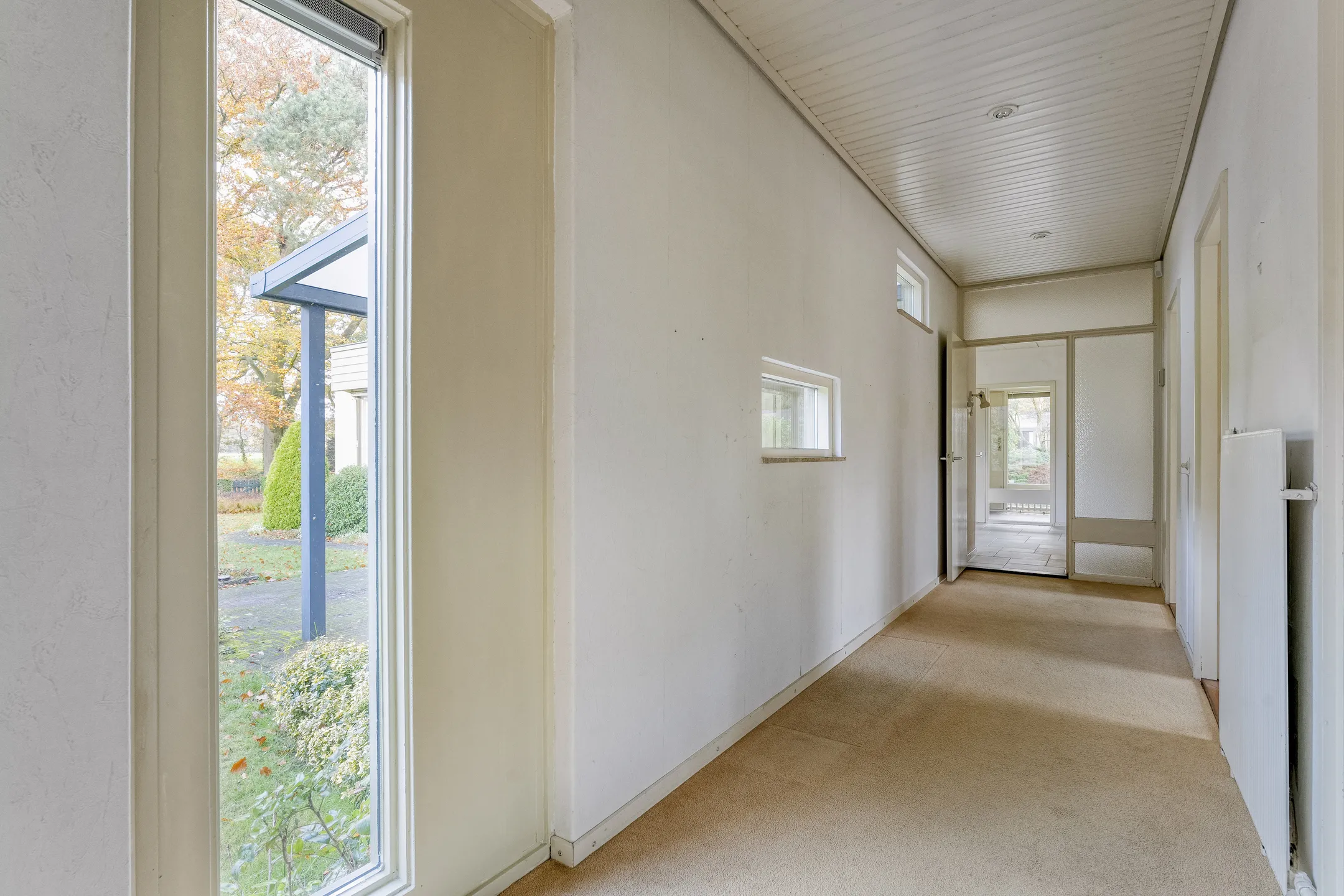 Begane grond: Overdekte entree, hal met garderobe, meterkast, toilet met fonteintje, doorloop naar eetkamer in het hart van de woning met loopdeur naar overdekt terras, doorloop naar woonkamer voorzien van schouw met open haard, slaapkamer met aansluitende werk/hobbykamer. Vanuit de eetkamer is tevens toegang naar aan de ene zijde de eetkeuken met aansluitend bijkeuken voorzien van witgoedaansluitingen, vaste kast, trapopgang naar kelder en loopdeur naar overdekte entree. Aan de andere zijde is middels een gang de vleugel toegankelijk met daarin de badkamer voorzien van dubbele wastafel in meubel, inloopdouche en toilet alsmede drie slaapkamers die allen zijn voorzien van vaste kastenwanden.