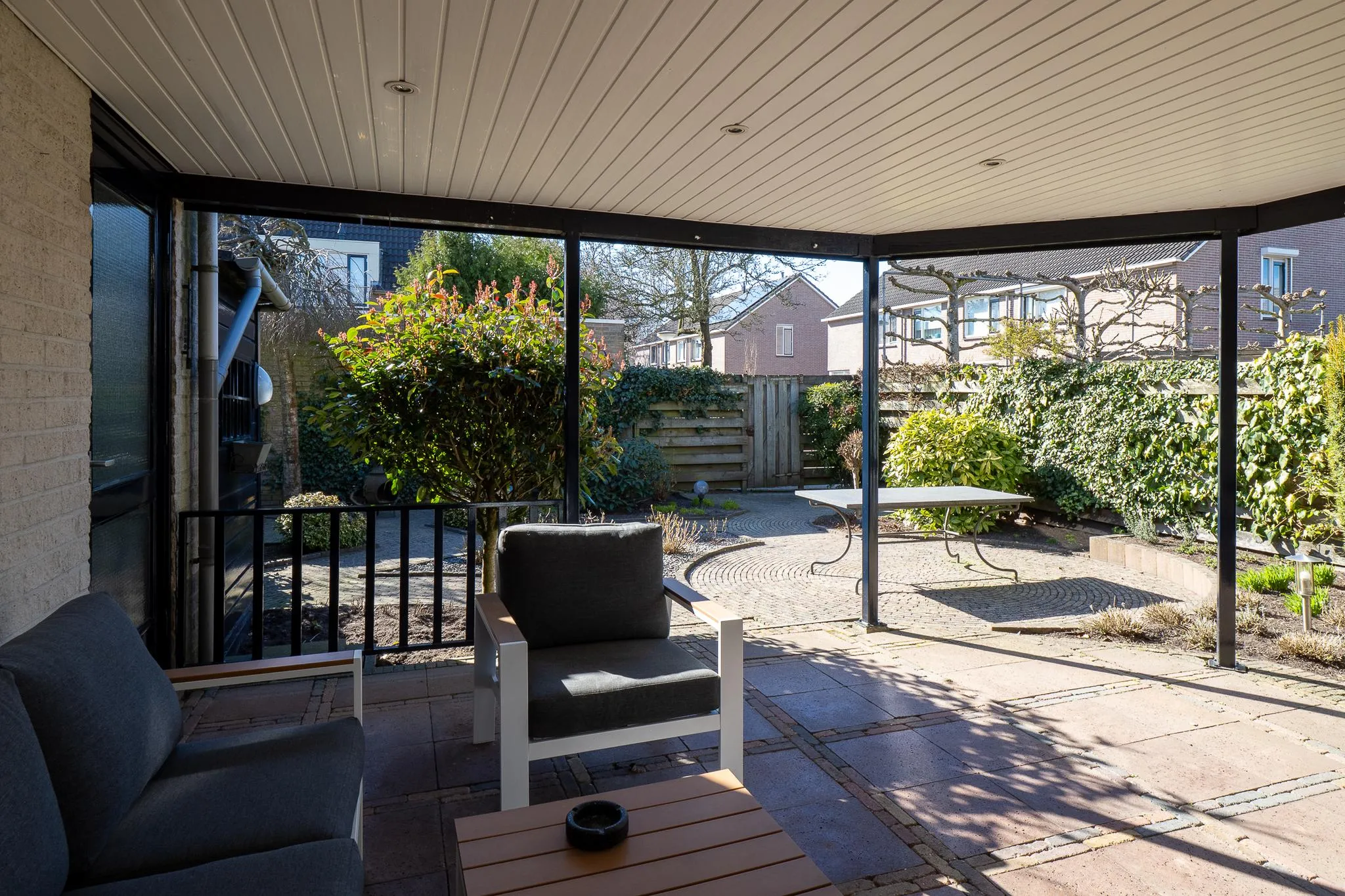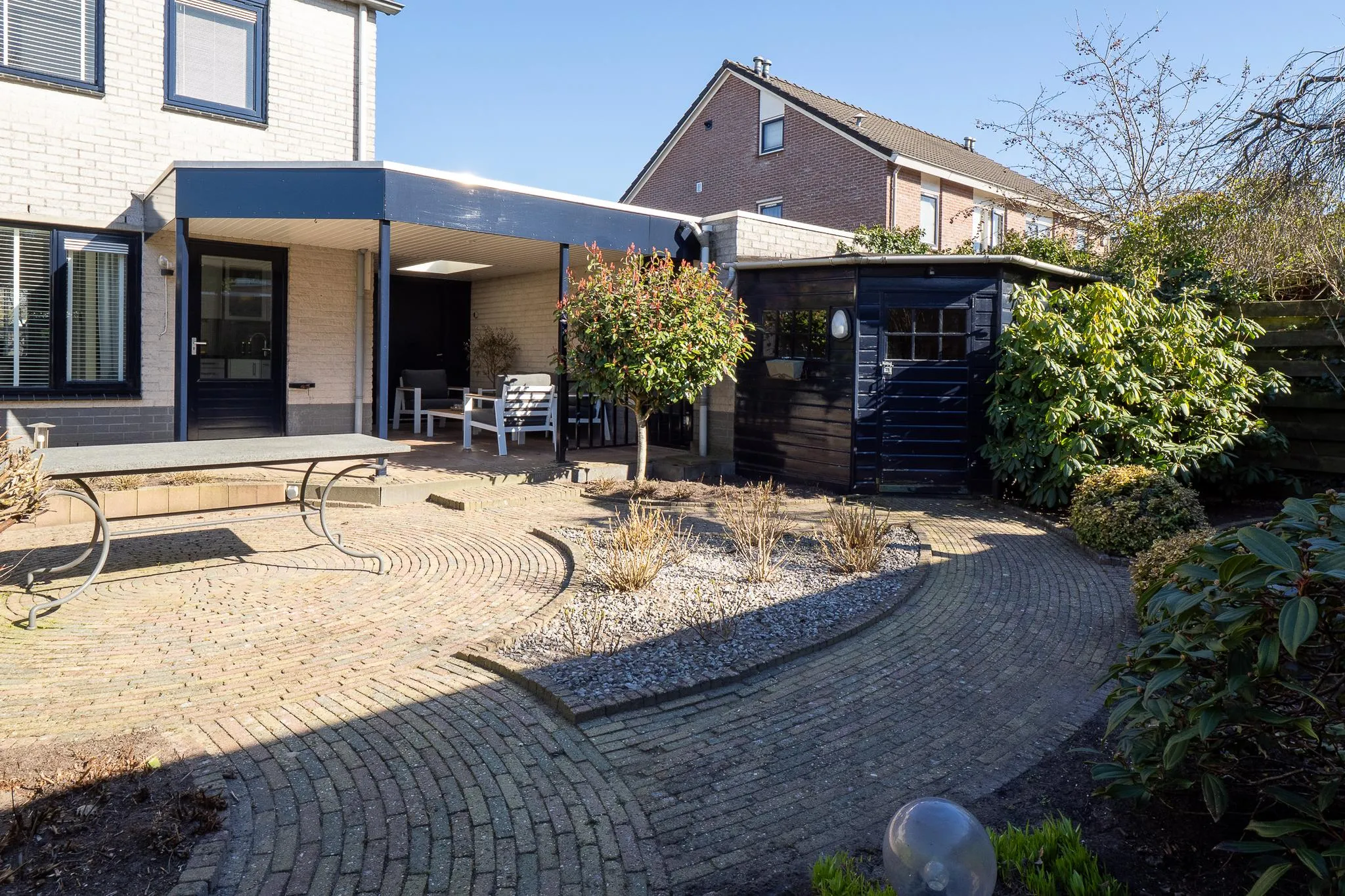 De woning biedt verrassend veel ruimte, met vier volwaardige slaapkamers en een zolderverdieping die bereikbaar is via een vaste trap. De lichte woonkamer sluit aan op een open keuken en biedt uitzicht op de achtertuin. Hier kunt u heerlijk ontspannen onder de ruime overkapping, terwijl de vrijstaande garage en het houten tuinhuis zorgen voor extra opslag- en werkruimte.