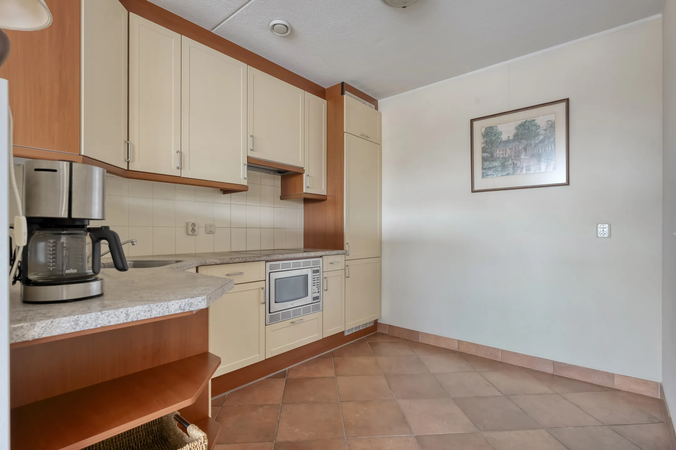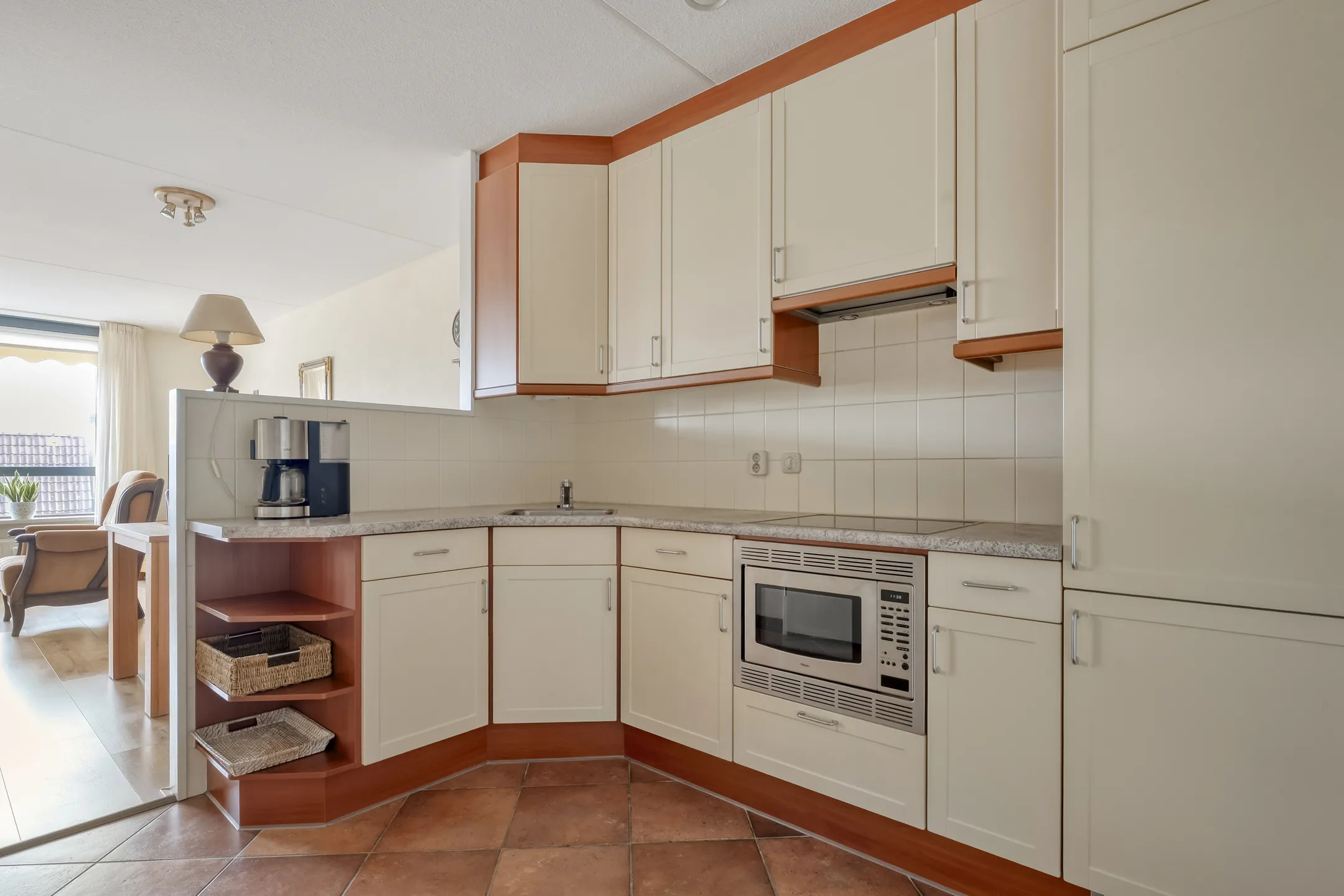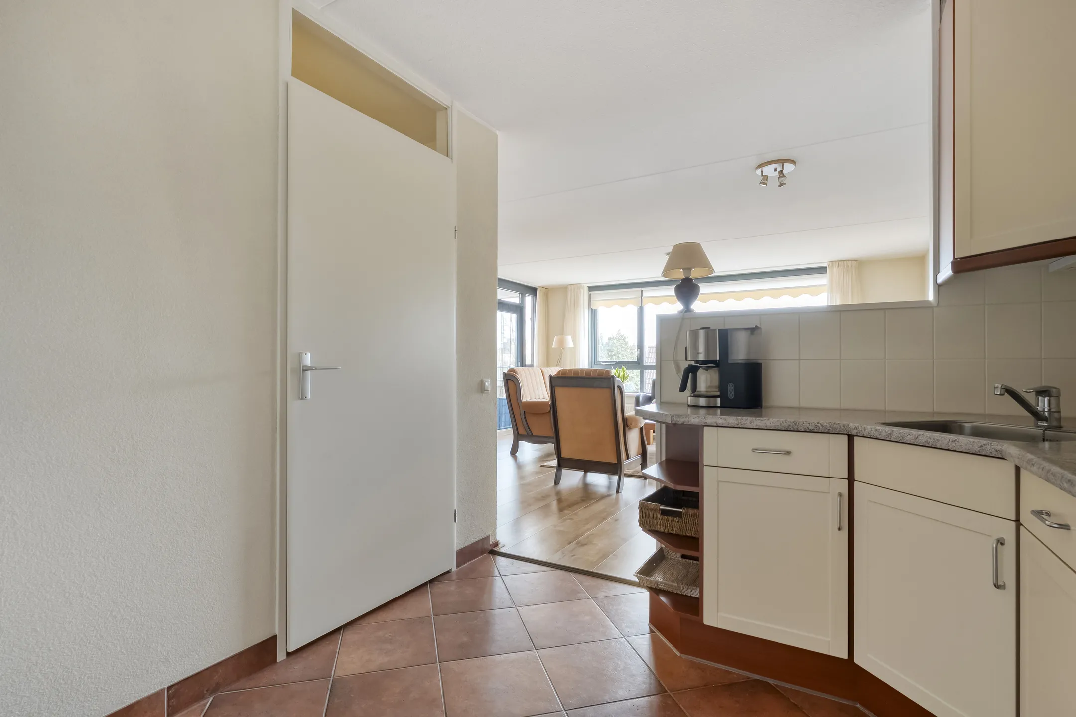 Het appartement beschikt over een prettige en opvallend lichte woonkamer met voldoende ruimte voor een gezellige zit- en eethoek. Vanuit hier is er toegang tot het balkon. De halfopen keuken sluit hier mooi op aan en vormt een praktische en centrale plek in de woning. Een groot pluspunt is de aparte bijkeuken, ideaal voor extra opslag, het drogen van de was en voorzien van een uitstortgootsteen.