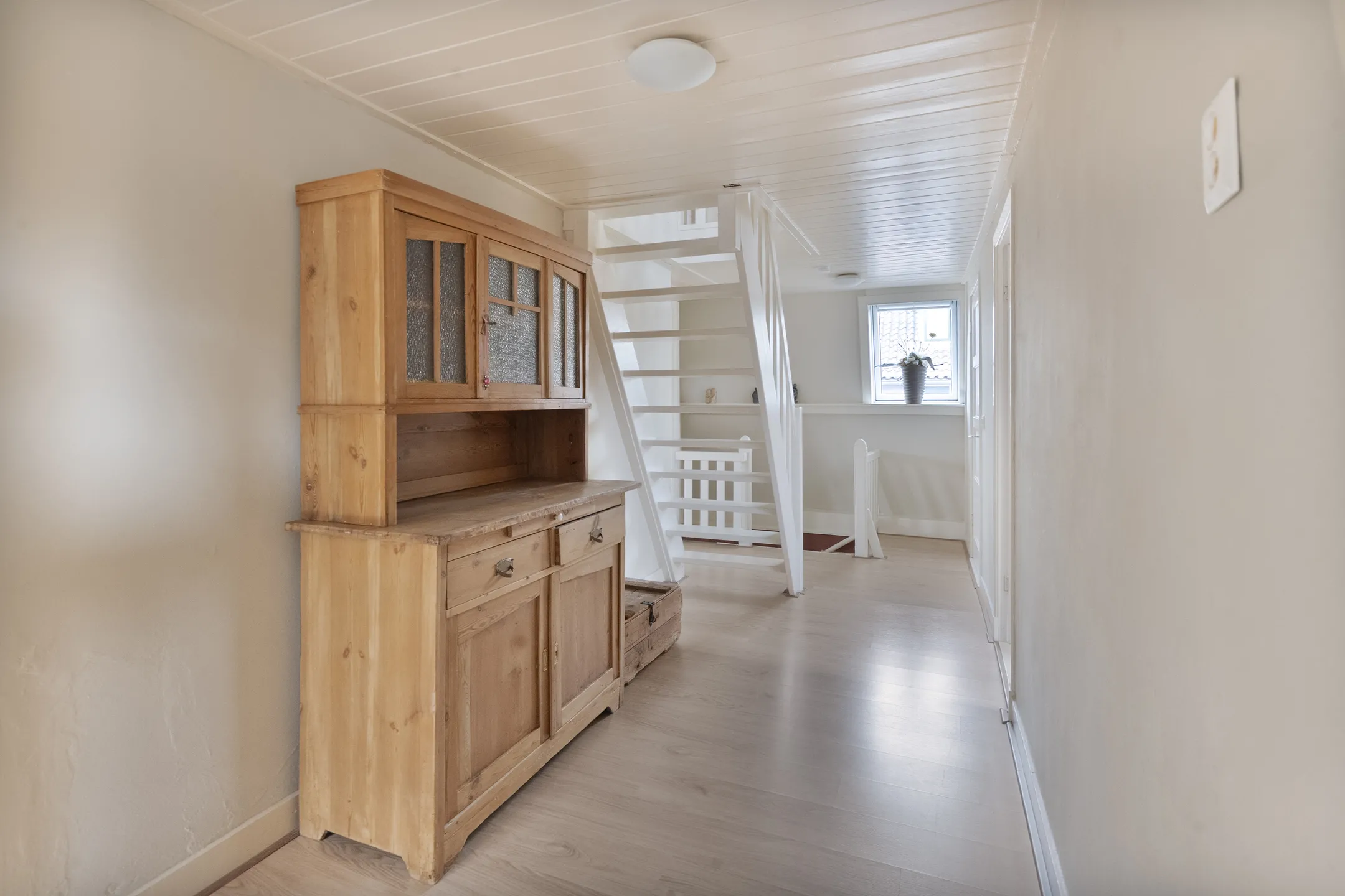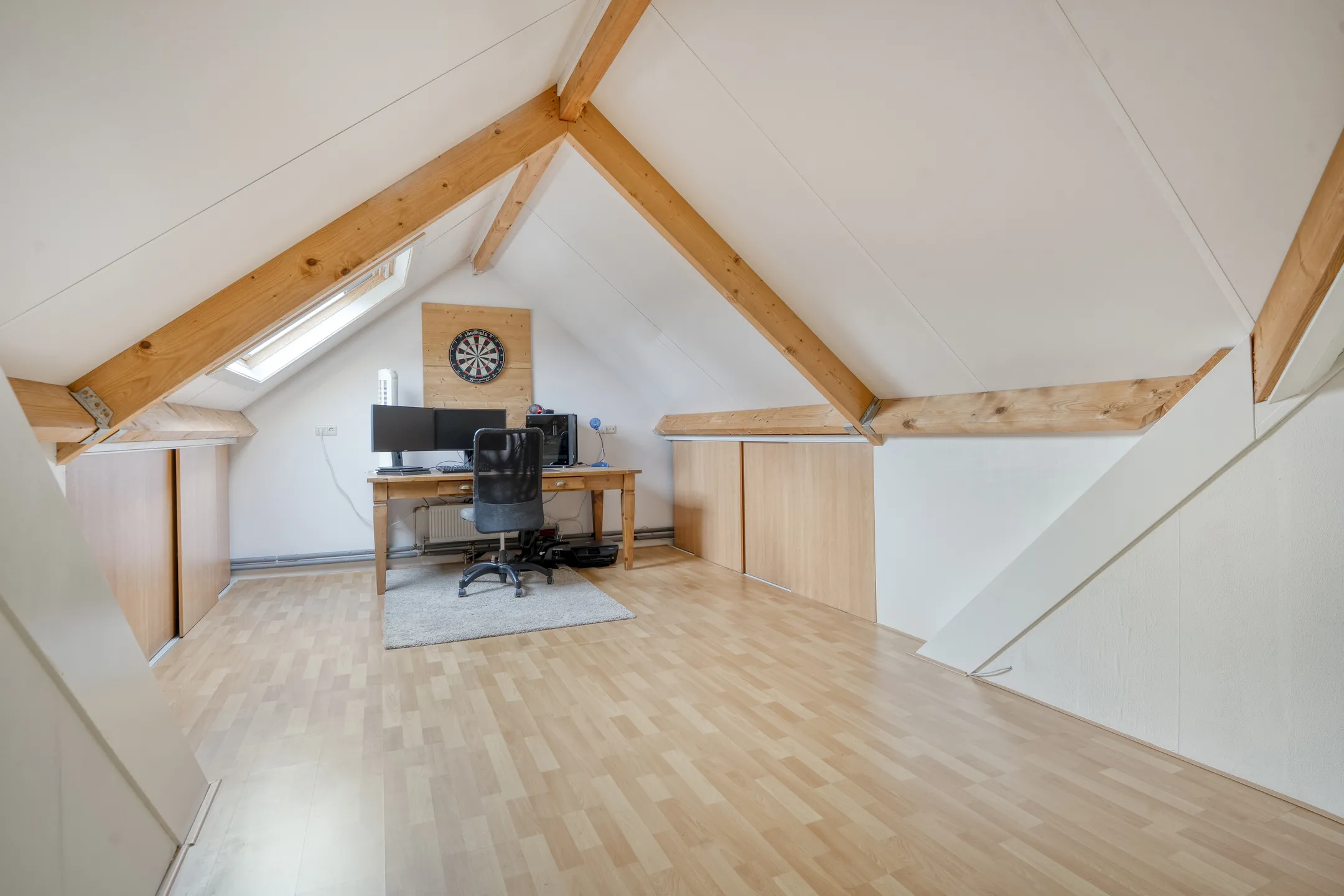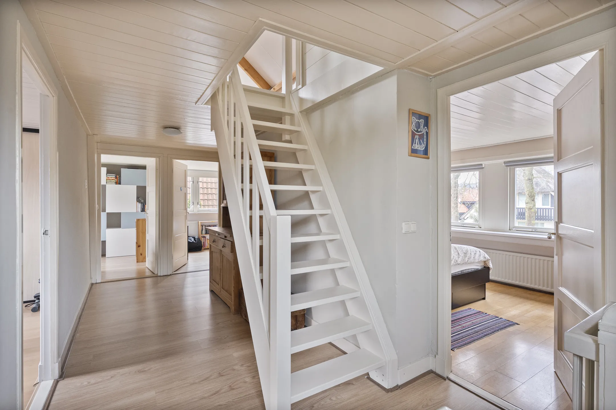 Vaste trap naar grote multifunctionele overloop met opbergruimte in knieschotten,