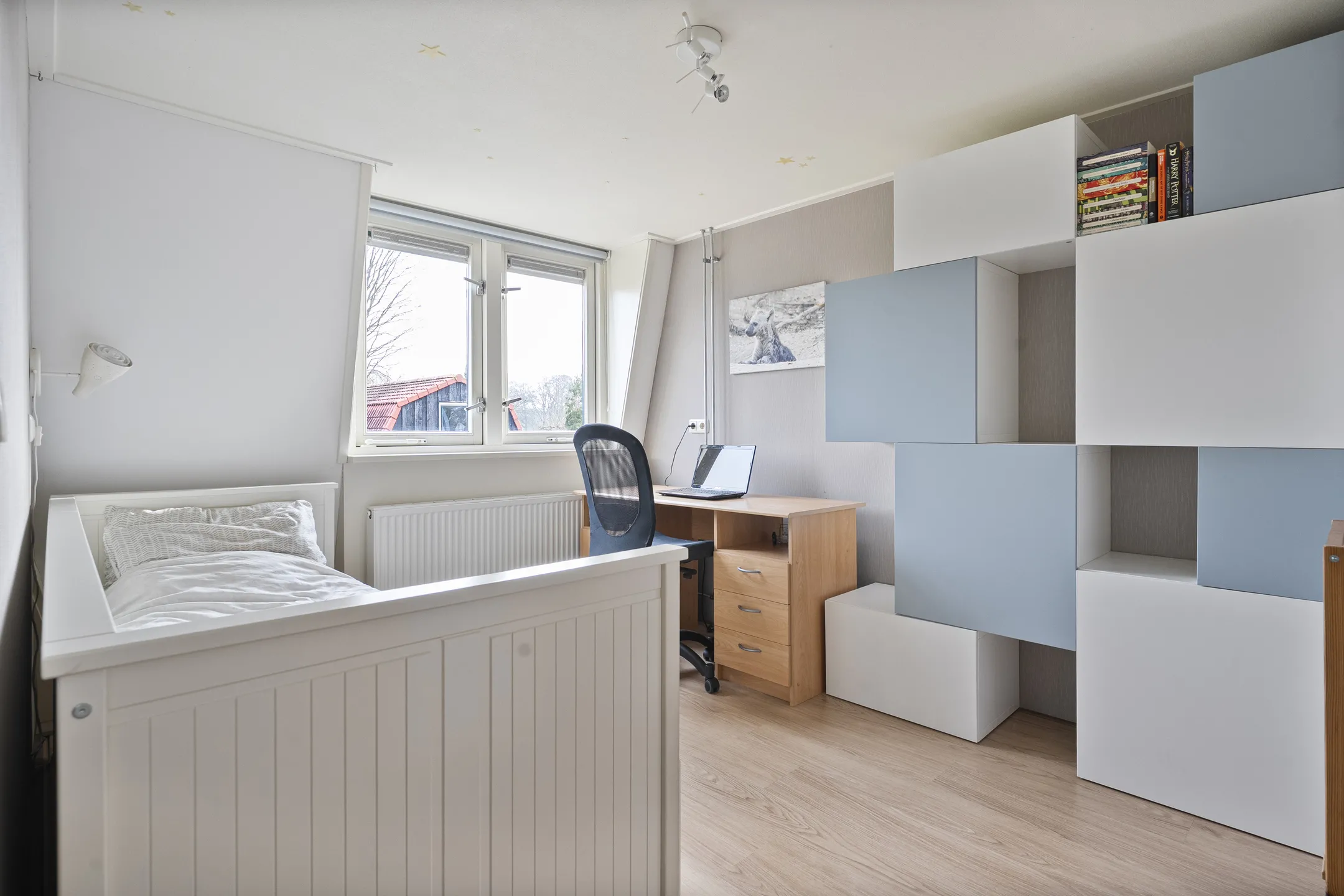 een thuiswerkplek met tuimelvenster, slaapkamer (5) met tuimelvenster, slaapkamer (6) met tuimelvenster.