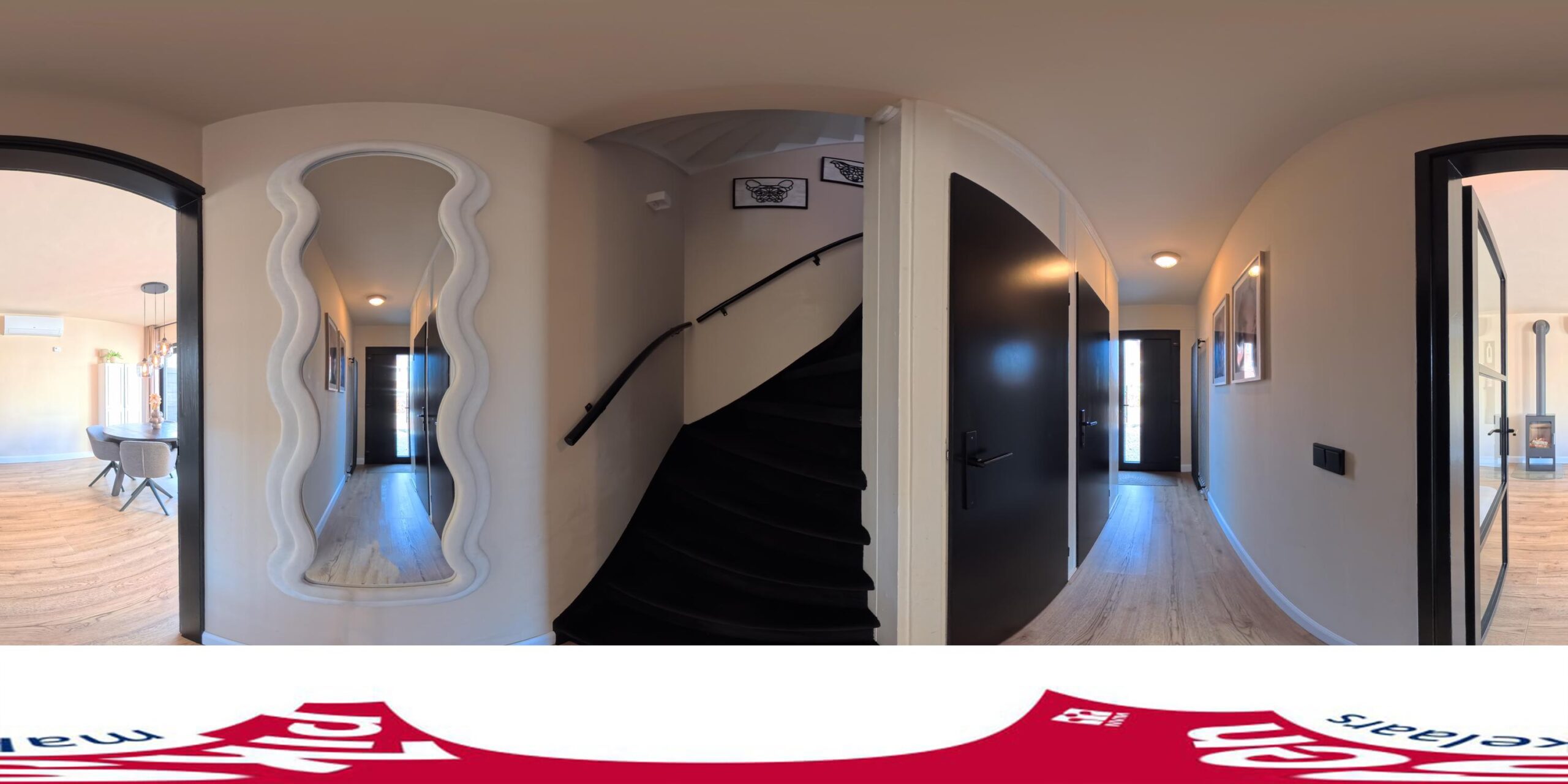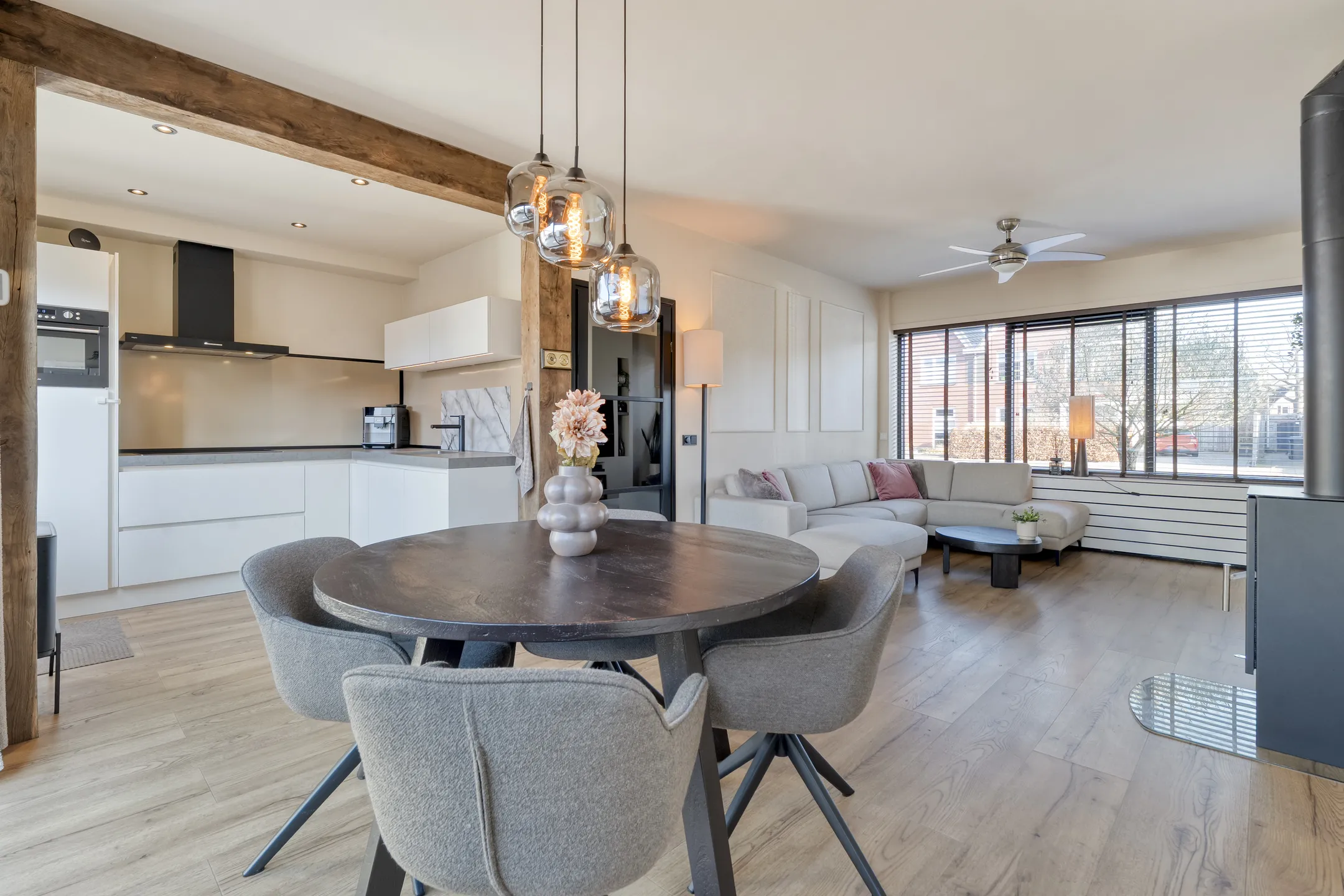 Begane grond: hal/entree, meterkast, trapkast, doorzonwoonkamer met cinewall en houtkachel, moderne keuken voorzien van vaatwasser, koelkast, combi-oven, inductiekookplaat en wasemkap.