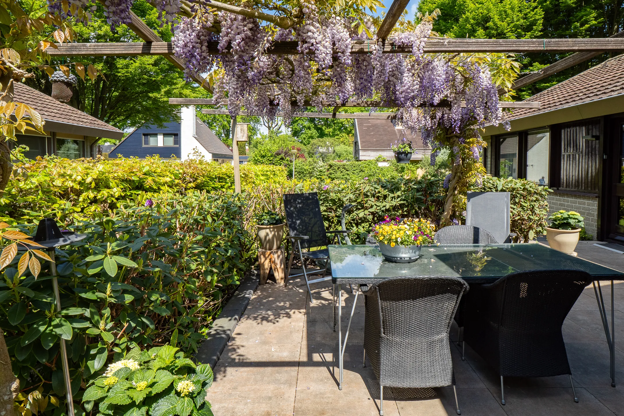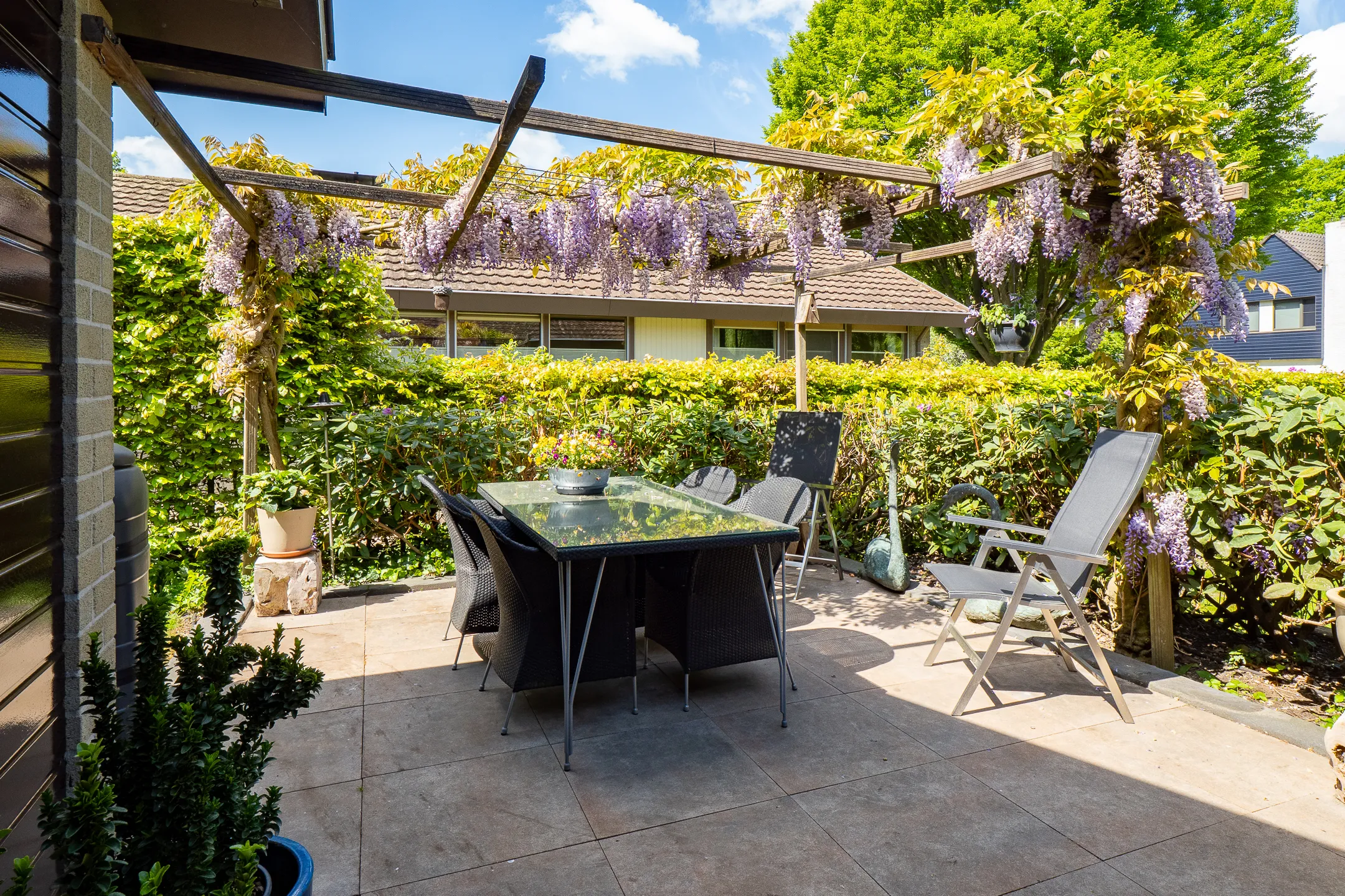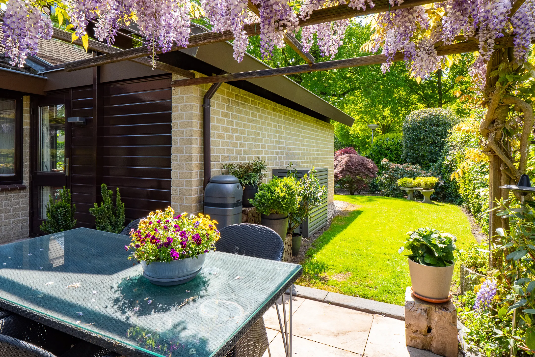 Aansluitend in stijl aangebouwde eetkamer met terrasdeur naar een luwte terras met pergola.
