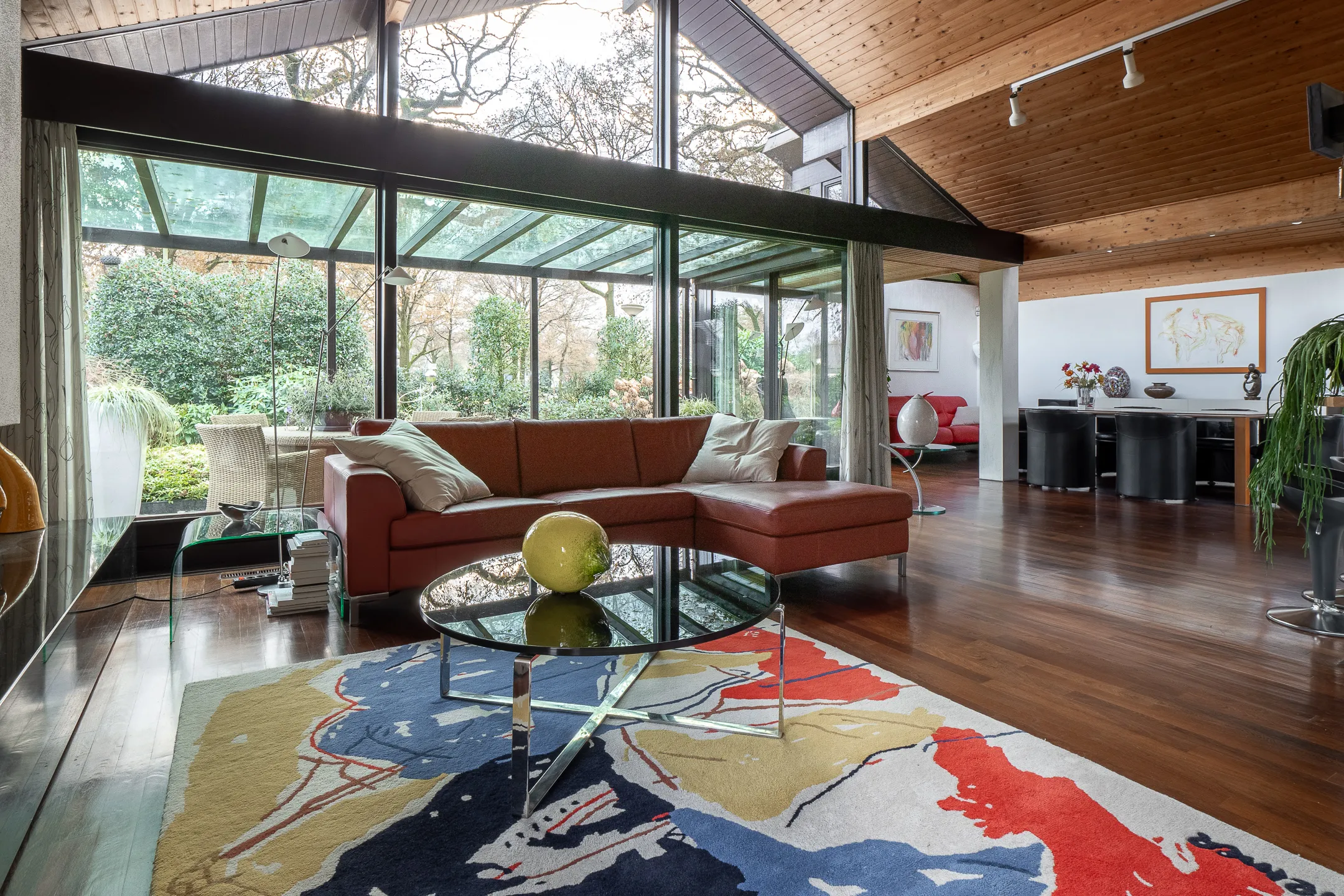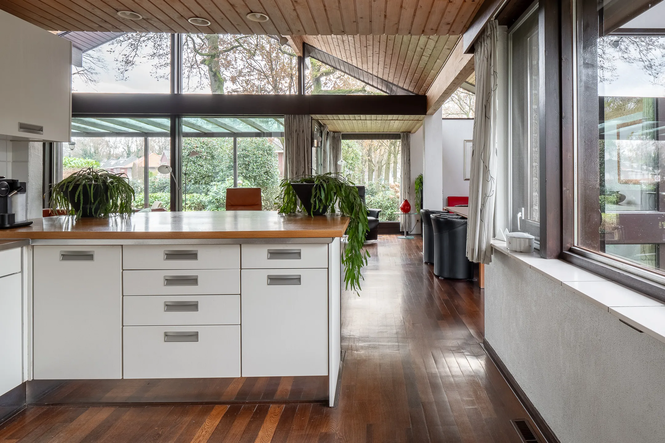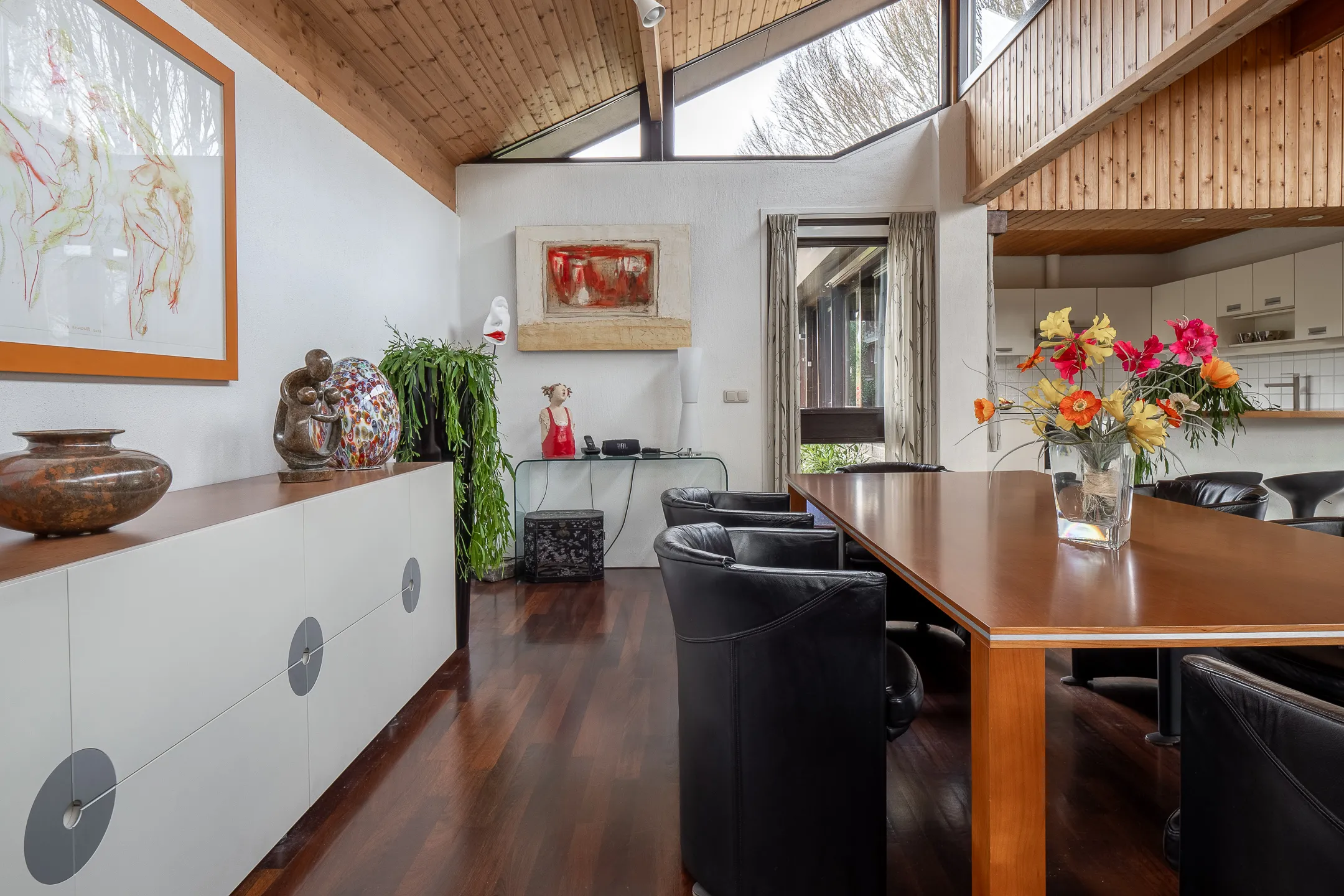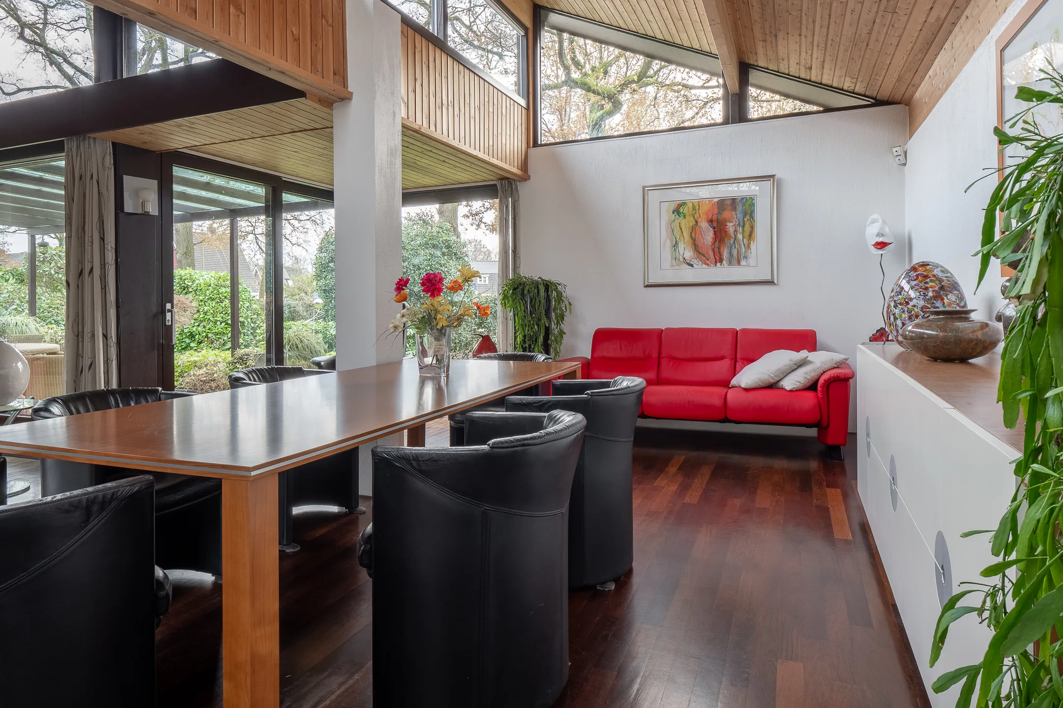 Aansluitend in stijl aangebouwde eetkamer met terrasdeur naar een luwte terras met pergola.