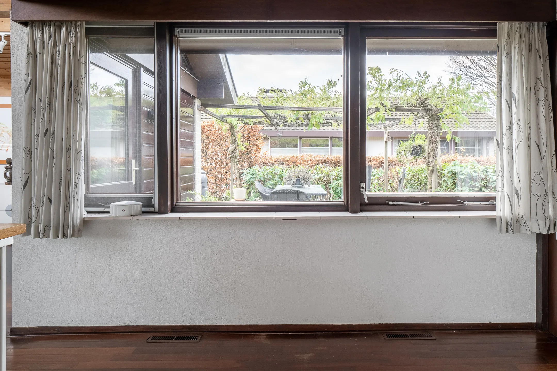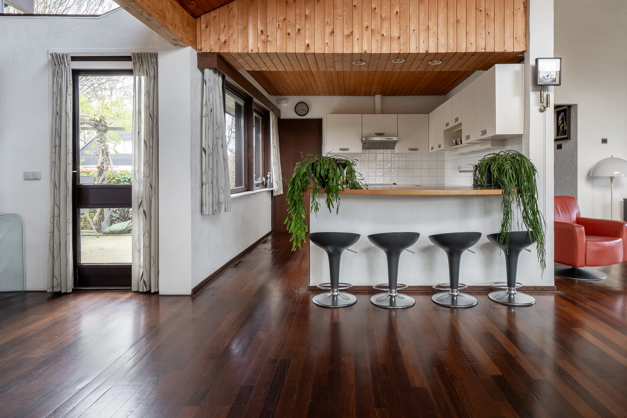 Vanuit de living geeft een schuifpui toegang tot het fijne zonneterras op zuid, voorzien van een terrasoverkapping met warmte werend glas.