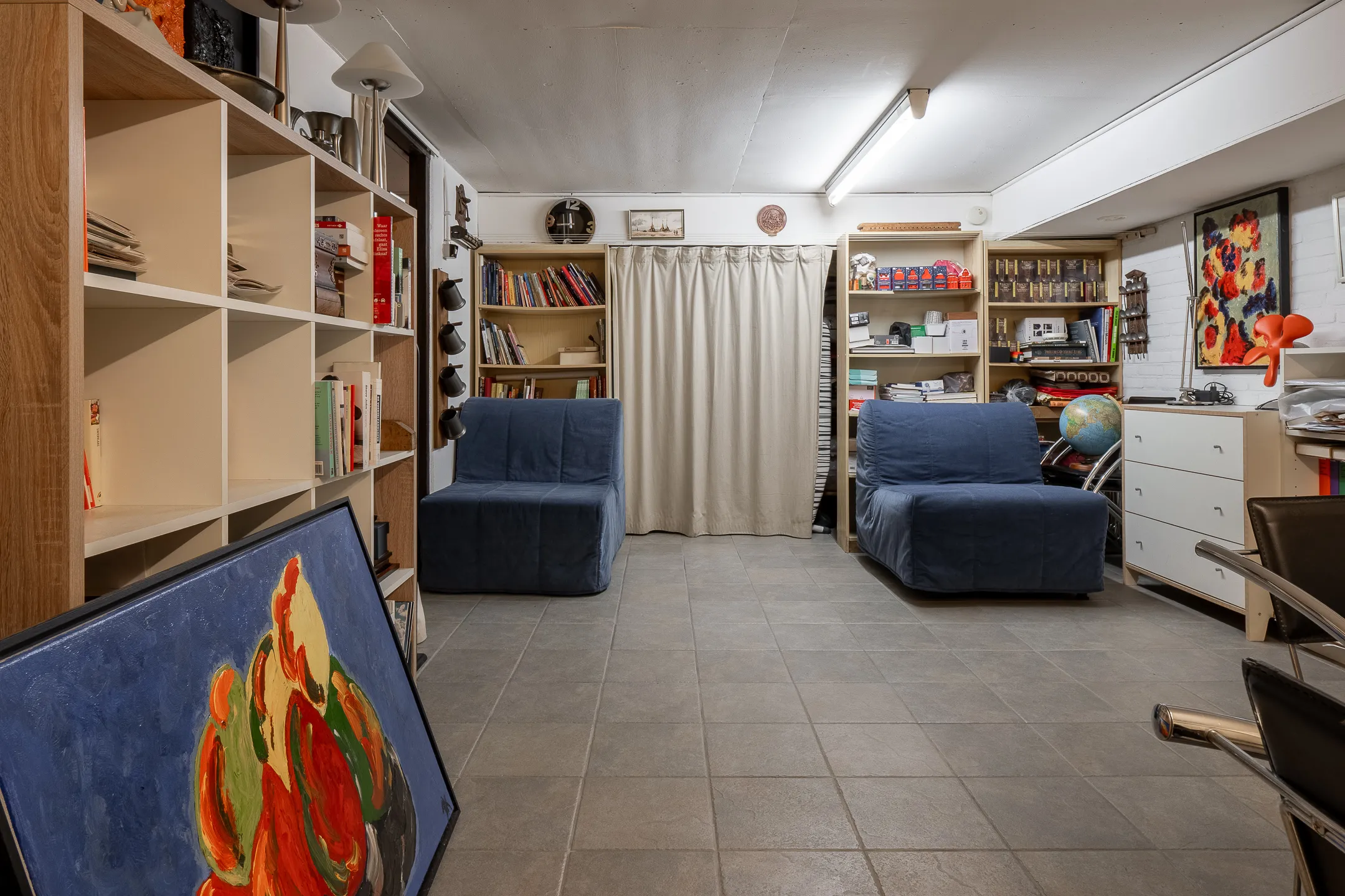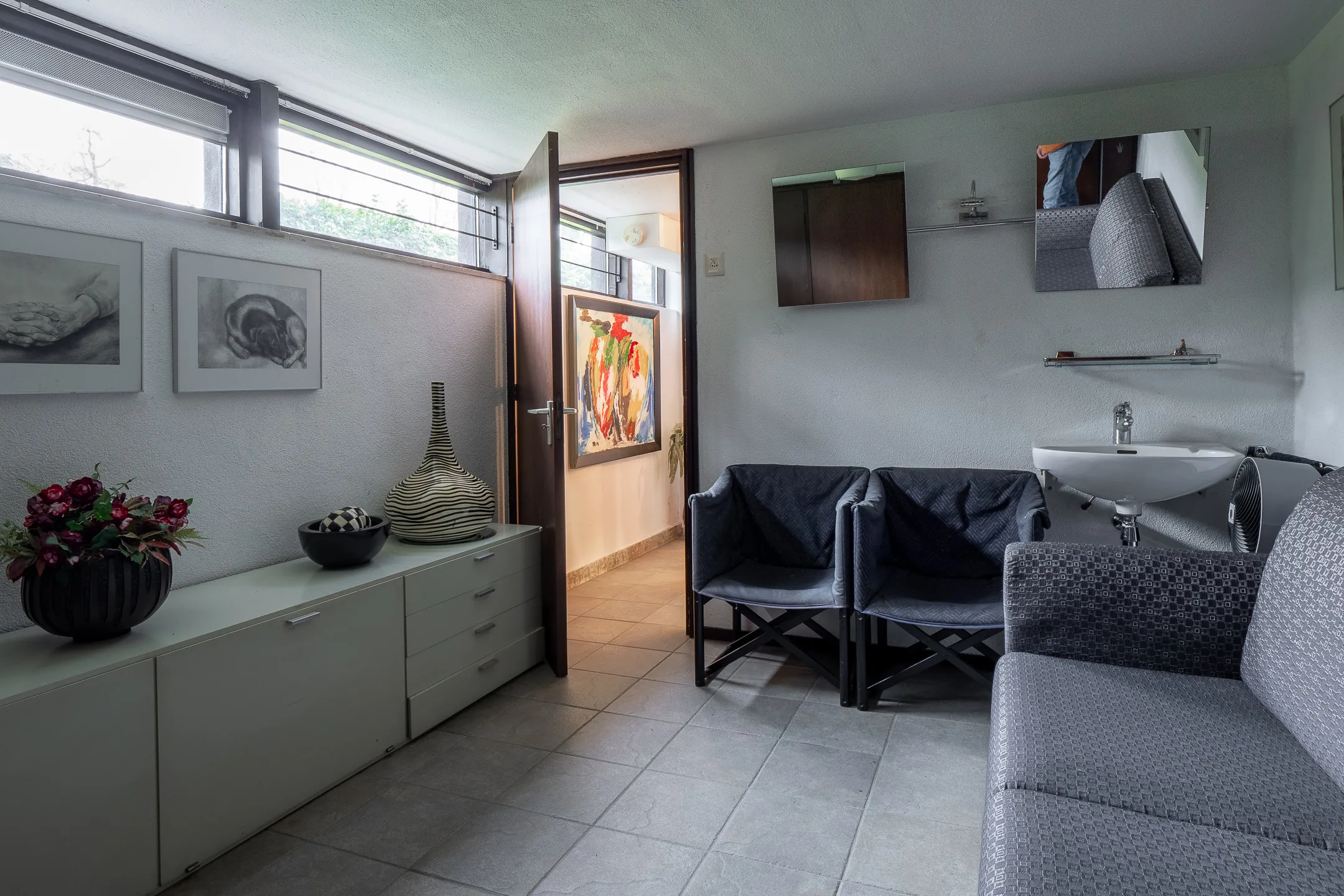 Souterrain: Hal met vaste kast, slaapkamer(3) met vaste wastafel en kastenwand, badkamer met wastafel, toilet en douchecabine, wasruimte met witgoedaansluitingen. Hobby- biljartkamer, technische ruimte, grote garage-berging met uitstortgootsteen.