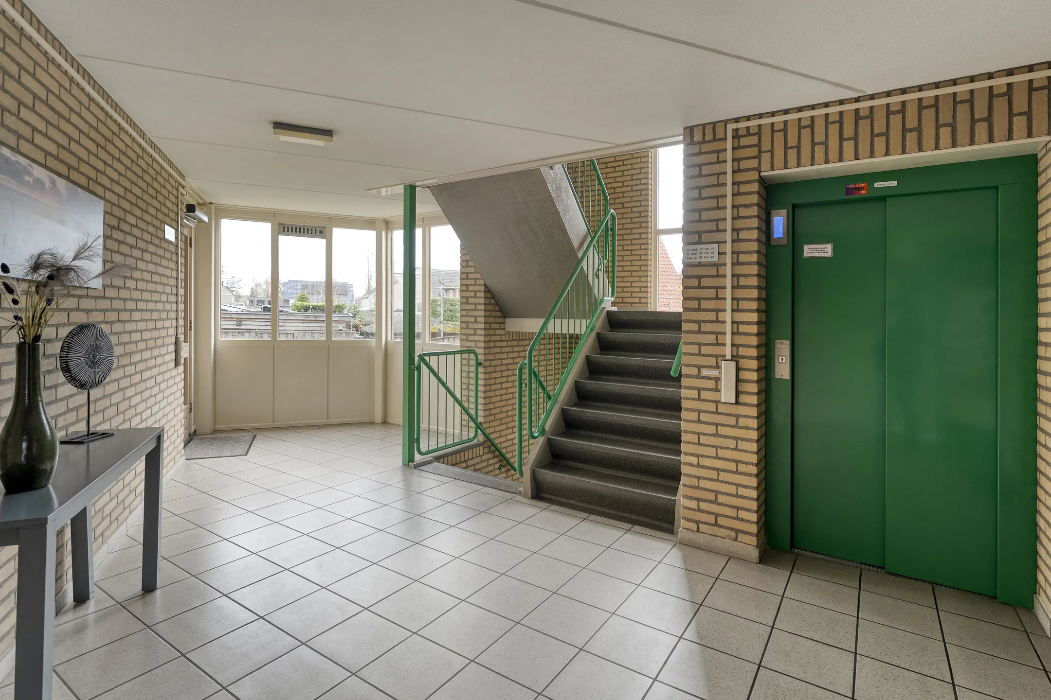 Begane grond: hal/entree met postbussen en intercominstallatie, centrale hal trapopgang met liften.