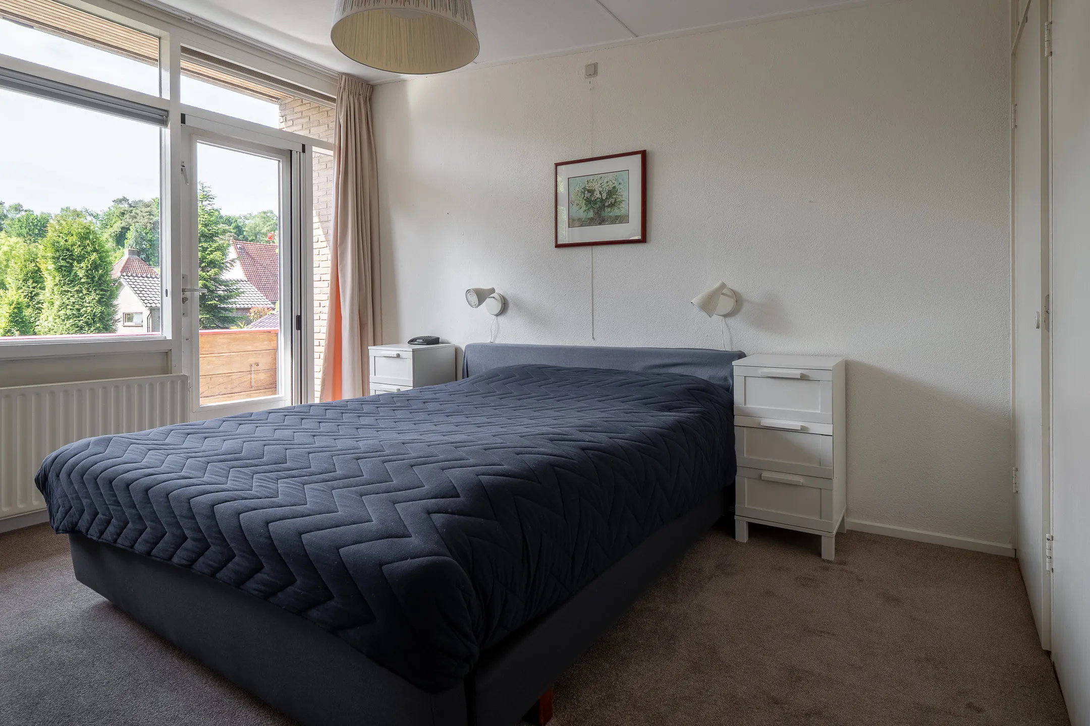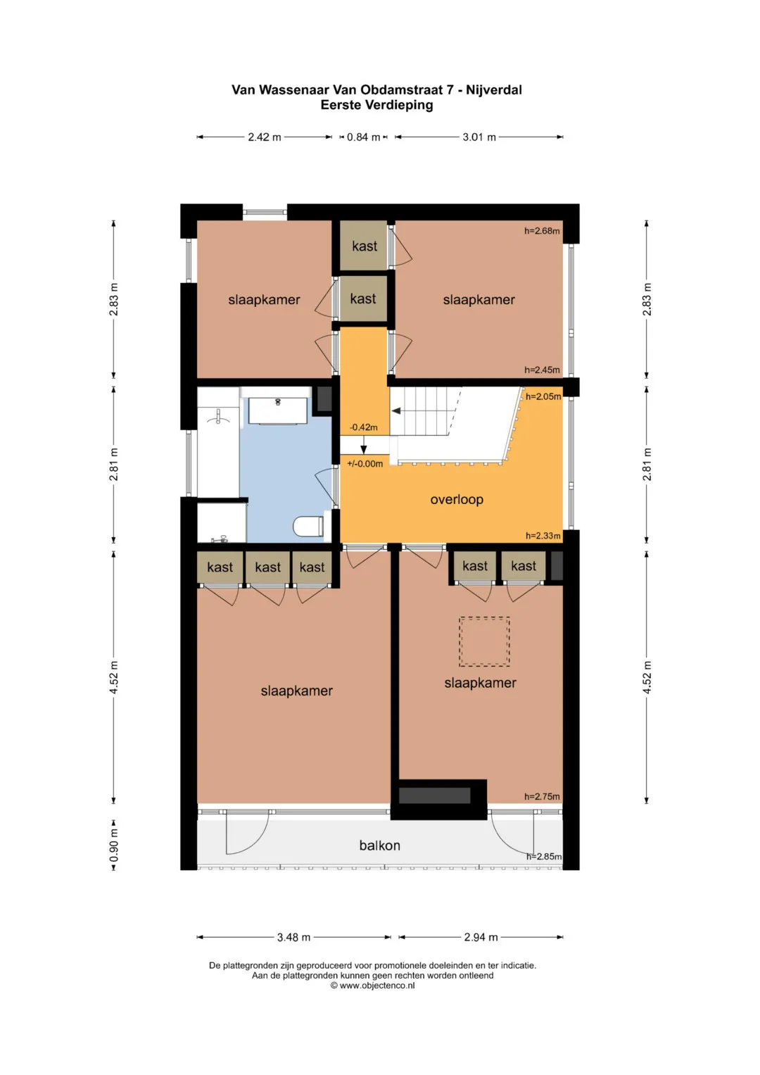 Eerste verdieping: overloop, slaapkamer (1) vaste kasten en toegang tot balkon, slaapkamer (2) vaste kasten en toegang tot balkon, slaapkamer (3) met vaste kast, slaapkamer (4) met wastafel en vaste kast.