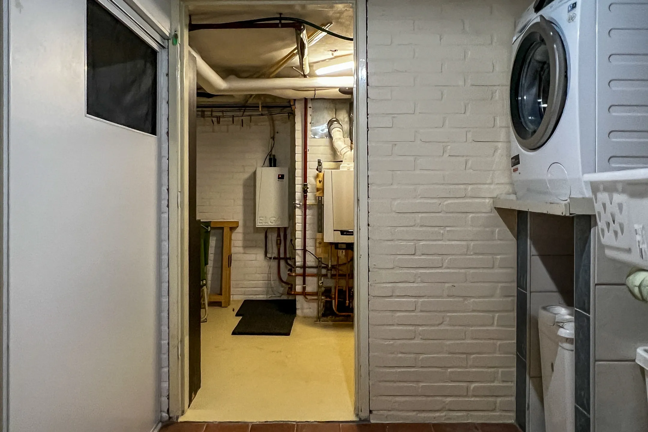 Kelder: hal met vaste kast, tussenruimte met wasgelegenheid, technische ruimte