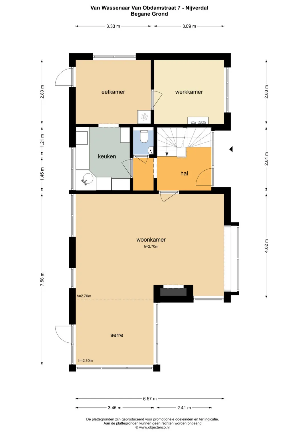 Begane grond: hal/entree met garderobenis, wandtoilet met fontein, sfeervolle woonkamer met aangebouwde tuingerichte serre, keuken v.v. inbouwapparatuur, eetkamer, multifunctionele ruimte voor bijvoorbeeld kantoor of slaapkamer.