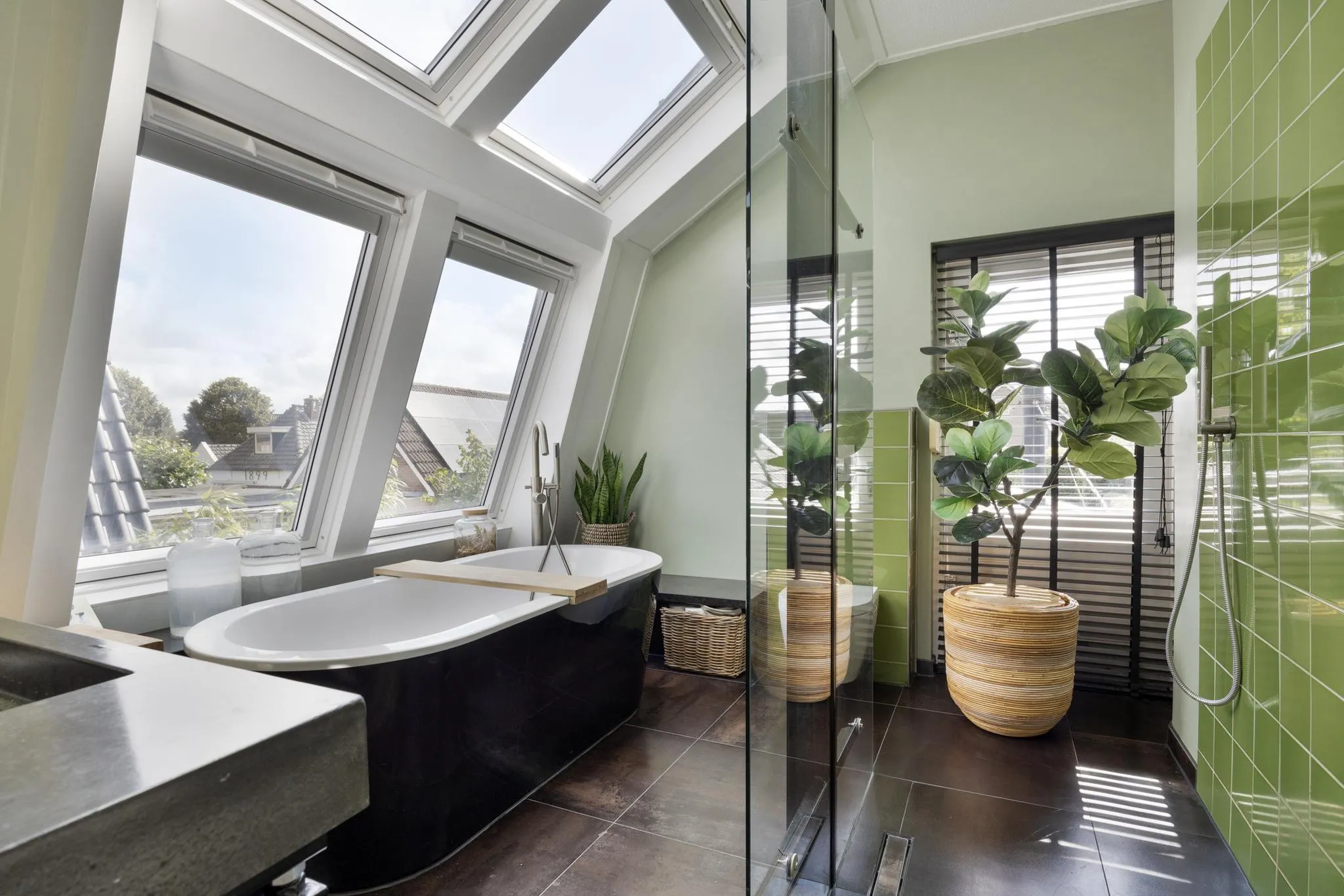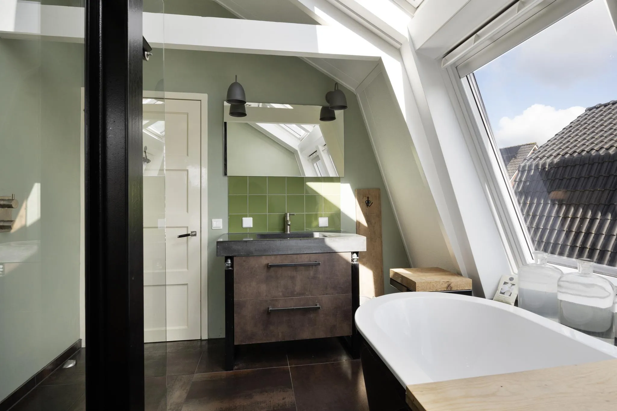 Eerste verdieping: overloop, slaapkamer (1) voorzien van airco en elektrisch bedienbare dakramen met zonwering, slaapkamer (2), slaapkamer (3), badkamer voorzien van doorloopdouche, toilet, wastafelmeubel en losstaand ligbad, elektrisch bedienbare dakramen met zonwering.