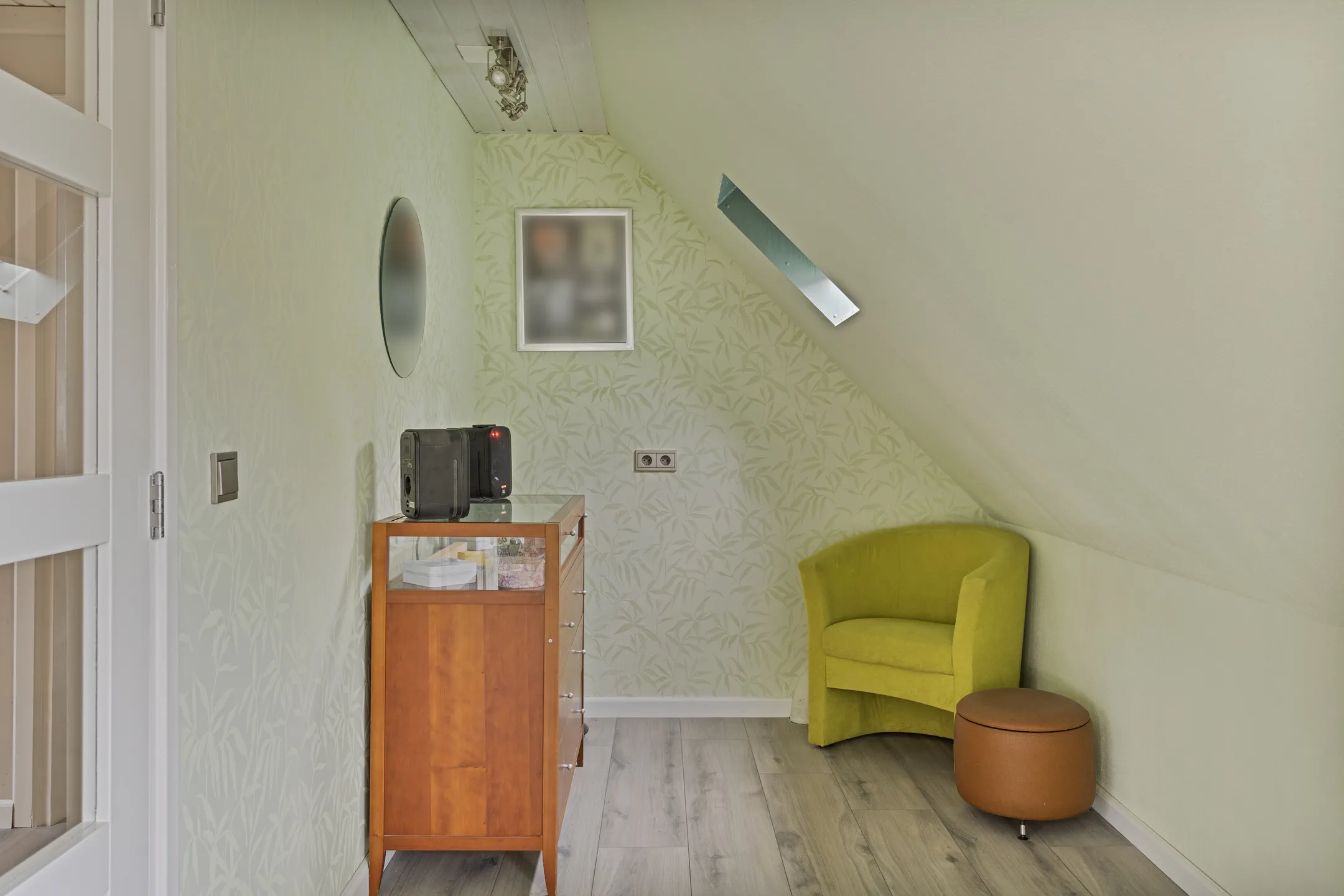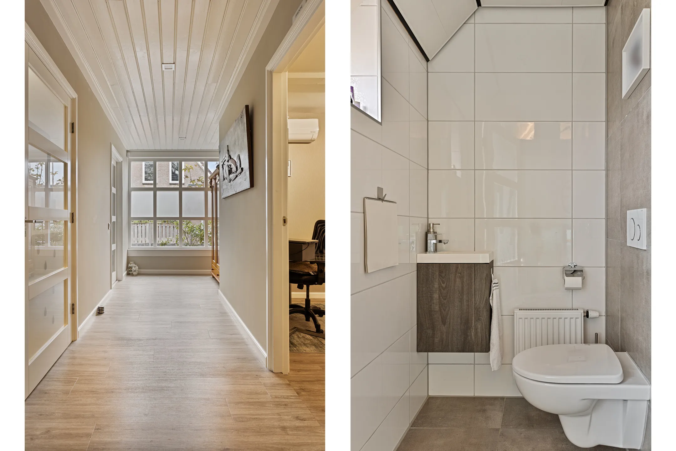 Begane grond: Hal/entree met trapopgang, wandtoilet met fontein, comfortabel thuiskantoor, gezellige woonkamer met schouw en kenmerkend balkenplafond, halfopen keuken met aansluitend eet-/tuinkamer v.v. tuindeuren, hal, slaapkamer (1) met inloopkast, luxe badkamer met instap regen-/handdouche, dubbele wastafelmeubel en wandtoilet, slaapkamer (2), bijkeuken, achterhal met doorloop naar bijgebouw v.v. dubbele deur aan voorzijde, achterdeur naar halfopen gereedschapsschuur en trapopgang naar separate bergzolder v.v. buitenluik.