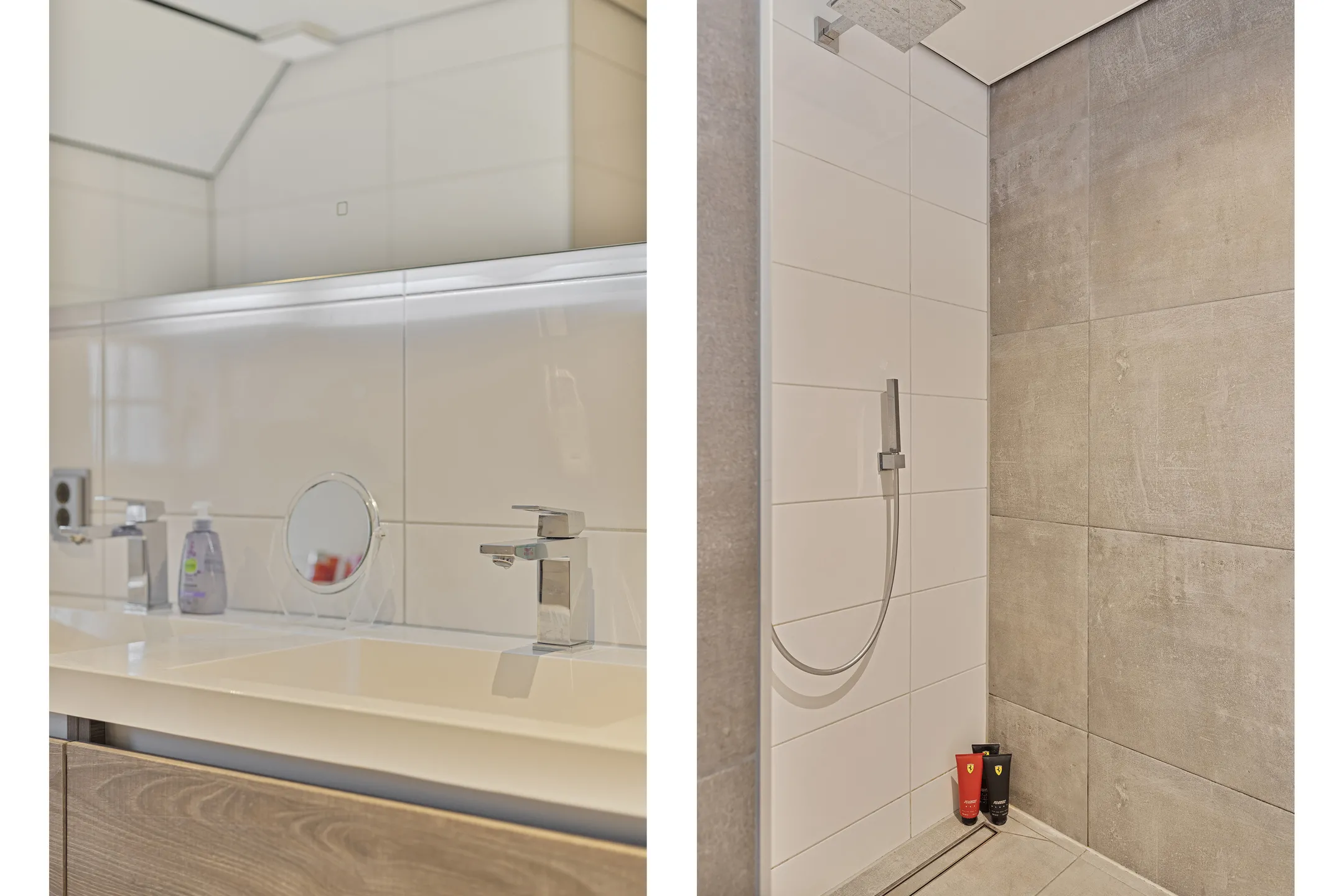- Badkamervoorzieningen Toilet, dubbele wastafel, wastafelmeubel, inloopdouche, vloerverwarming